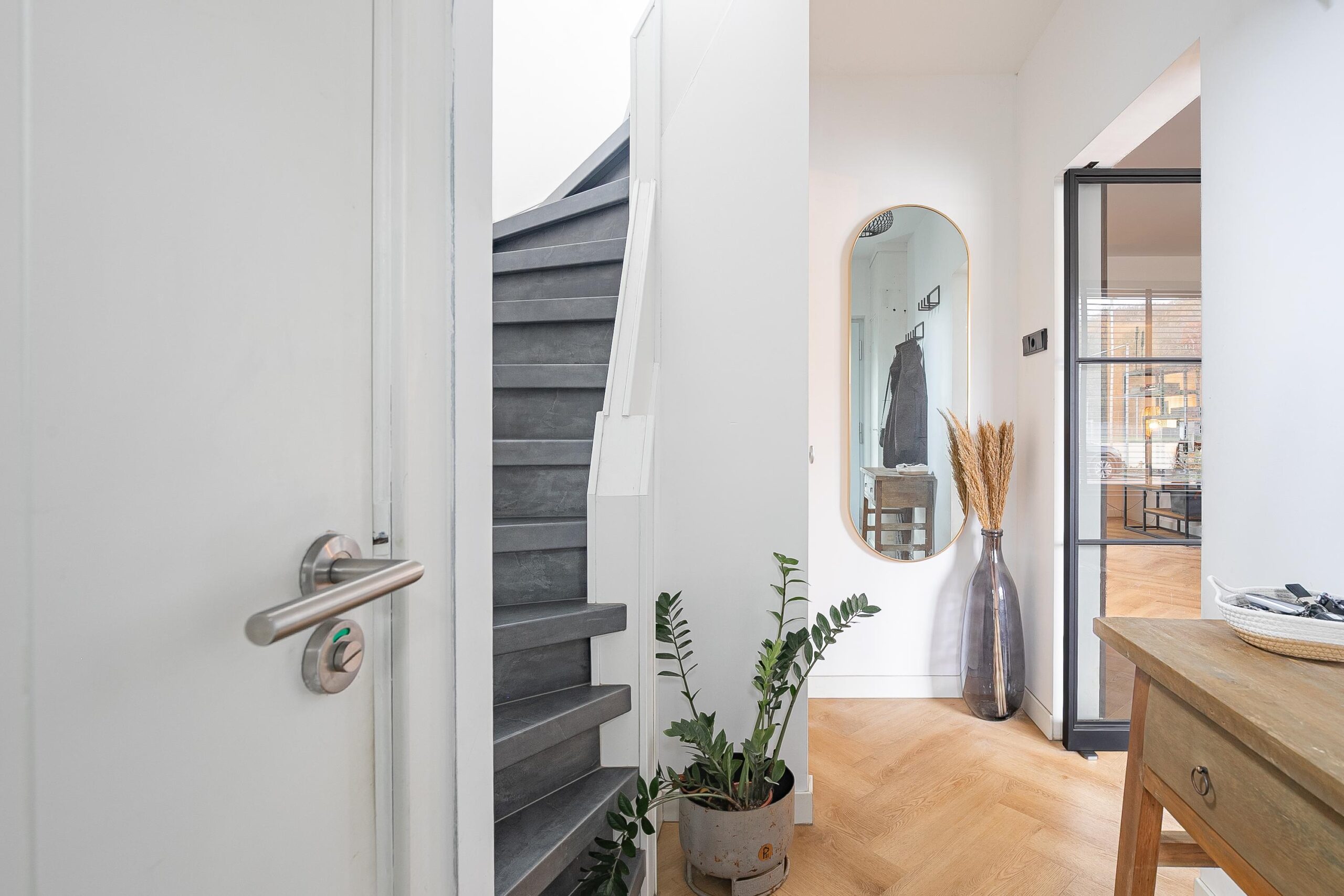 Via de fraai aangelegde voortuin en oprit bereikt u de overdekte entree. De ruime ontvangsthal is voorzien van een garderobe, moderne meterkast en een stijlvolle trap naar de eerste verdieping. Daarnaast bevindt zich hier het volledig betegelde, vrijhangende toilet met fonteintje en een raam voor natuurlijke lichtinval.
