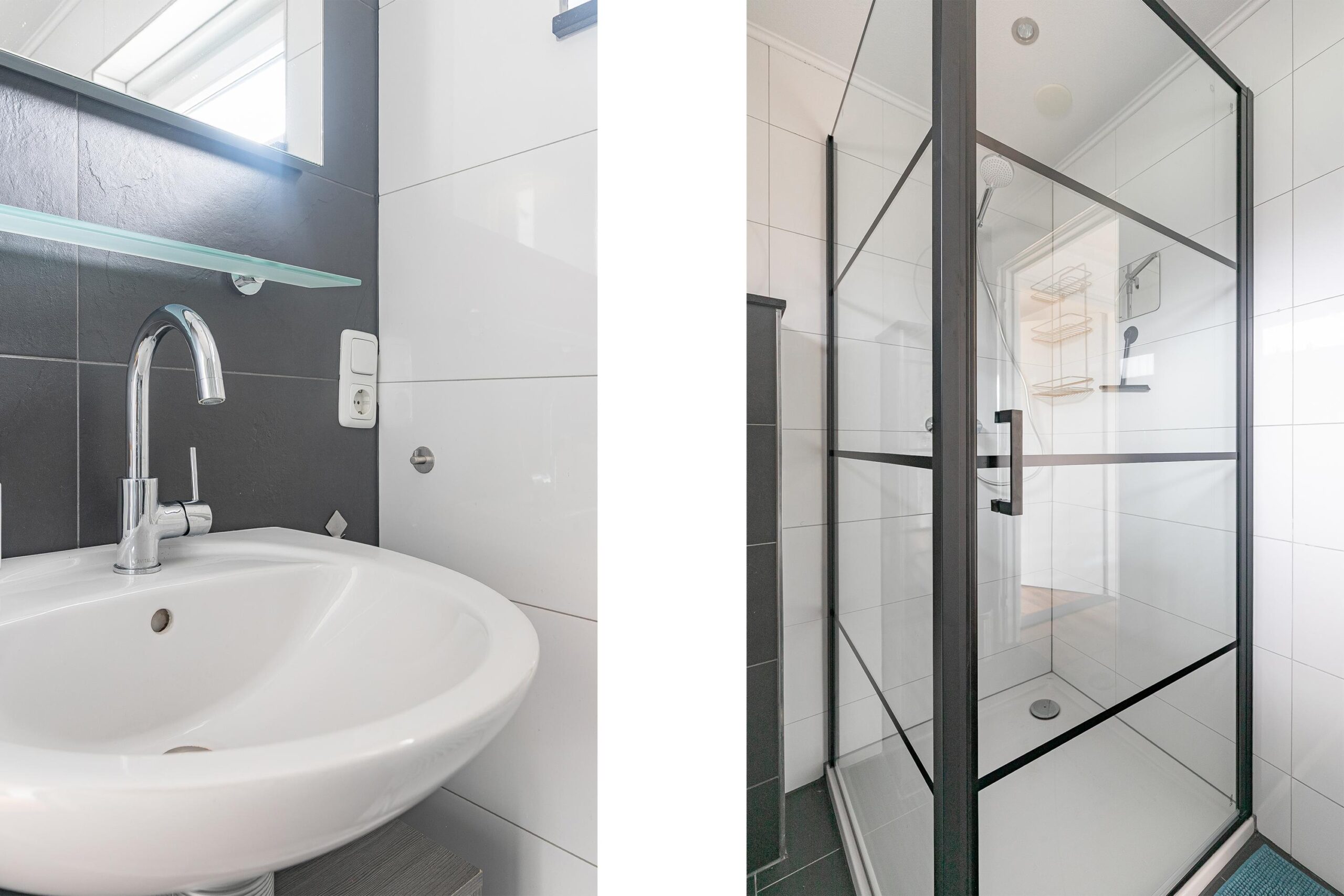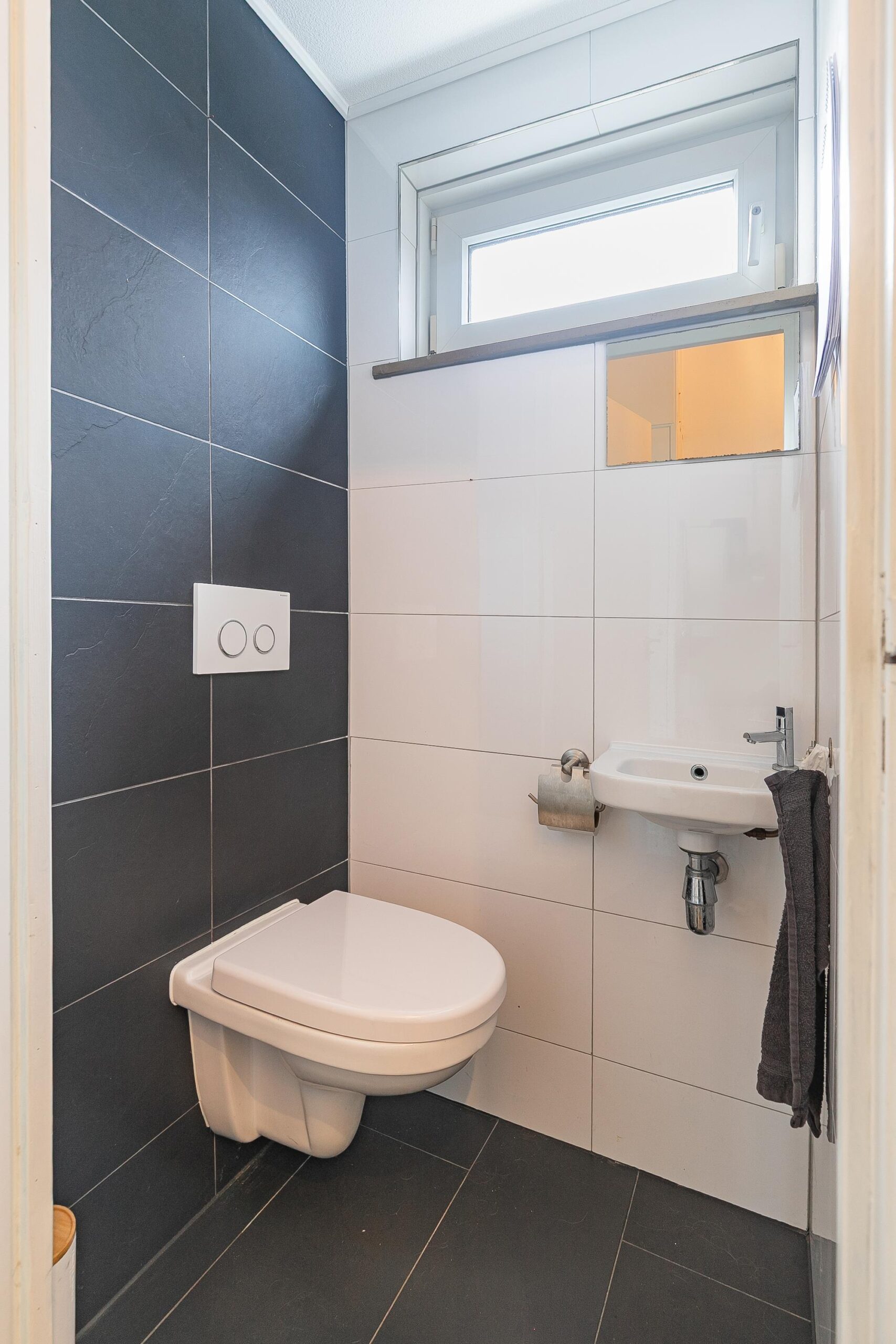 De volledig betegelde, tijdloze badkamer is ingericht met een inloopdouche, tweede vrijhangend toilet, wastafel, handdoekradiator en een raam voor daglicht en natuurlijke ventilatie.