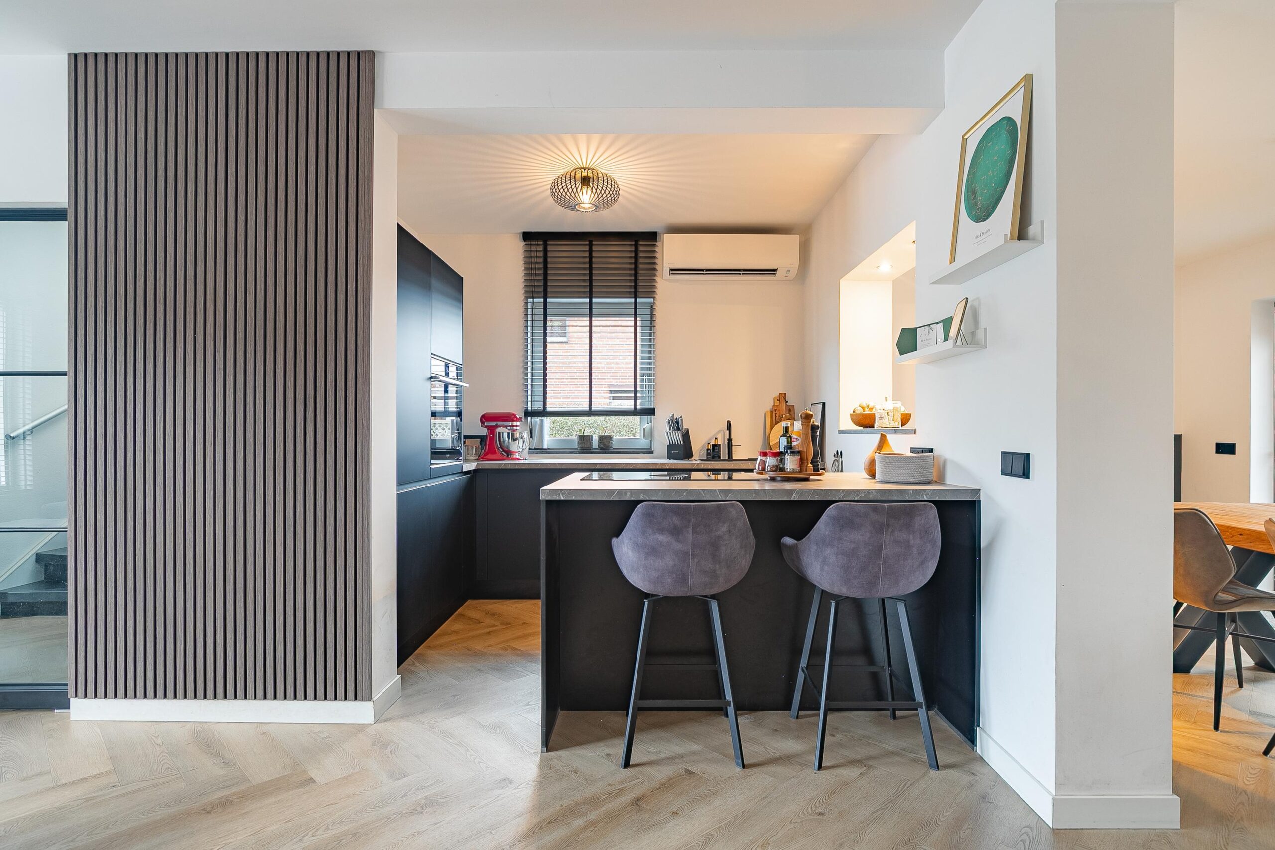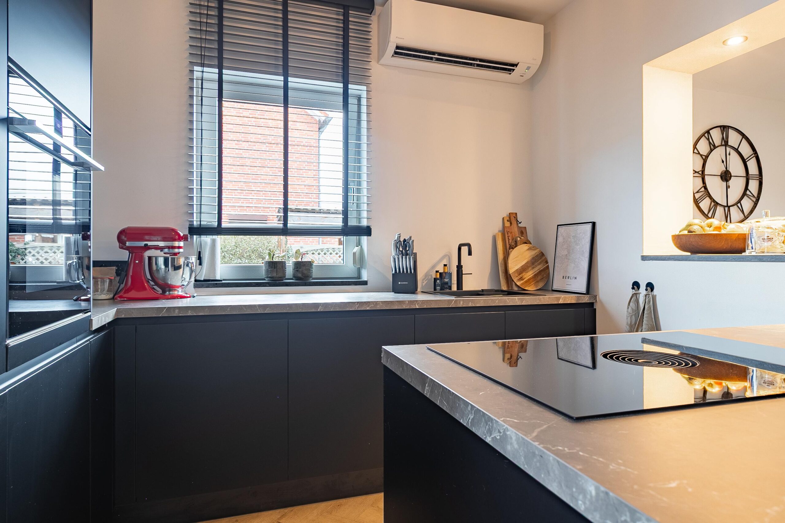 De open leefkeuken (2022) is uitgevoerd in matzwart, volledig greeploos en uitgerust met hoogwaardige inbouwapparatuur: een Bora-inductiekookplaat met geïntegreerde afzuiging (koolstoffilter), een oven, koelkast, vaatwasser en een Quooker. In de lichte aanbouw is meer dan voldoende ruimte voor een royale 8-persoons eettafel, waardoor keuken, eetgedeelte en overkapping prachtig met elkaar in verbinding staan.