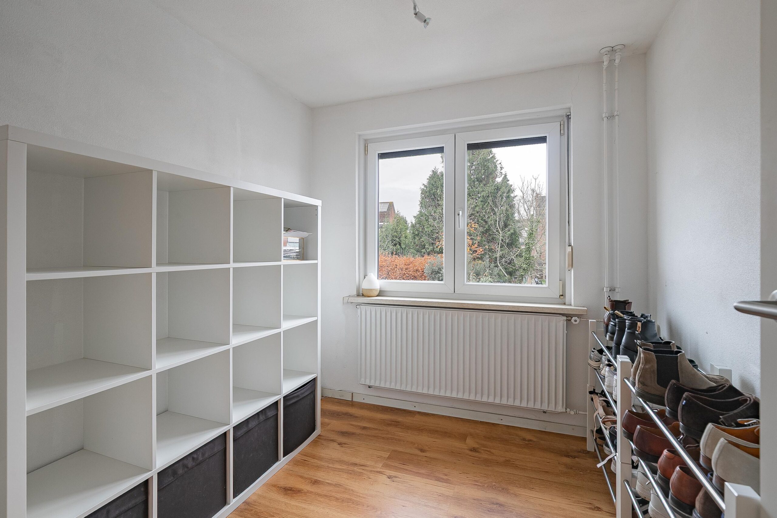 De overloop geeft toegang tot drie keurig afgewerkte slaapkamers, voorzien van moderne laminaatvloeren, wanden in spuitwerk en rolluiken.
