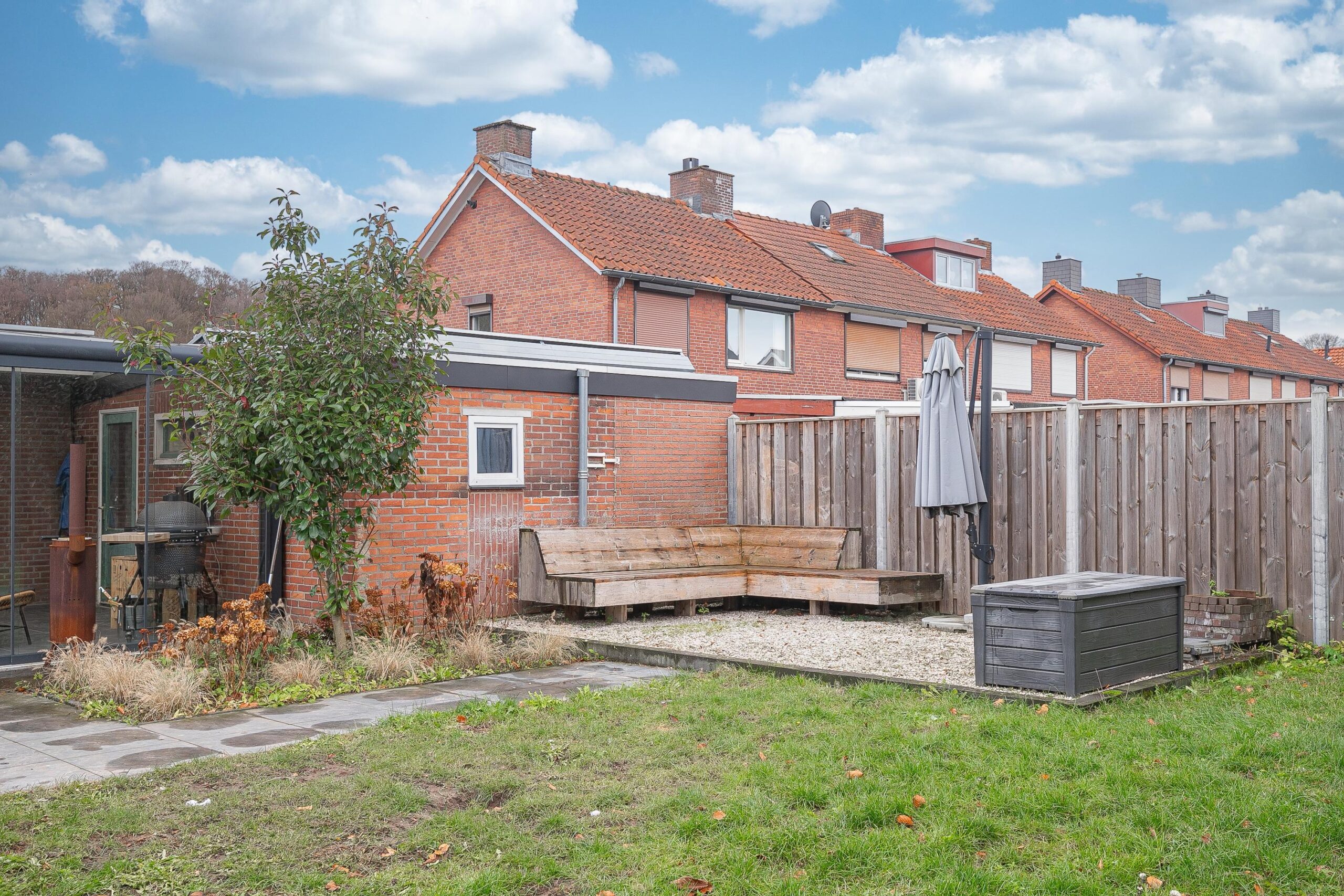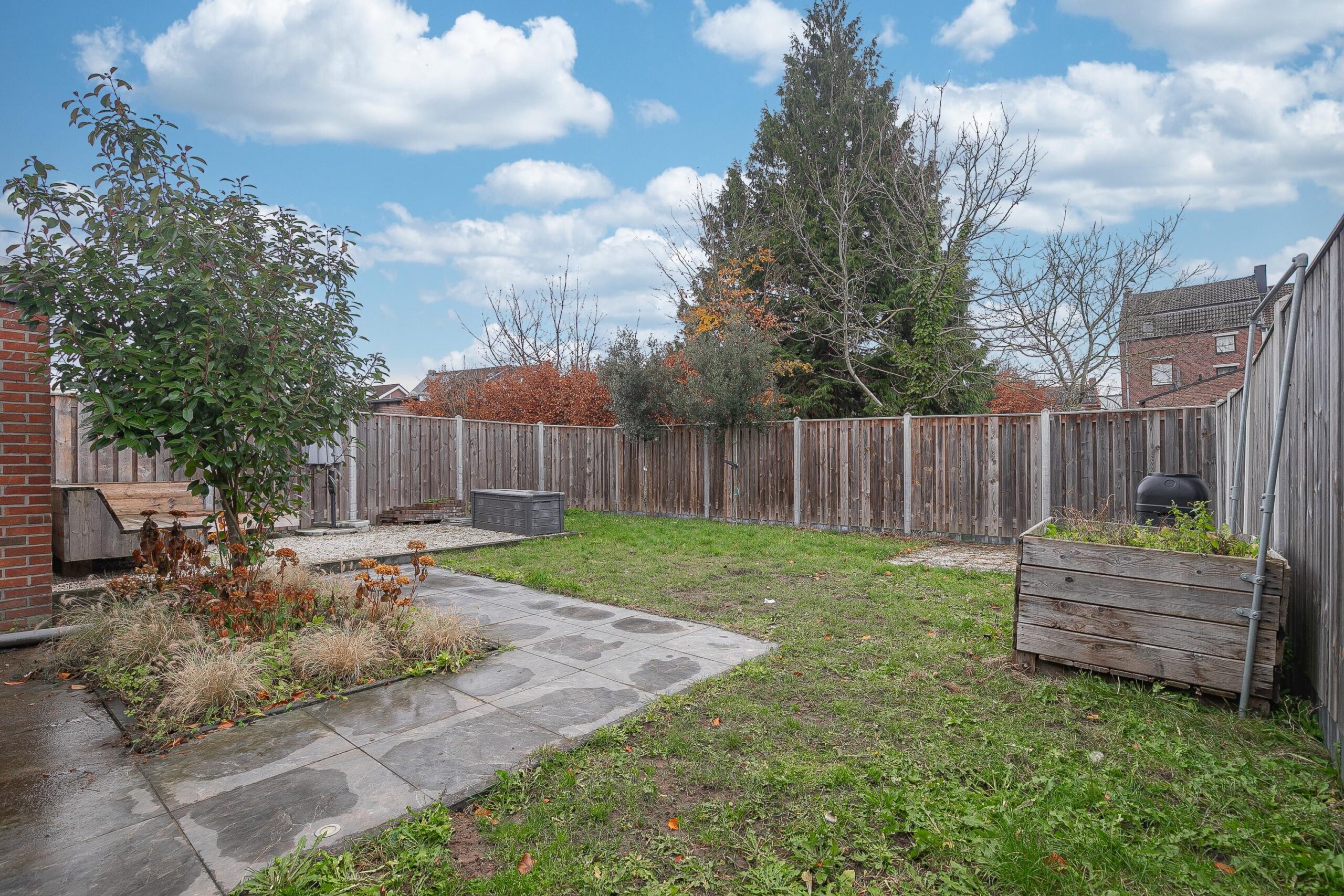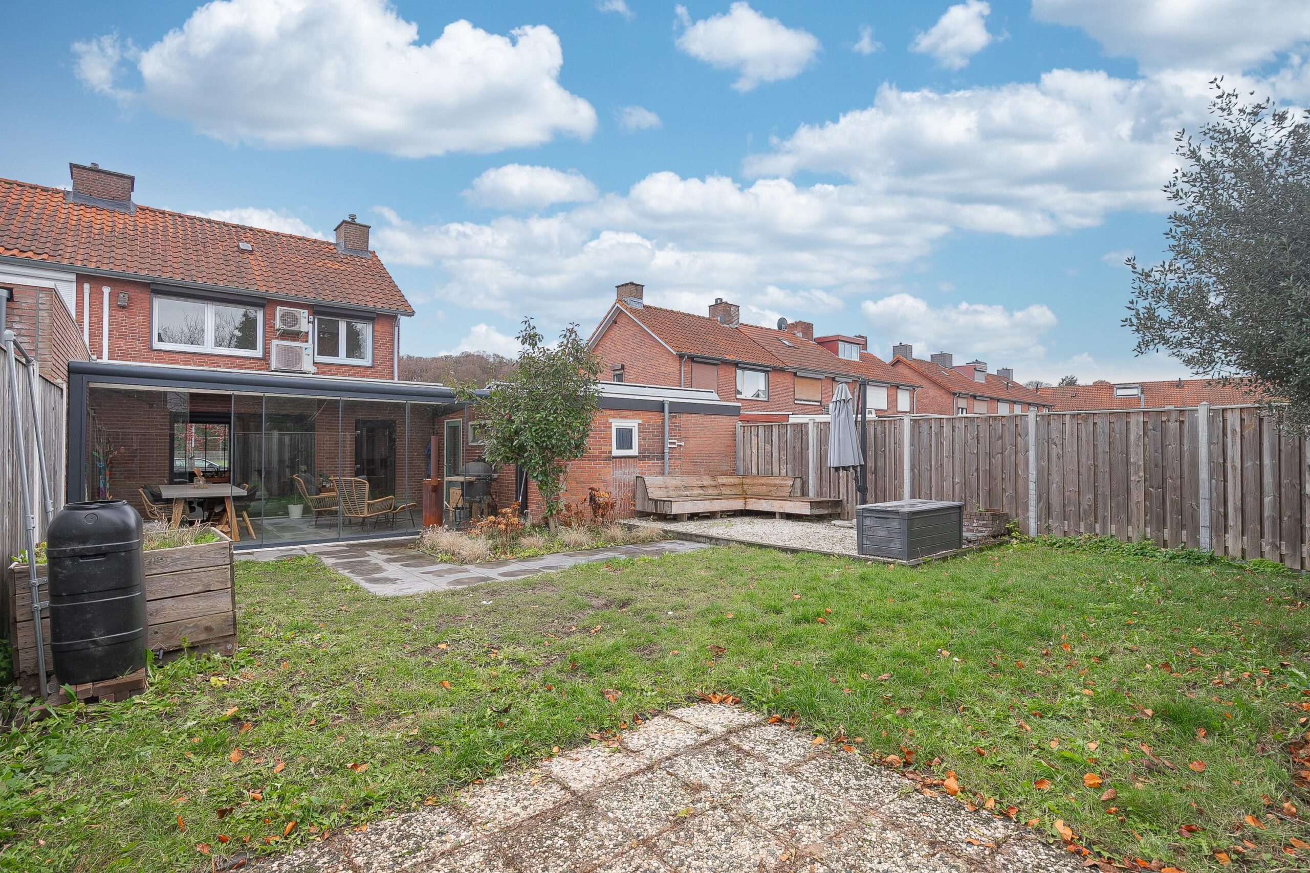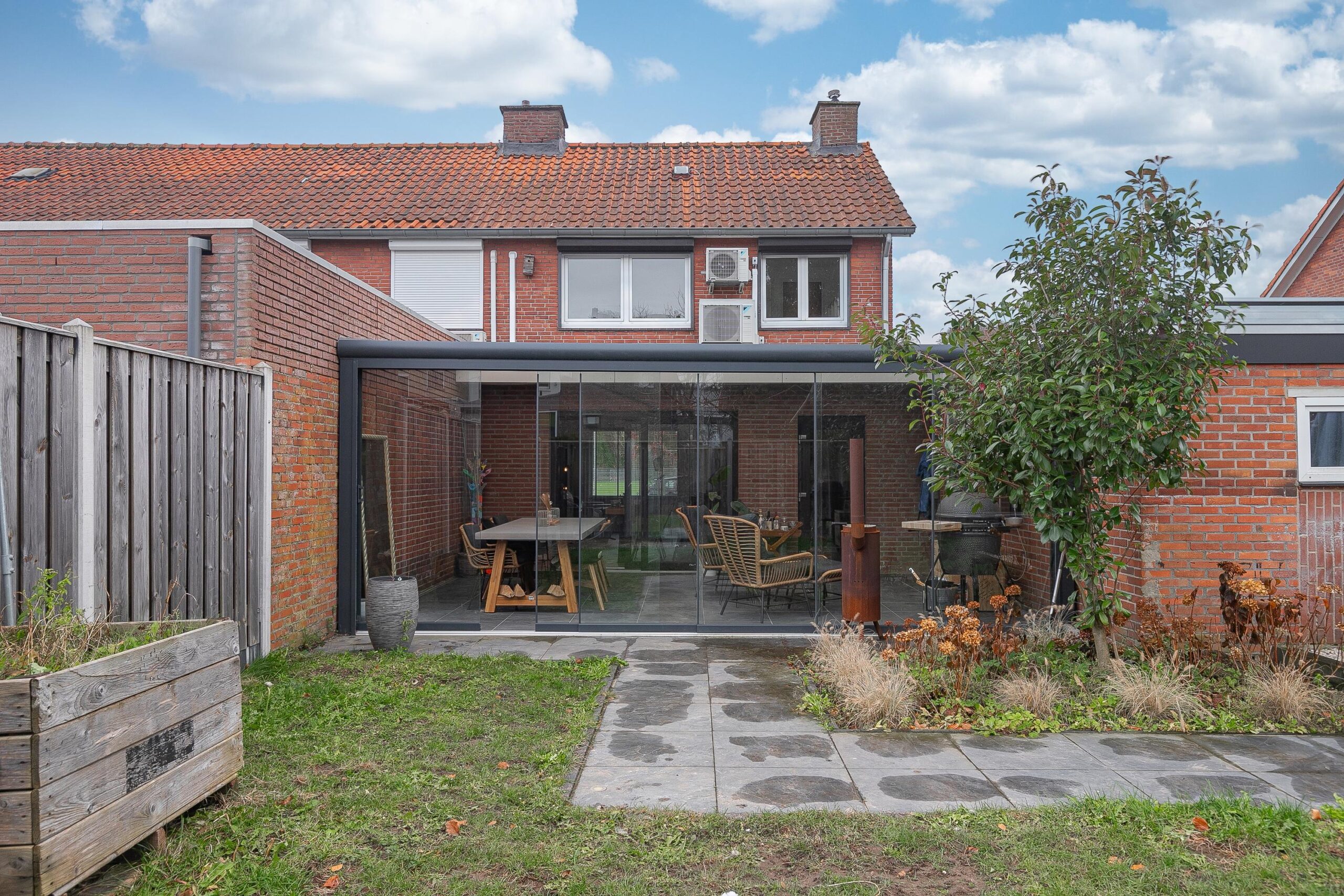 De tuin is geheel omsloten met recent geplaatste schuttingen, een speelgazon en beklinkerd en overdekt terras waar men het gehele jaar door kan genieten van de tuin.