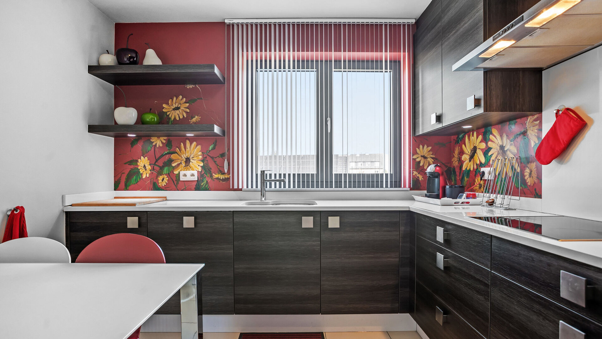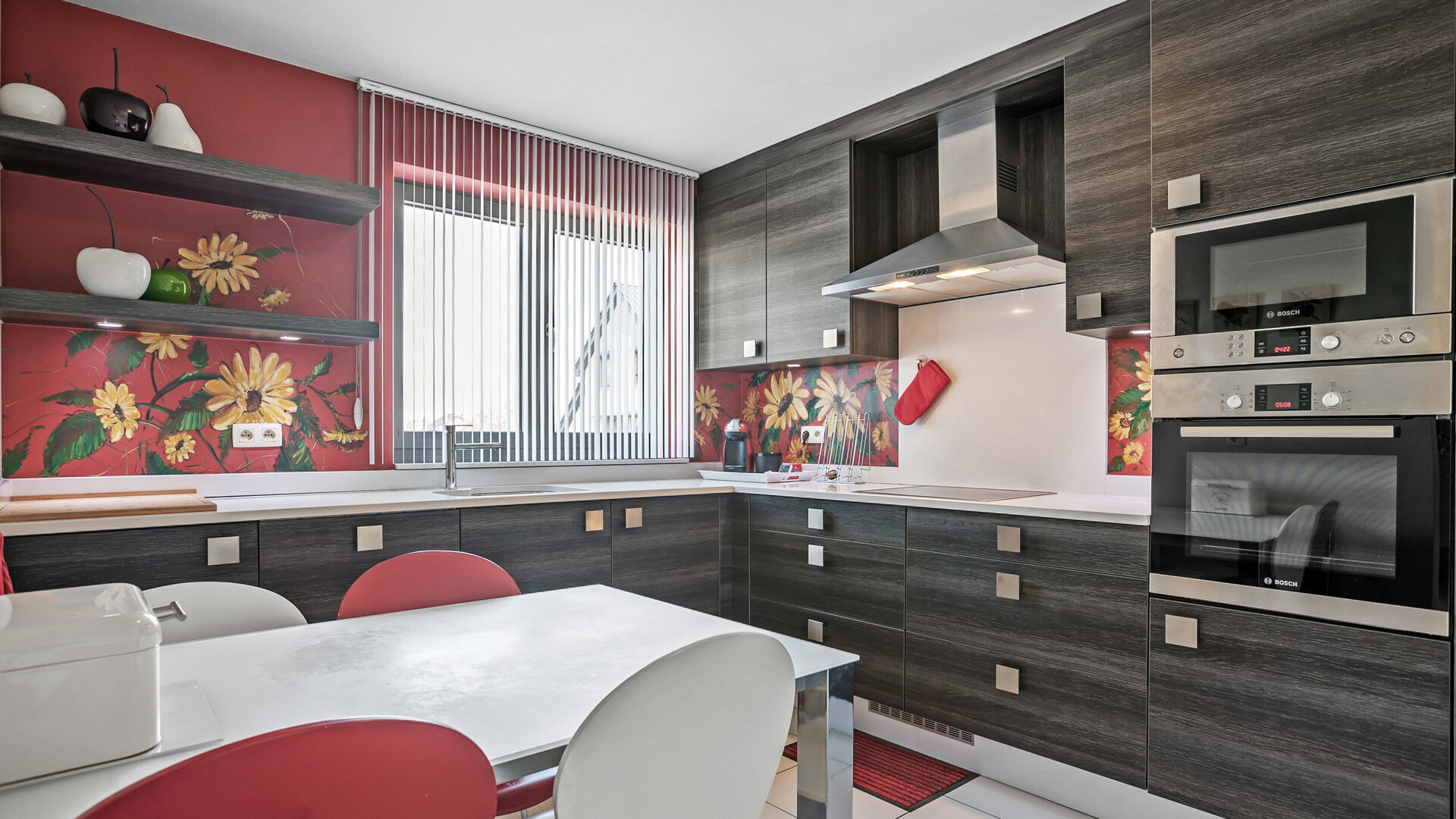 De open keuken is volledig ingericht met kwalitatieve toestellen en een stijlvol stenen werkblad. Ze beschikt over een inductiekookplaat, dampkap, spoelbak, vaatwasser, combi-oven en magnetron.