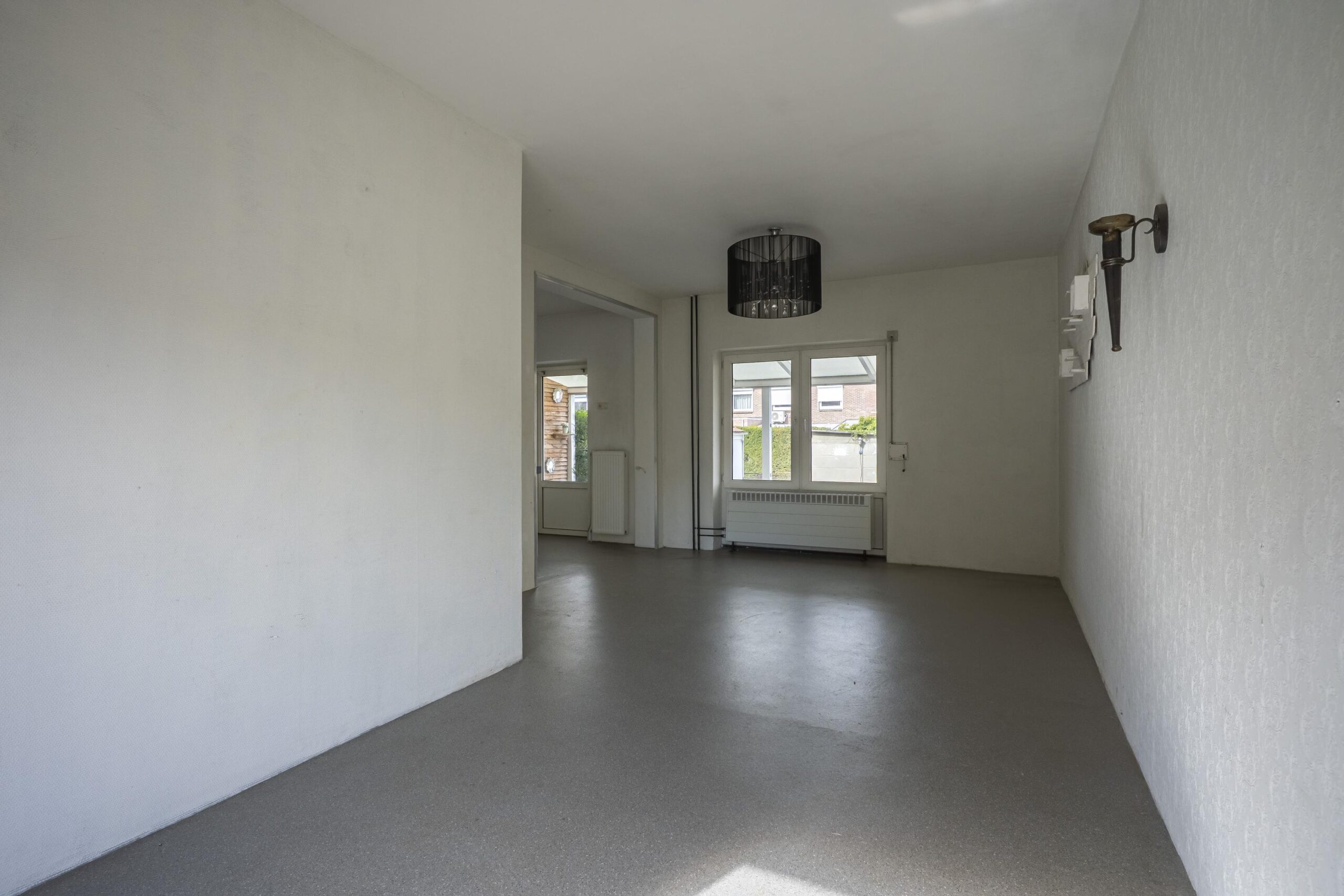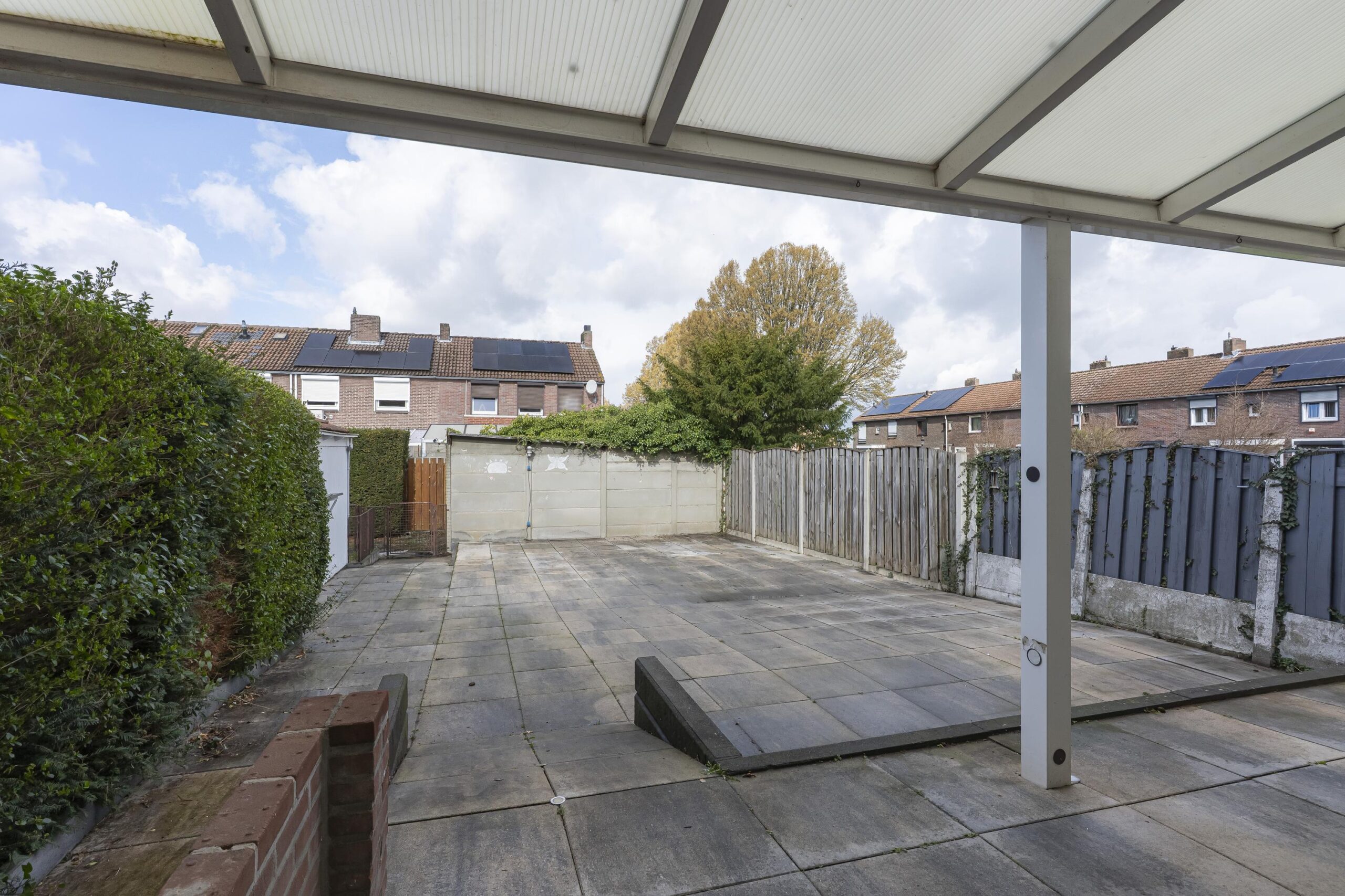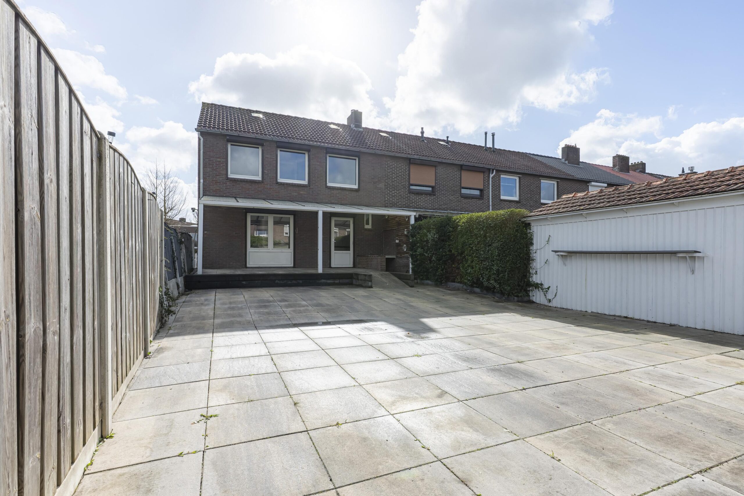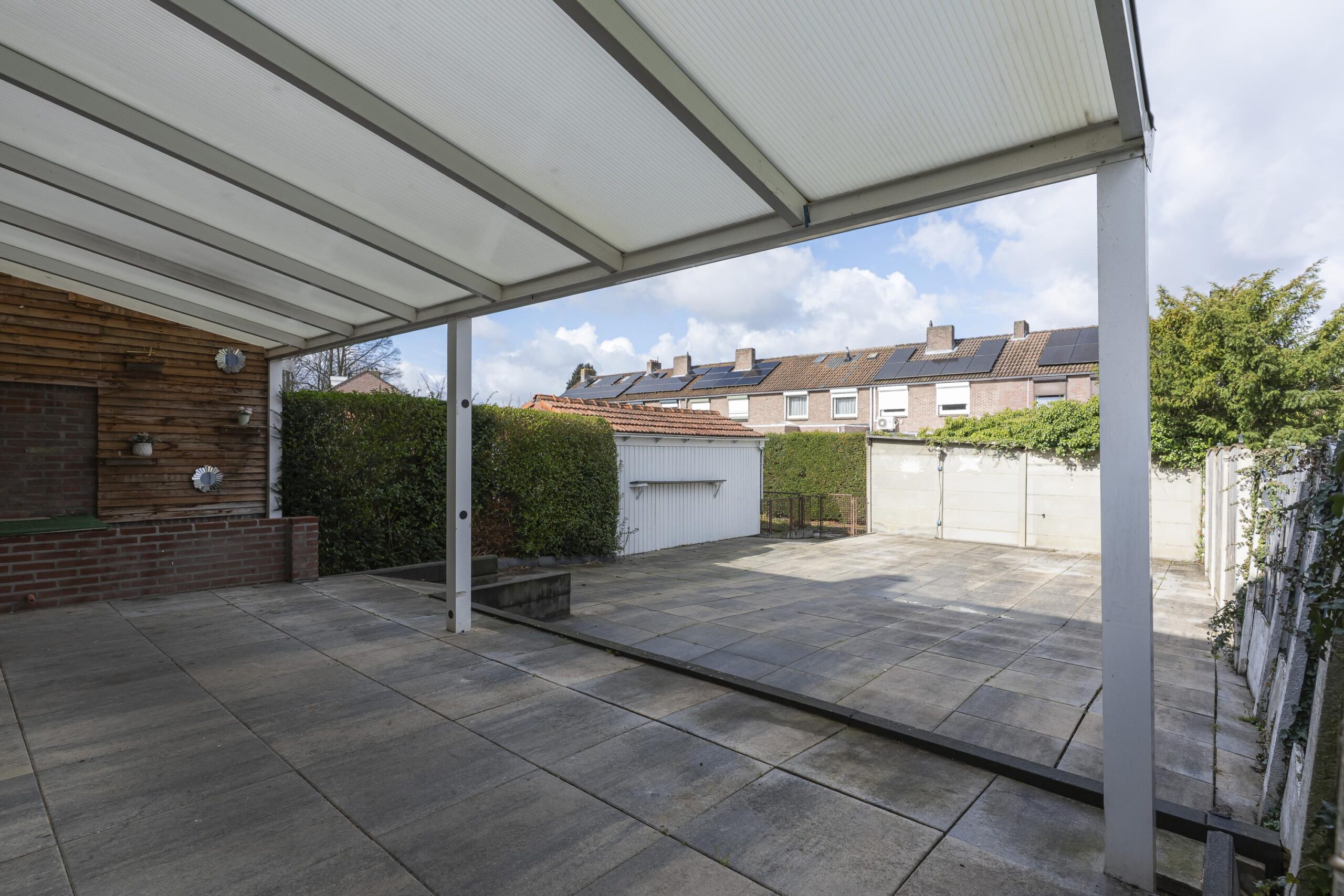 Terras met royale terrasoverkapping. Diepe geheel betegelde tuin met zijingang met afsluitbare deur.