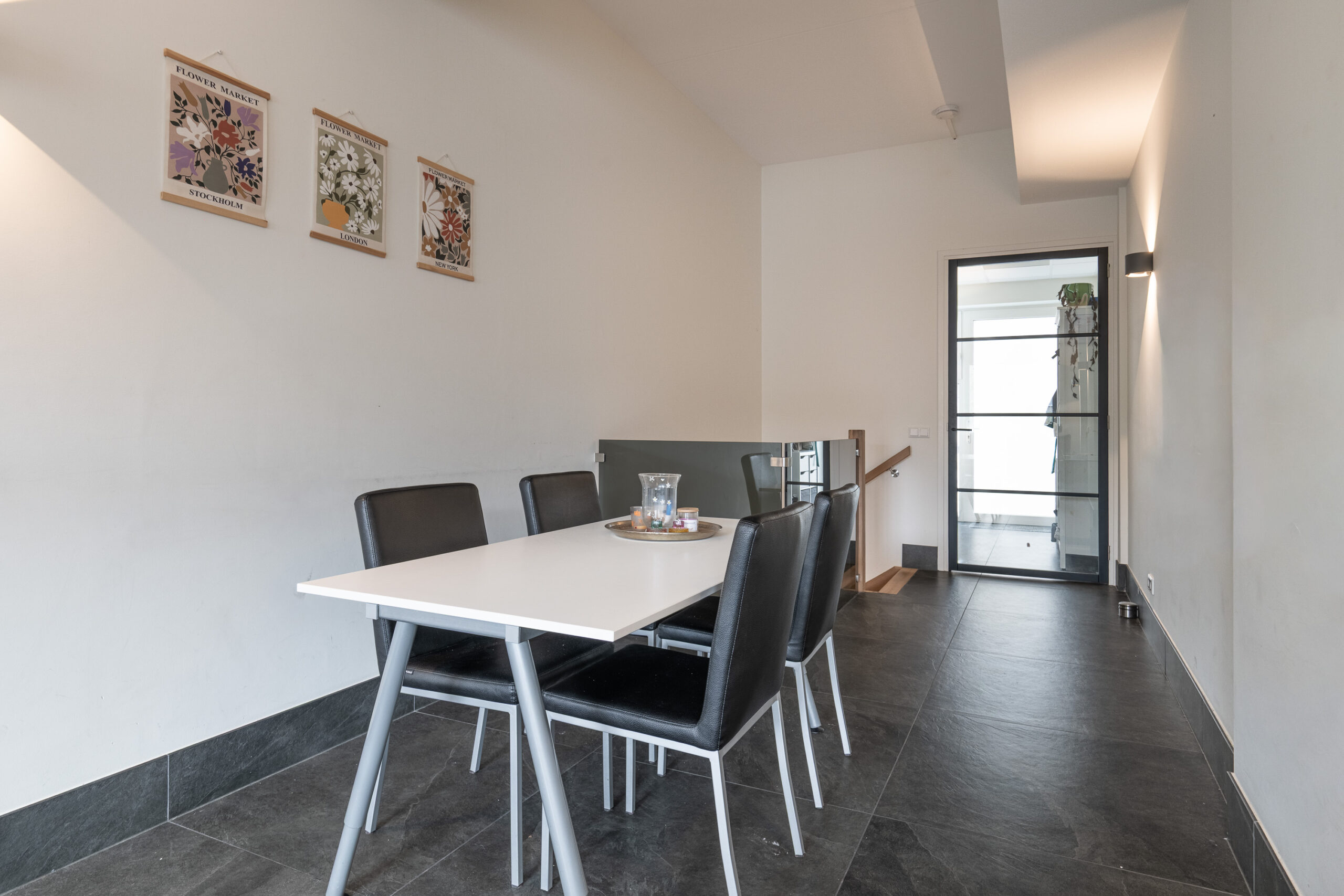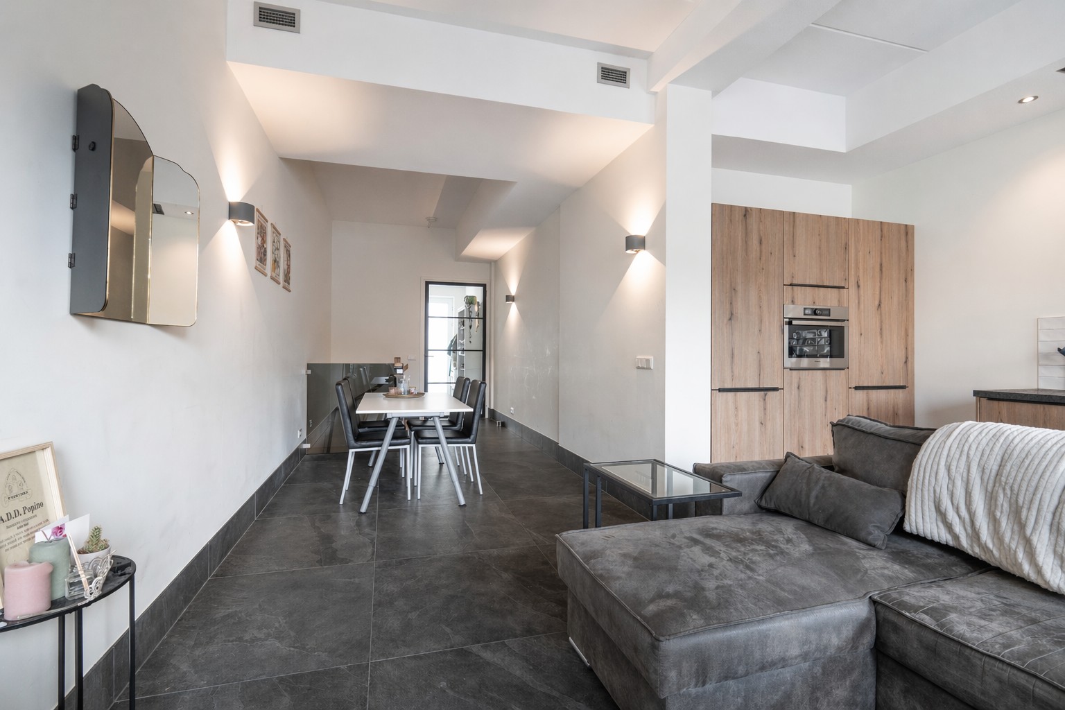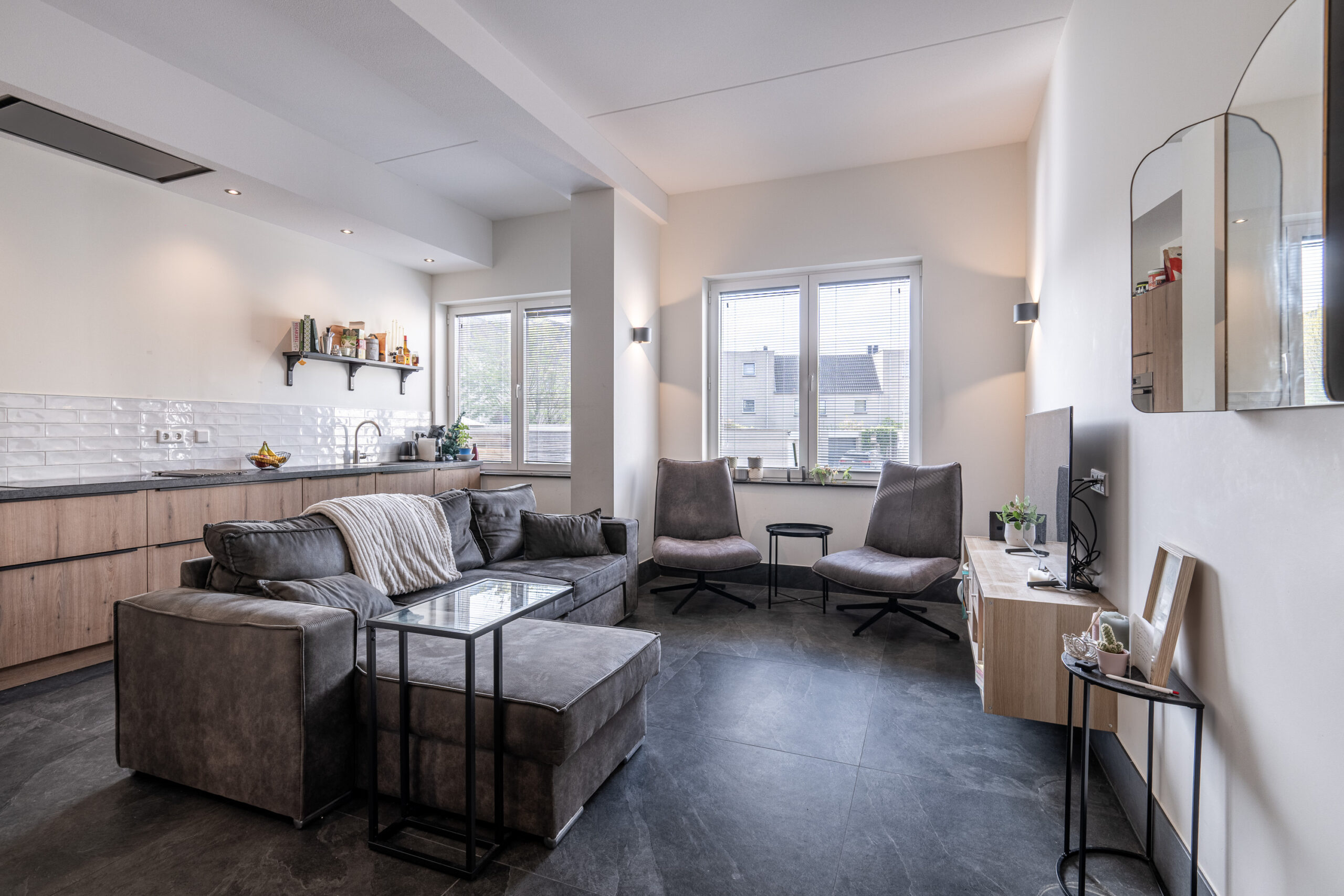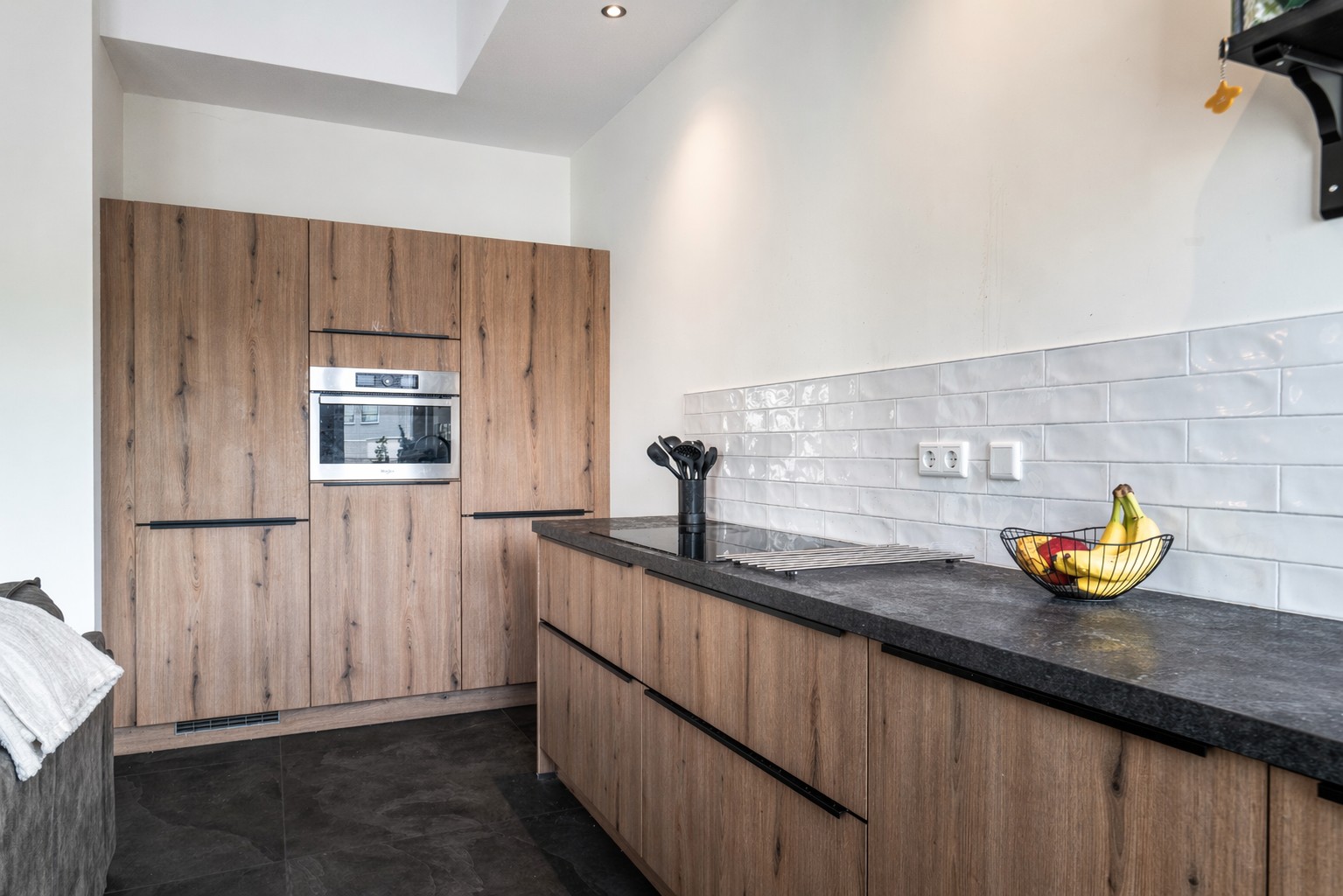 Mooie entree met toegang tot meterkast en toiletruimte. Middels grote glazen deur is er doorkijk en toegang tot de grote open leefruimte (totaal ca. 35 m²). De keuken en woonkamer staan met elkaar in verbinding en zijn voorzien van een prachtige tegelvloer met grote tegels. De grote keuken is uitgerust met koel-/ vriescombinatie, vaatwasser, combi oven, 4-pits inductiekookplaat en in het plafond geïntegreerde afzuiging.