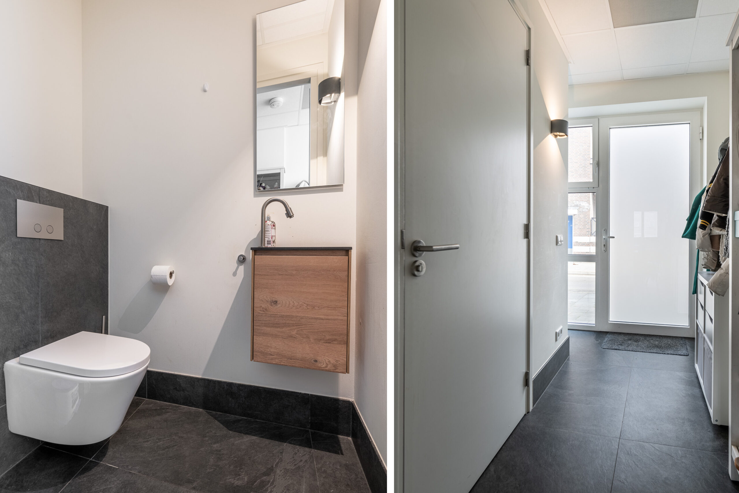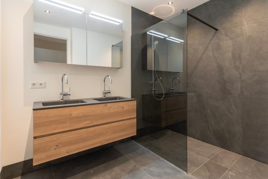 - Badkamervoorzieningen Dubbele wastafel, wastafelmeubel, inloopdouche, vloerverwarming