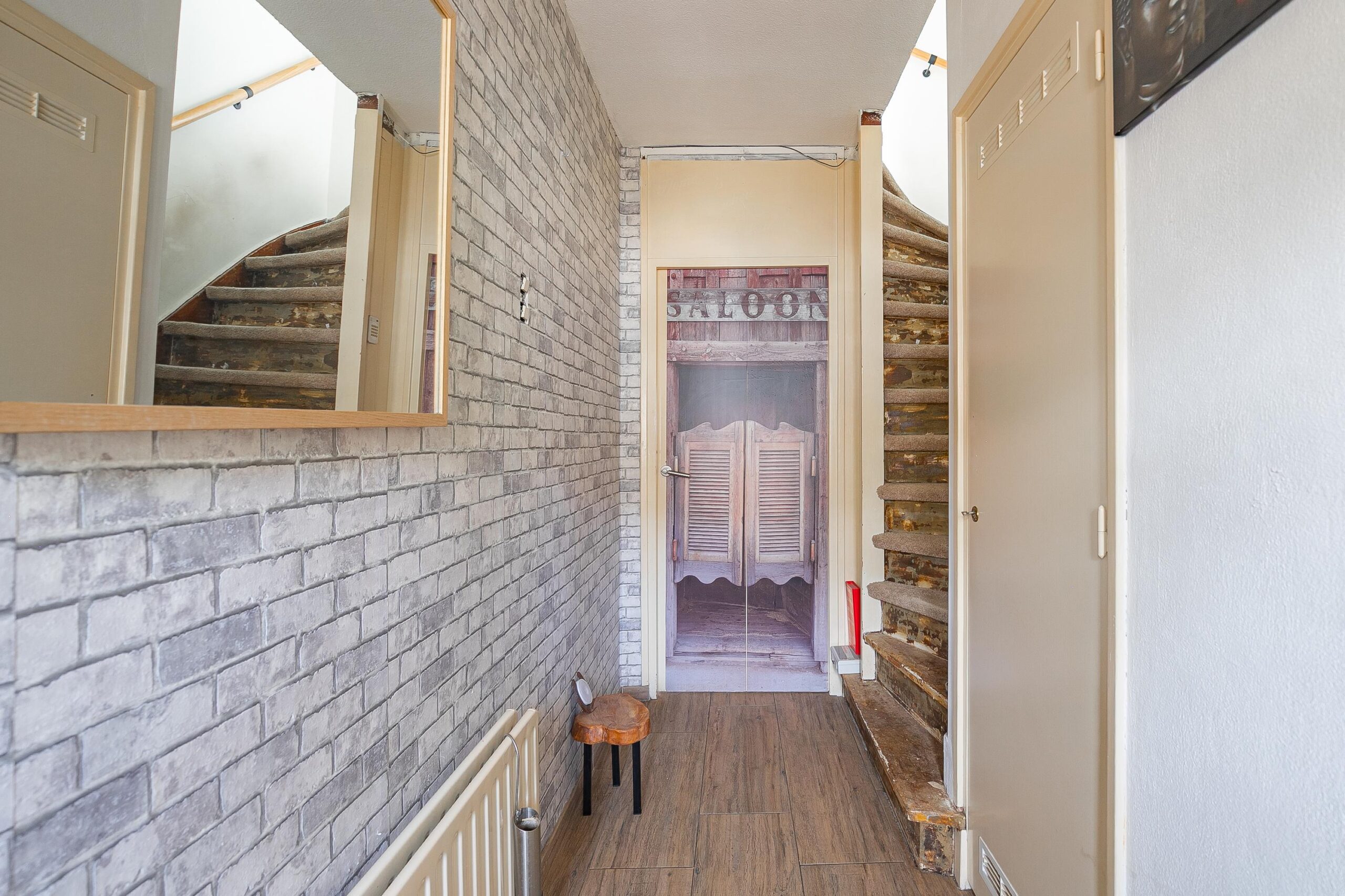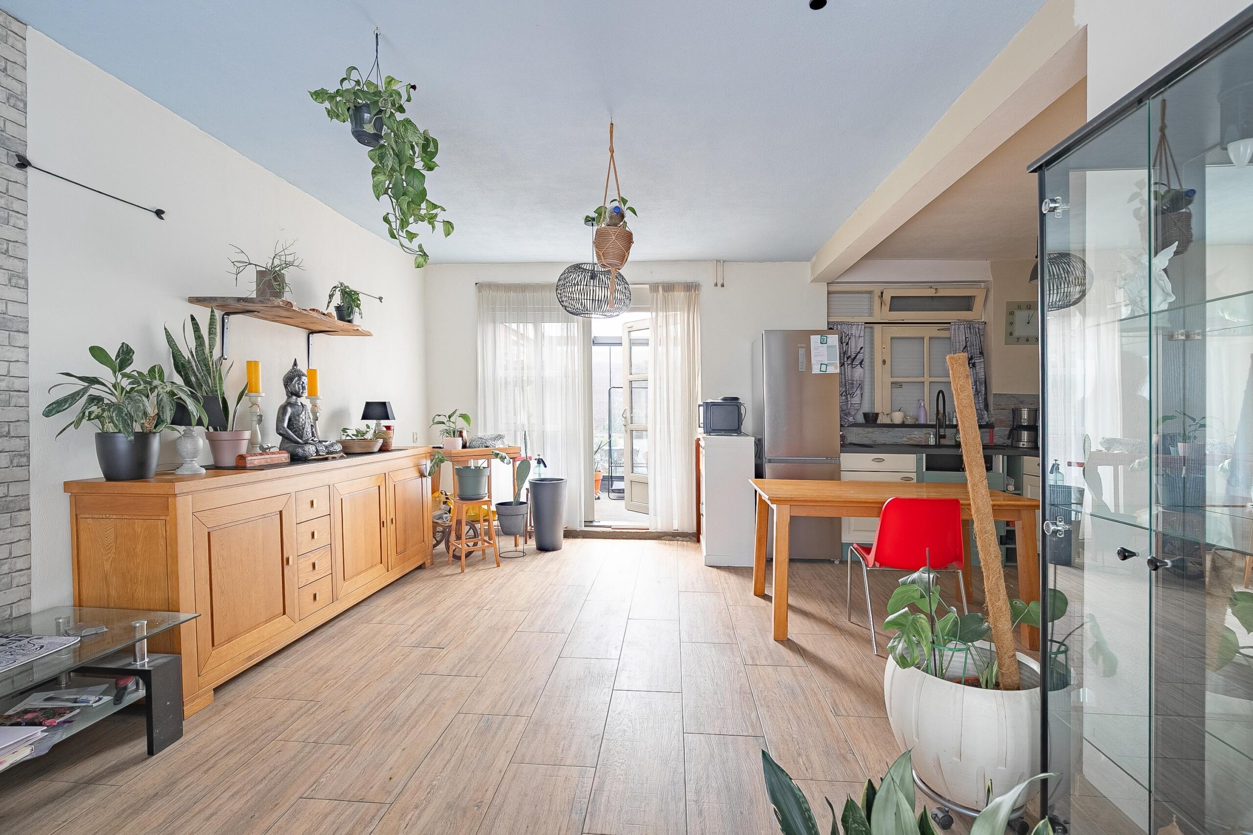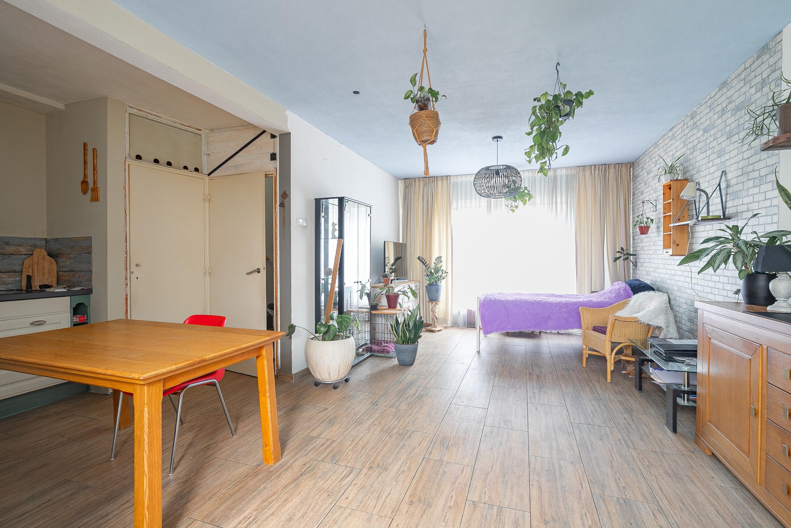 Woonkamer eveneens met plavuizenvloer met bergkast.
