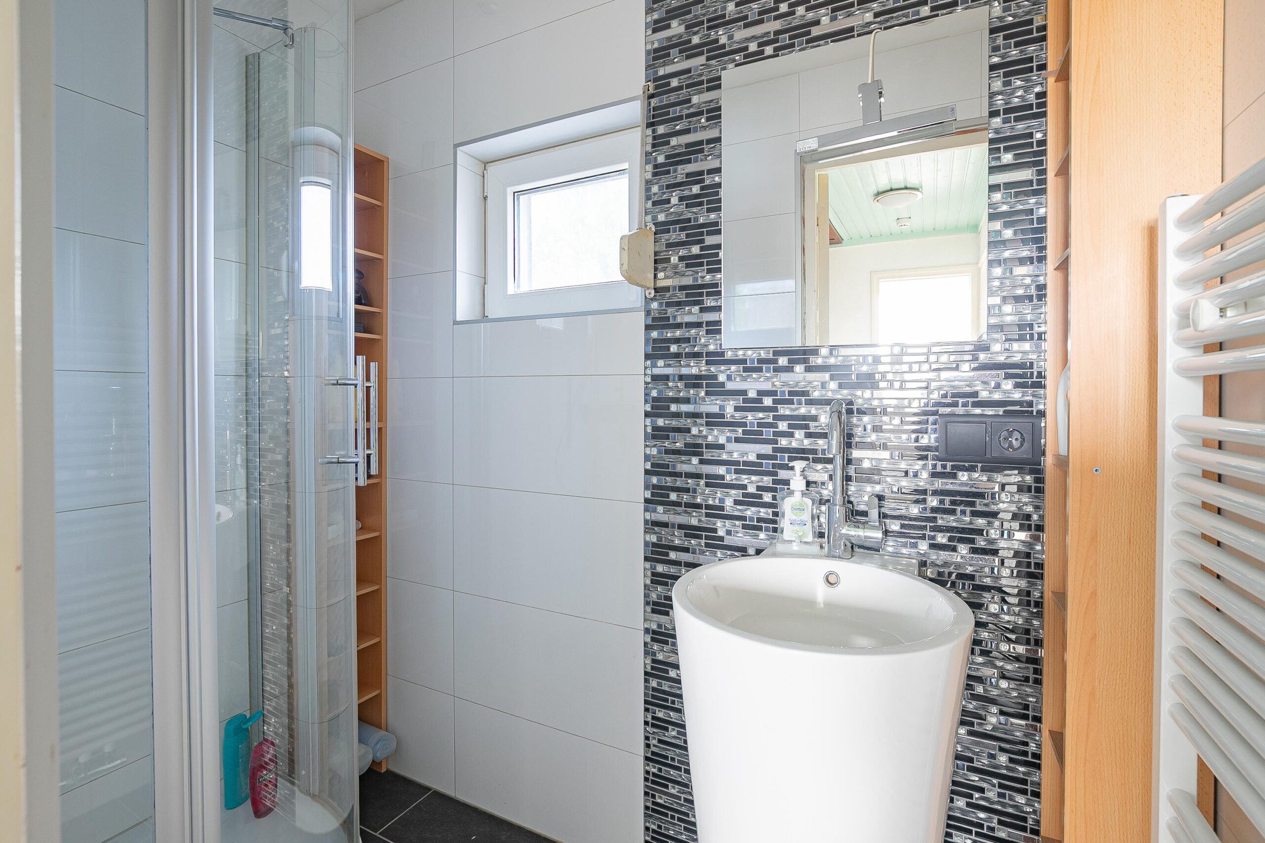 Geheel betegelde badkamer met douchecabine, opbergkasten en design radiator.