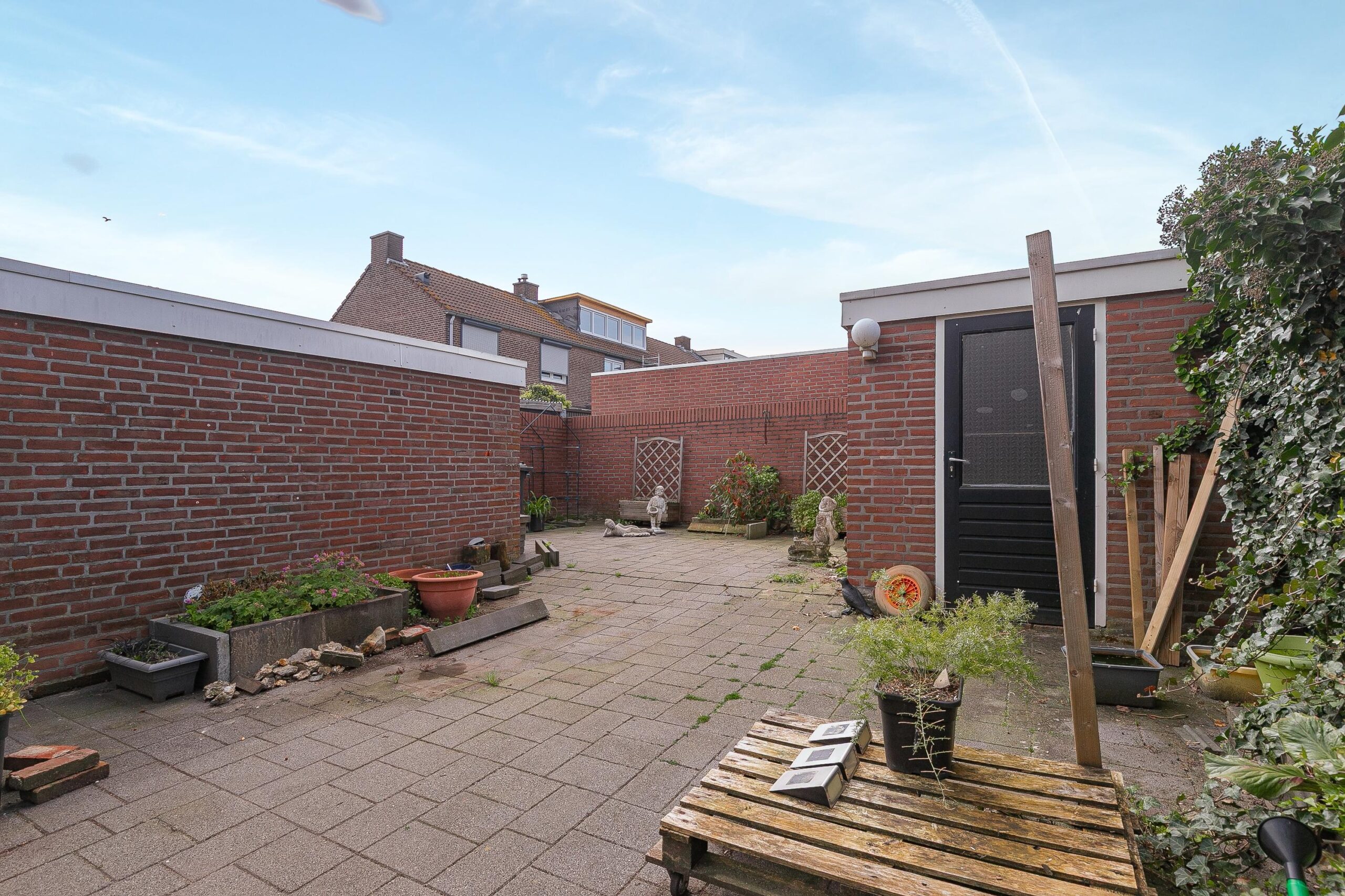 Onderhoudsvrije ruime tuin met stenen berging en voldoende privacy.