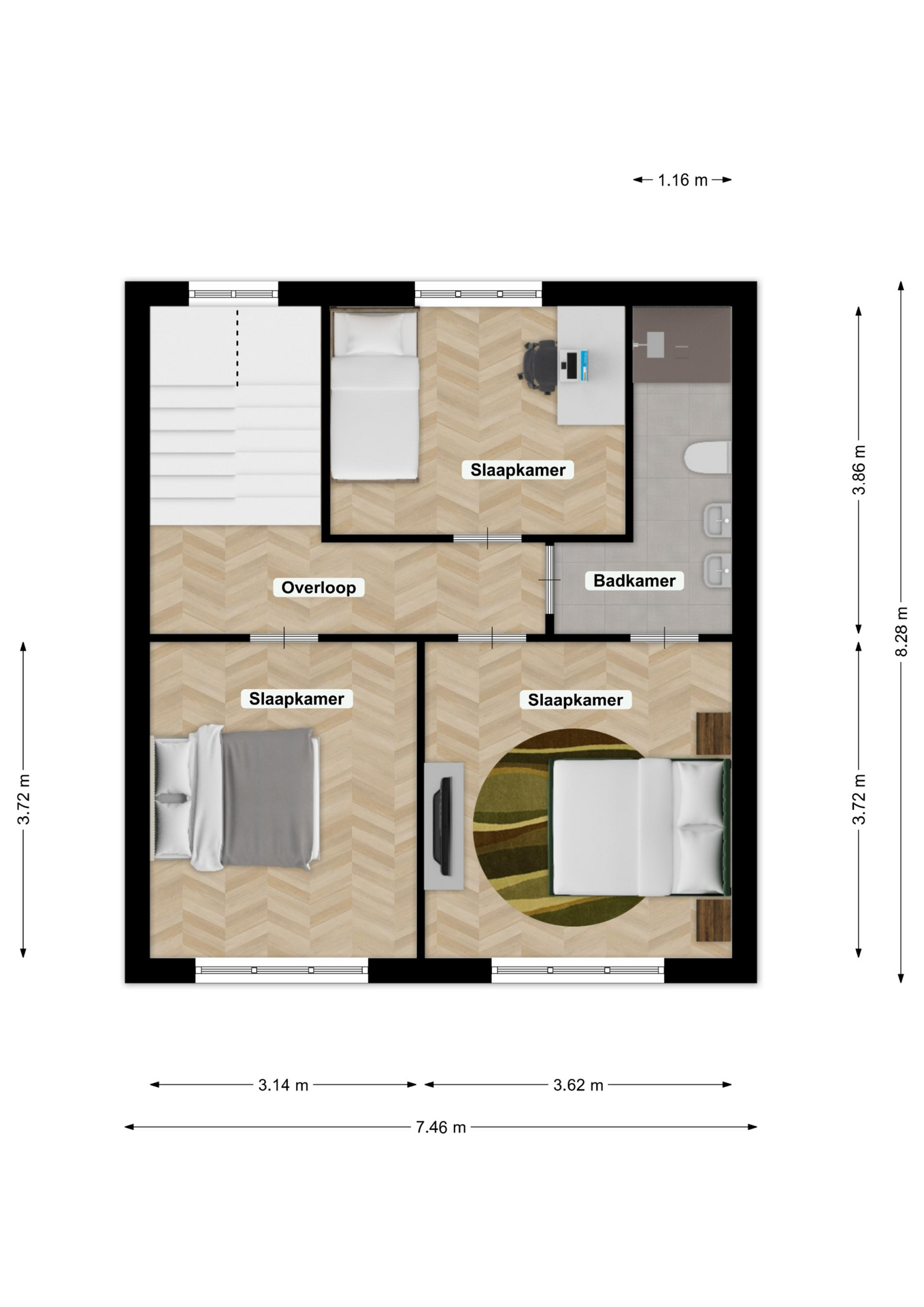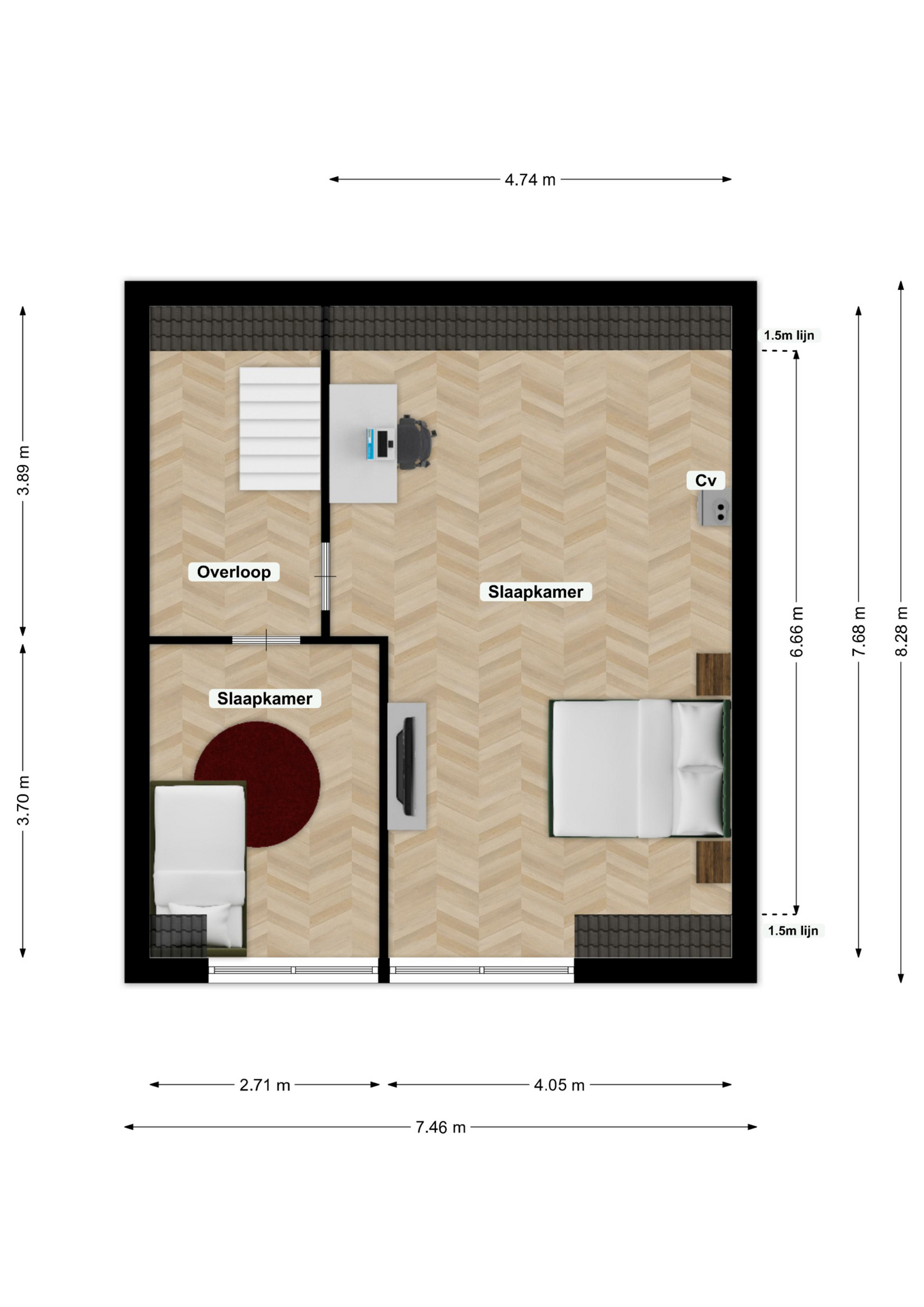 4) 7.68 m x 4.74 m, voorzien van dakkapel