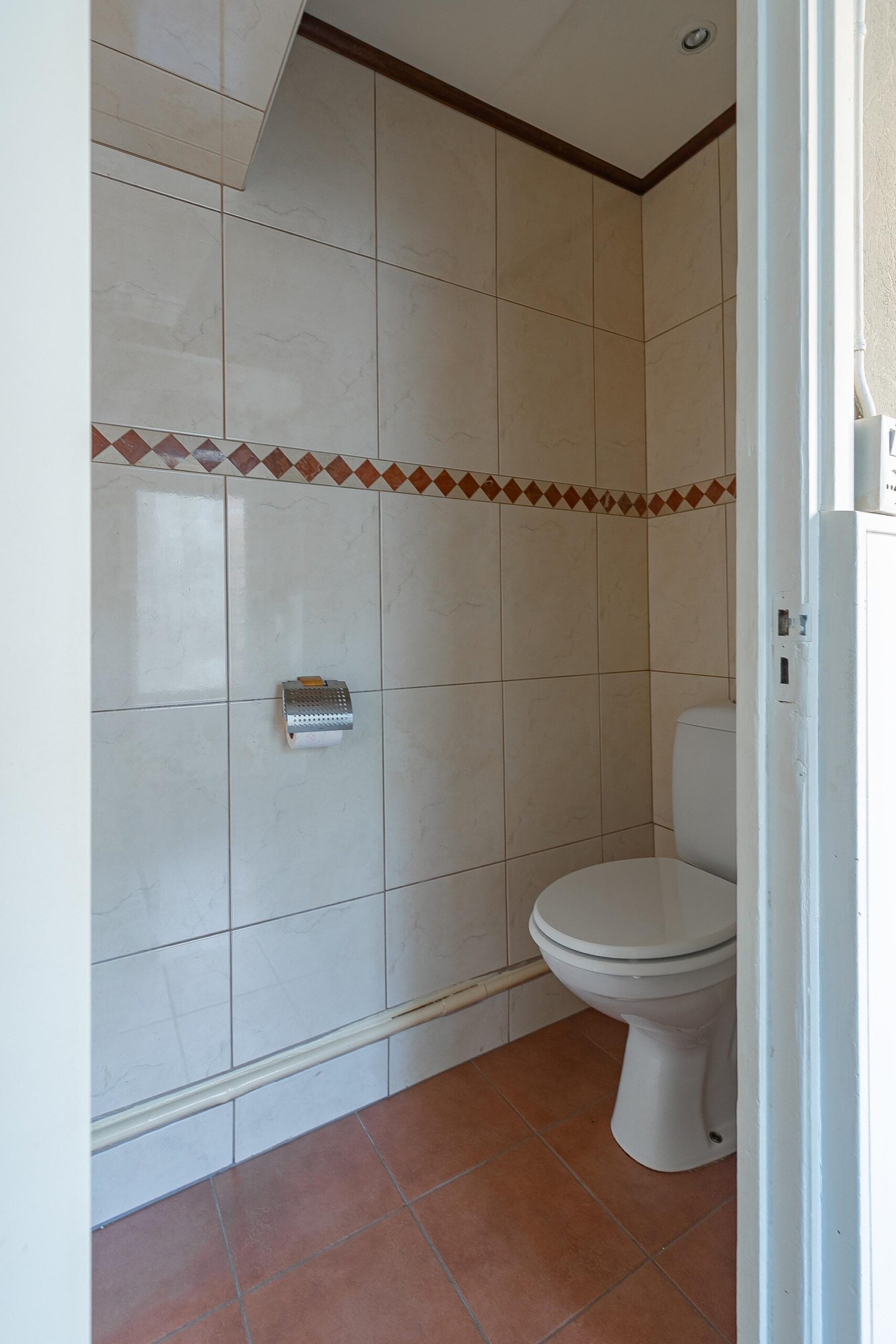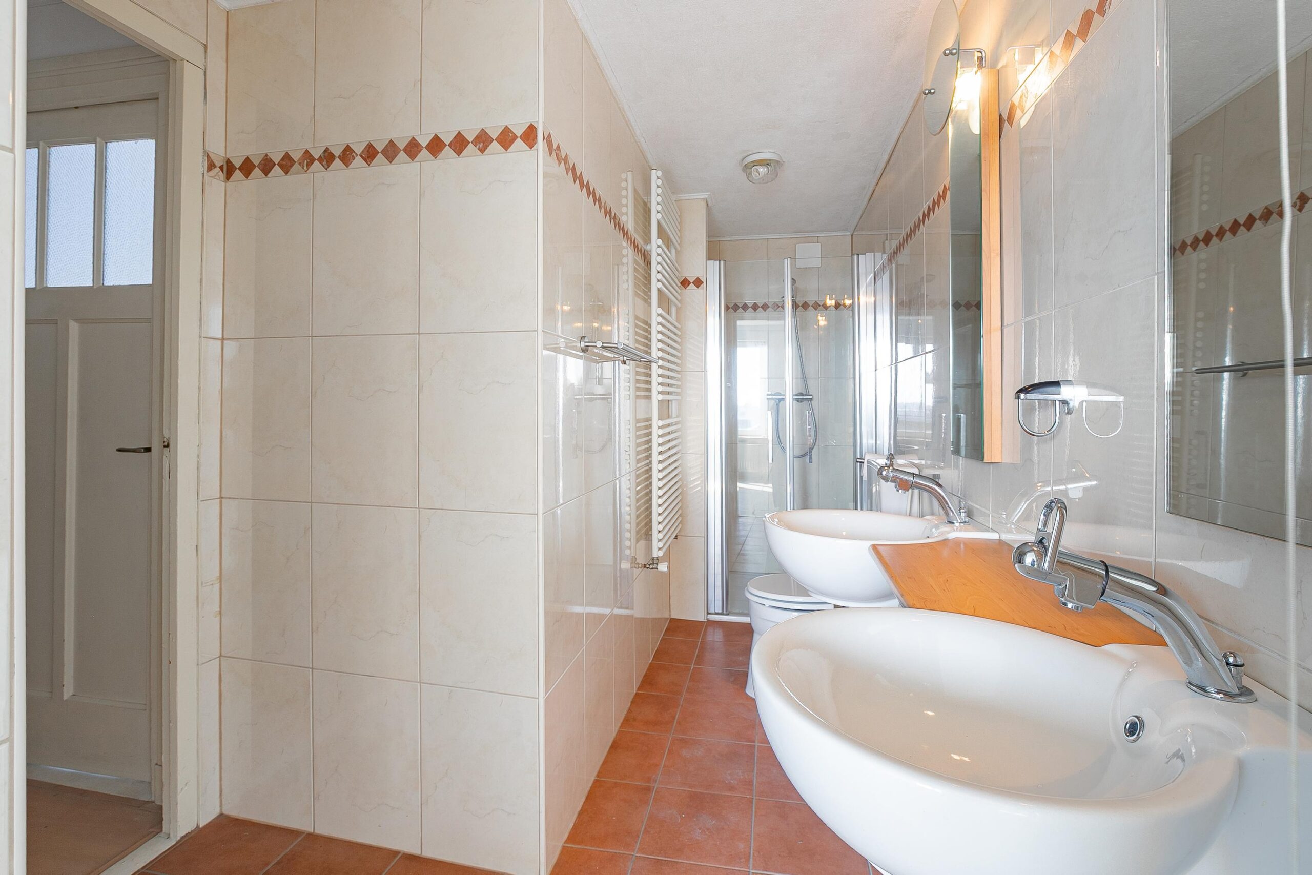Verder beschikt de eerste verdieping over een geheel betegelde badkamer, voorzien van douche met douchedeuren, handdoekradiator, dubbele wastafel, tweede toilet en muurventilatie. De badkamer is zowel via de overloop als via een van de slaapkamers te bereiken.