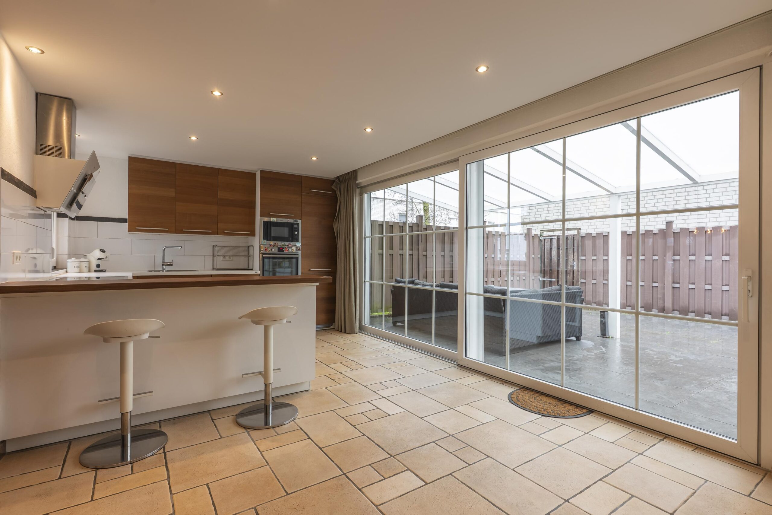 Aan de achterzijde van de woning bevindt zich de halfopen leefkeuken (ca. 22 m²), gerealiseerd in de uitbouw. Deze moderne keuken is compleet ingericht met een 4-pits inductiekookplaat, afzuigkap, koelkast, vriezer, vaatwasser, magnetron, oven en diverse boven- en onderkasten. Vanuit de leefkeuken is er toegang tot de berg-/wasruimte (ca. 4,5 m²) met witgoedaansluiting. Daarnaast biedt een brede schuifpui directe toegang tot de achtertuin met overkapping.