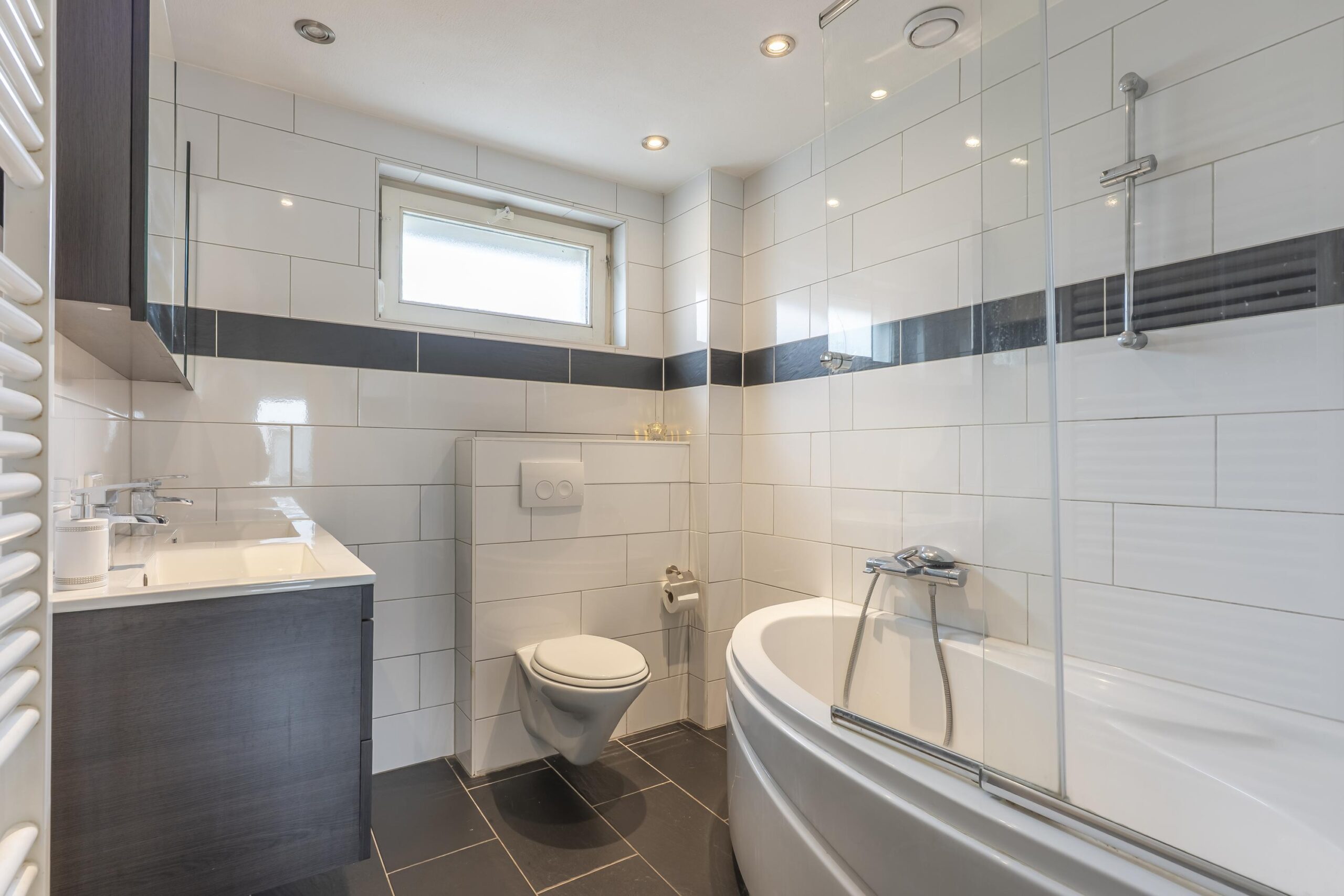 De volledig betegelde badkamer (ca. 5 m²) beschikt over een ligbad, toilet en een dubbele wastafel. Daarnaast is er een praktische berging aanwezig met de opstelling van de cv-ketel (eigendom, bouwjaar 2010).