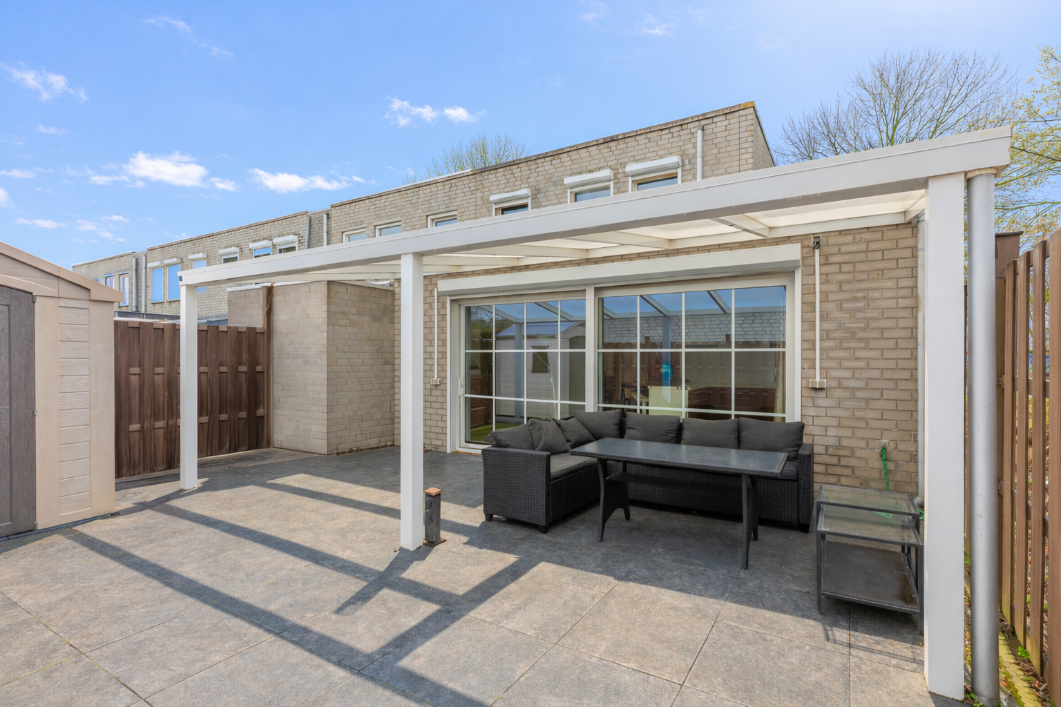 De achtertuin is in 2014 aangelegd en gelegen op het noordoosten, voorzien van een overkapping (ca. 19 m²), betegeld terras, achterom en kunststof berging (ca. 3,5 m²).