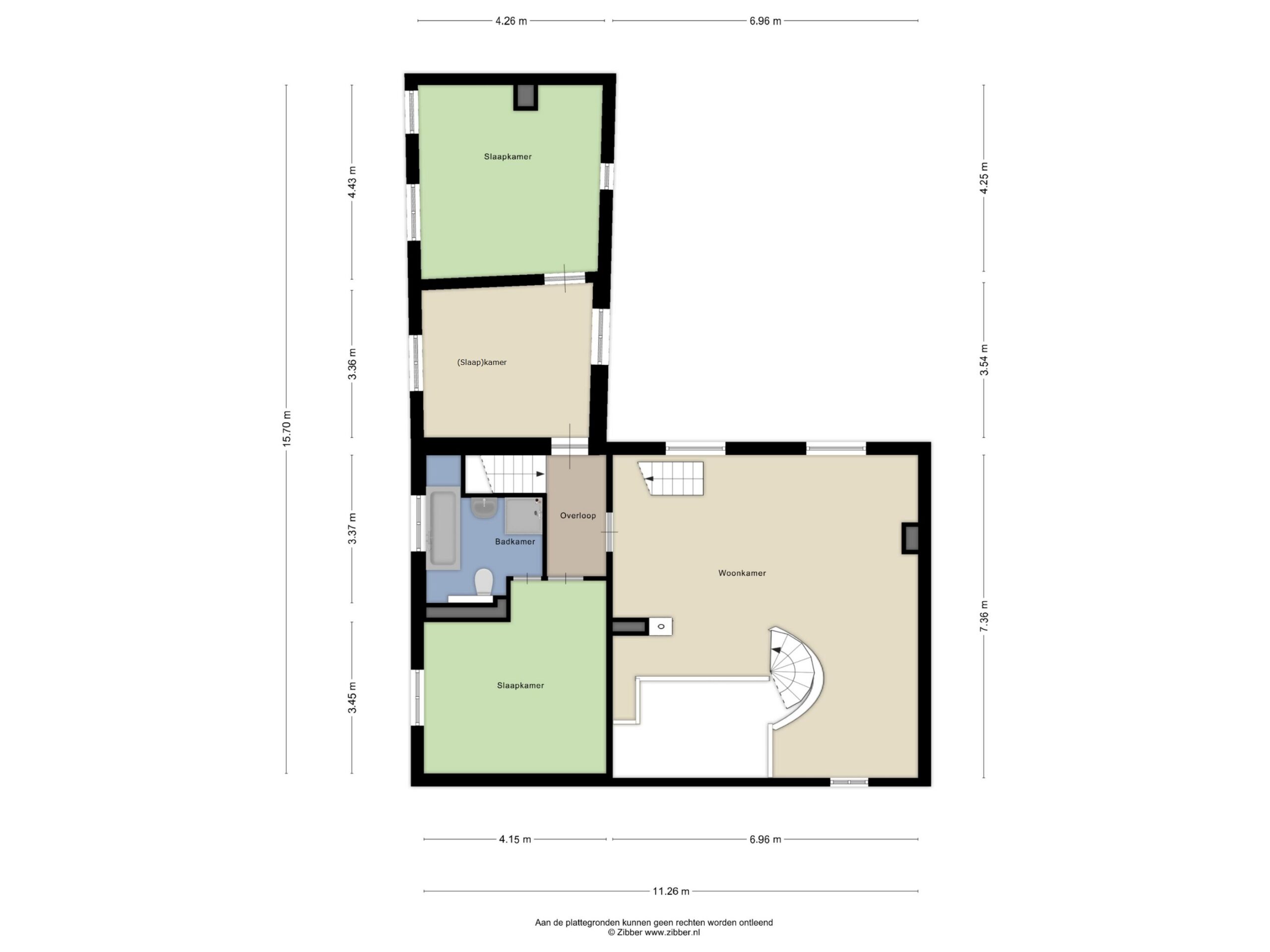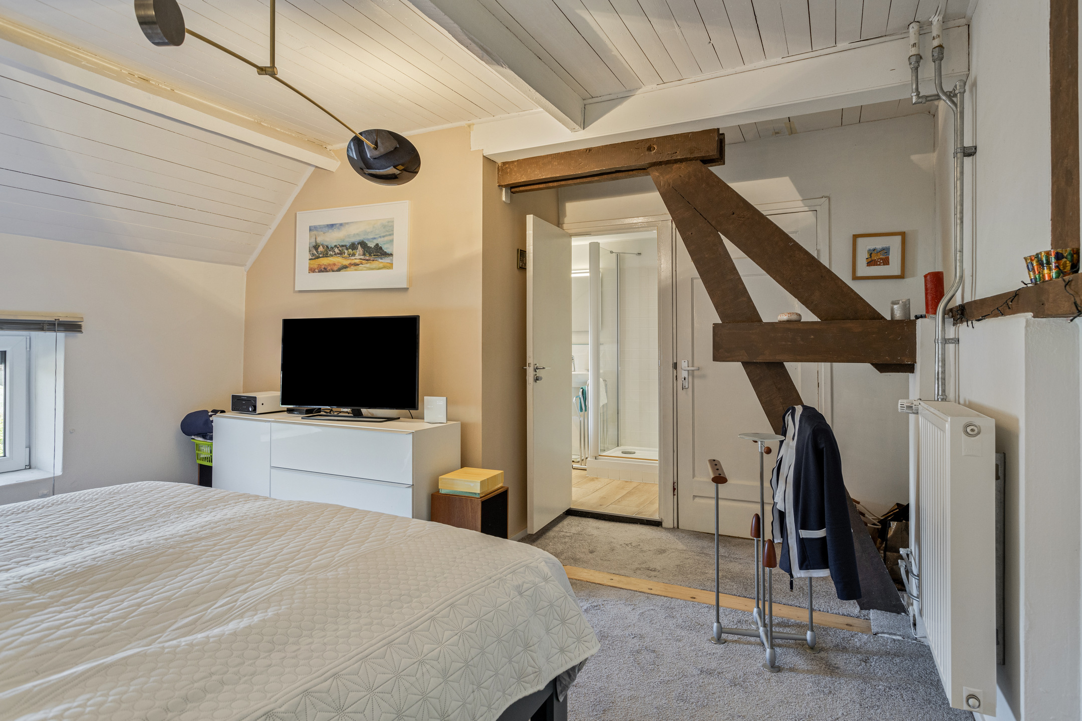 Via de overloop zijn de hoofdslaapkamer met badkamer en suite en de twee overige (slaap)kamers. Deze ruimtes zijn afgewerkt met houten vloeren en plafonds. Een smalle, historische diensttrap biedt een extra verbinding tussen de verdieping en de keuken. De hoofdslaapkamer beschikt over een badkamer en suite en zichtbare houten balken. De badkamer is uitgerust met een ligbad, douchecabine, toilet, wastafel en designradiator. De middelste kamer is momenteel in gebruik als studeerkamer en biedt toegang tot de achtergelegen kamer. Indien gewenst kan hier eenvoudig een tussenwand worden geplaatst, zodat alle kamers rechtstreeks via de overloop bereikbaar zijn. Karakteristieke ronde houten deuren en vensters zorgen voor veel sfeer en natuurlijke lichtinval.