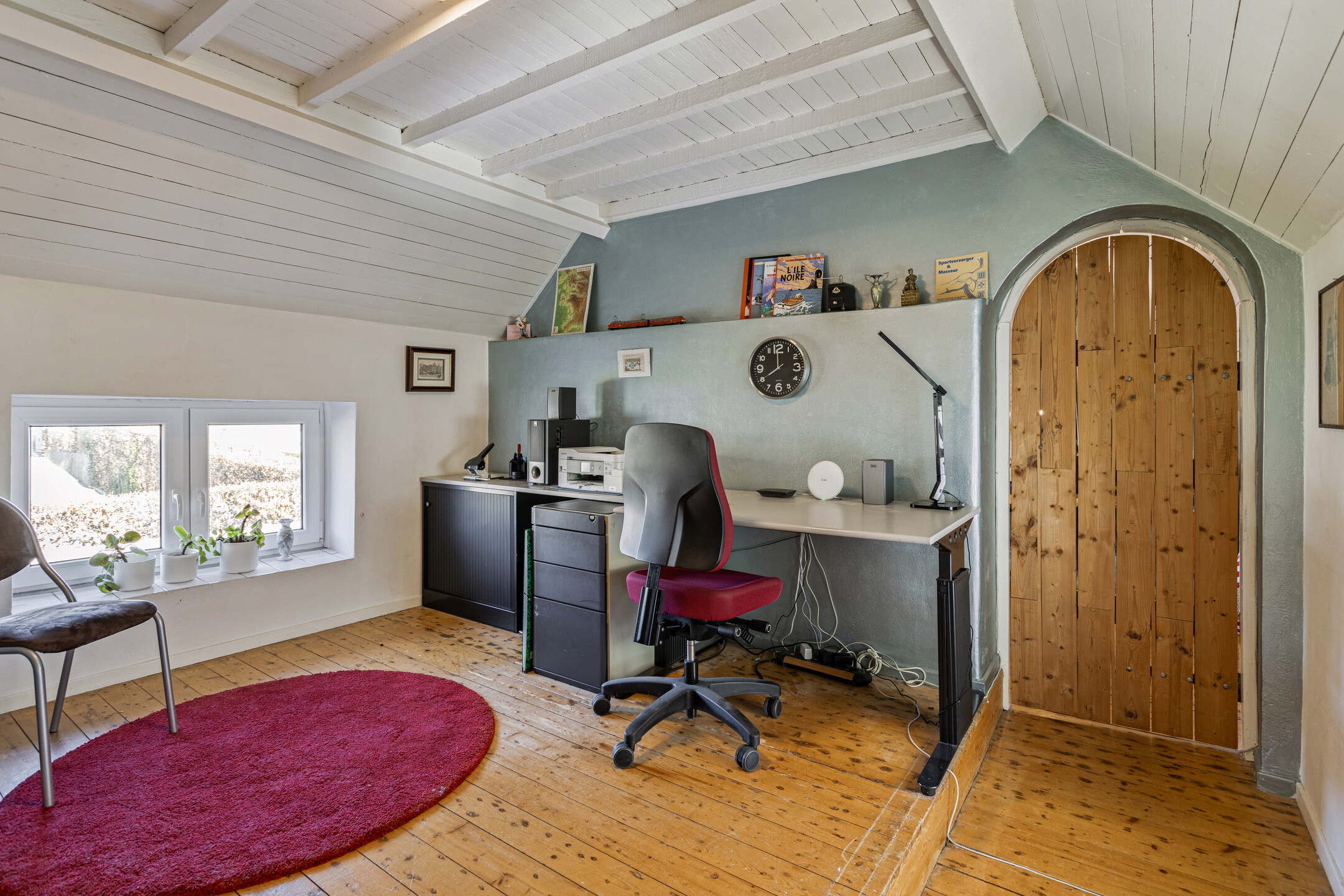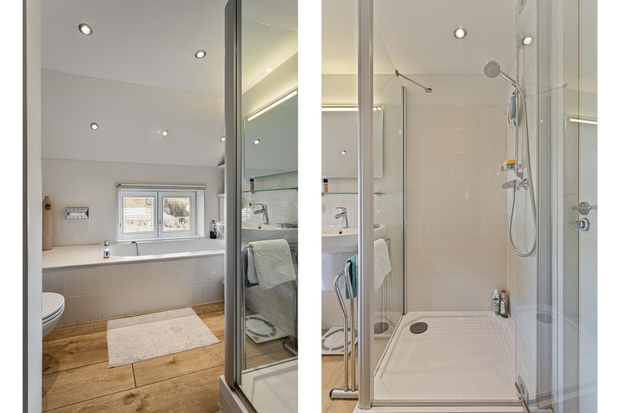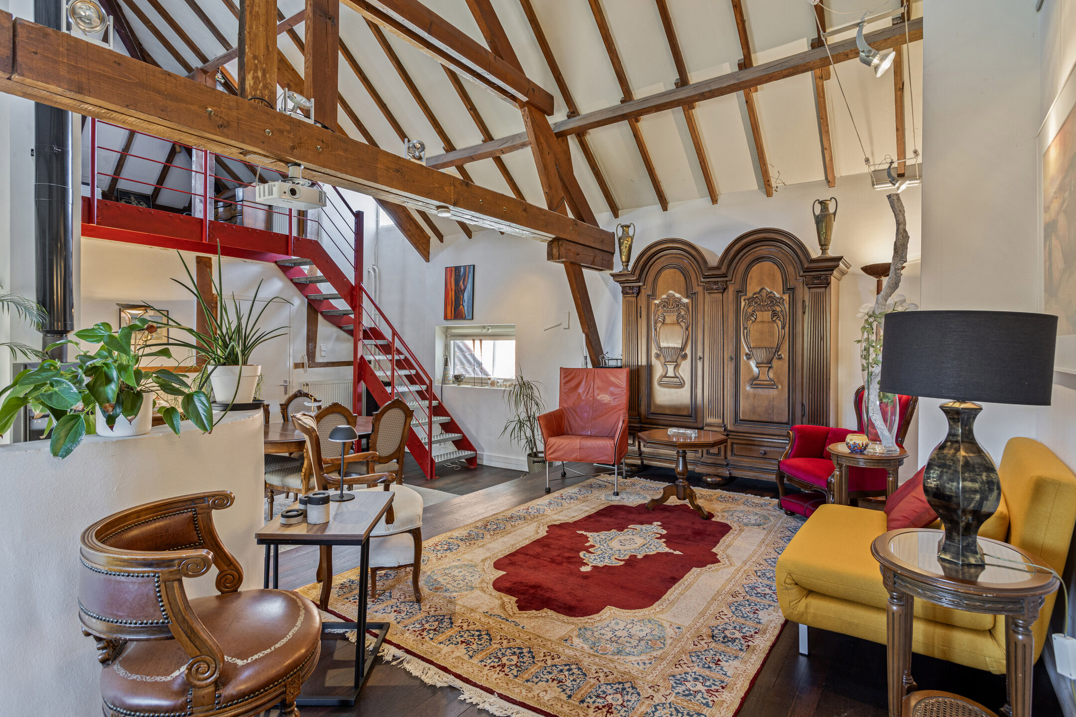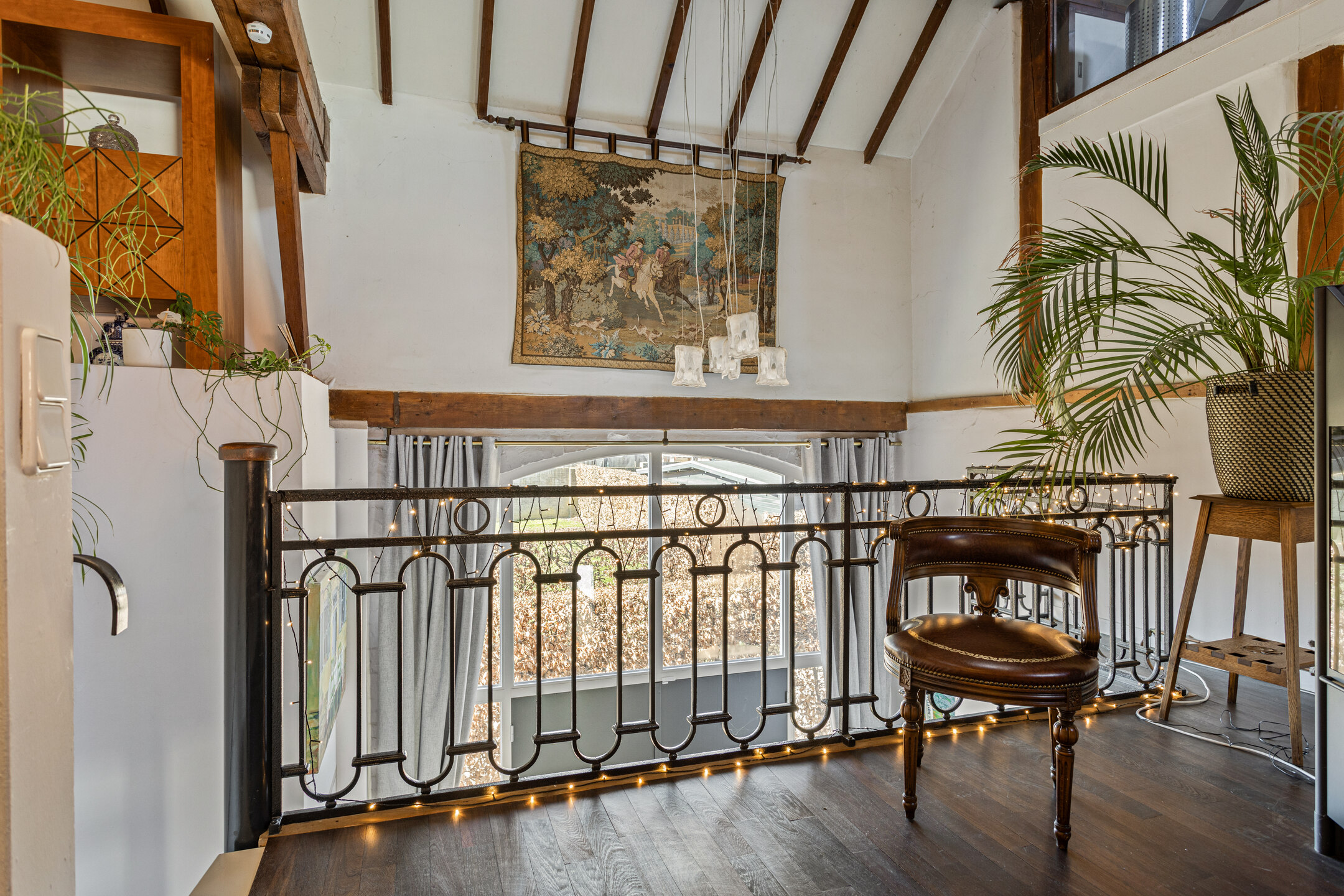 Via de stalen wenteltrap in de hal bereik je de verdieping. Hier kom je eerst in een tweede woonkamer met loftachtig karakter. De ruimte is uitgevoerd met een klassieke wengévloer in twee niveaus en staat door middel van een vide in verbinding met de onderliggende woonlaag. Zichtbare houten spanten en gordingen versterken het boerderijkarakter. Dit ademt precies het karakter van een echte Limburgse hoeve en maakt de woning uniek. Natuurlijk is het een ieder vrij om een eigen bestemming aan deze ruimte te geven. Het is bijvoorbeeld vrij makkelijk om hier een of twee slaapkamers van te maken.