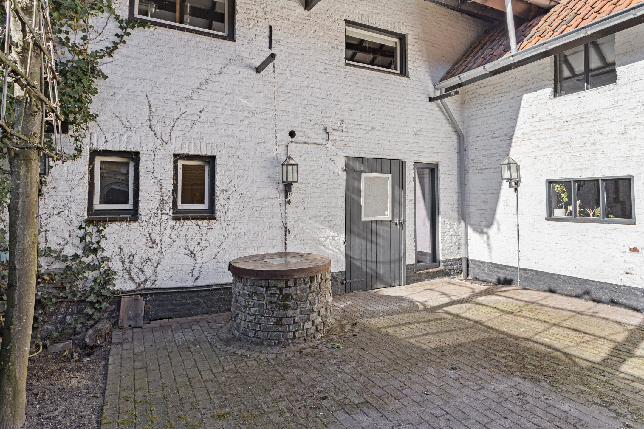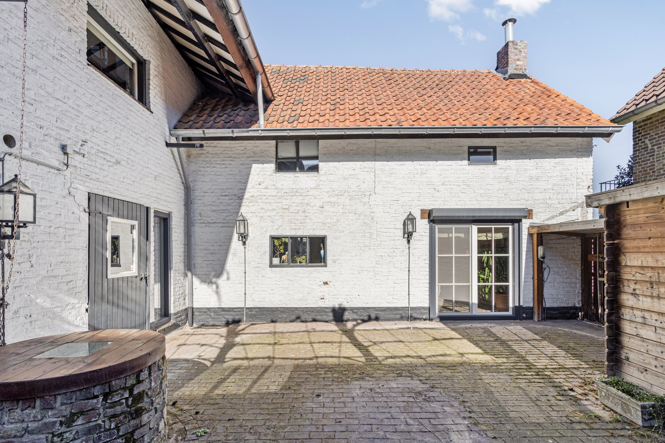 De binnenplaats is direct bereikbaar vanuit de woonkamer en vormt een beschutte buitenruimte. Hier bevindt zich een houten tuinhuis met aangrenzende overkapping. De originele waterput met houten putbalk en ketting herinnert aan de historische functie van deze plek. Aansluitend ligt de tuin, ingericht met een prieel, zonneterras en diverse beplanting. Daarnaast beschikt de tuin over een sauna met relaxruimte en douche. Via een houten poort is het pad naar de voorzijde van de carréboerderij bereikbaar.
