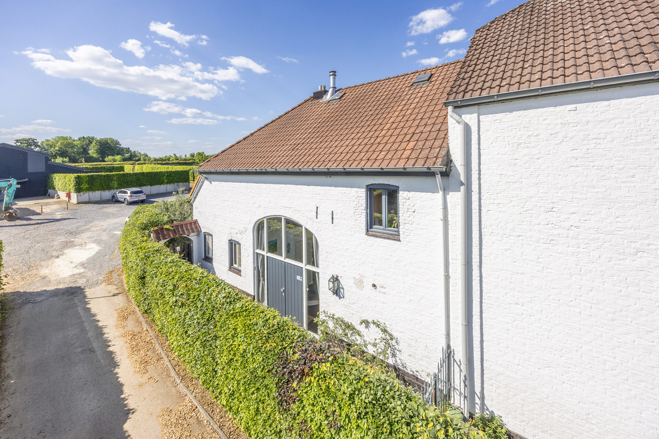 Via het beklinkerde pad aan de linkerzijde van de carréboerderij bereik je de karakteristieke voordeur met ronde glas pui. Dit pad maakt onderdeel uit van de koop. Je komt binnen in een ruime hal die fungeert als het centrale hart van de woning.