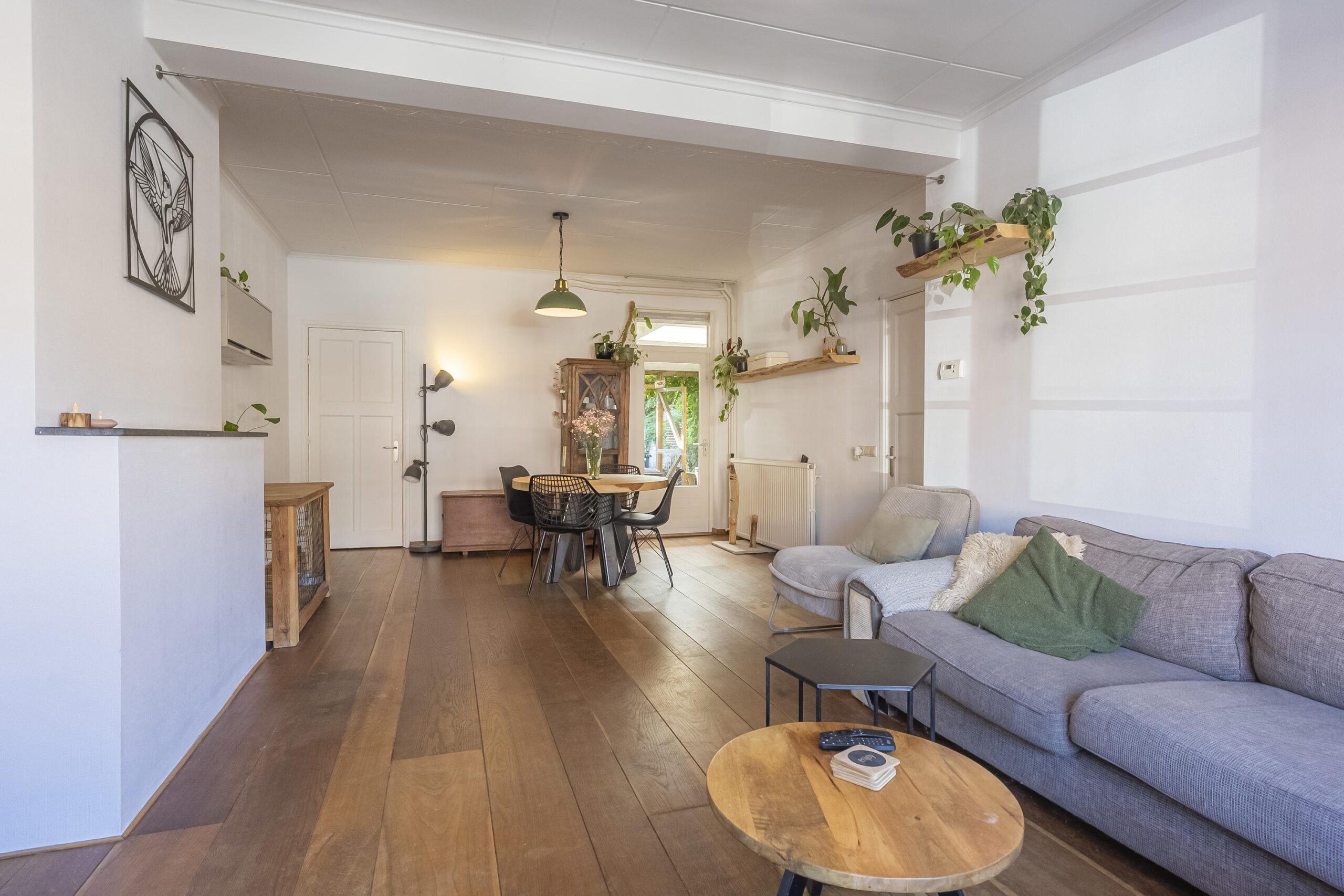 De woonkamer is groot ca. 33 m² en is voorzien van een houten vloer.