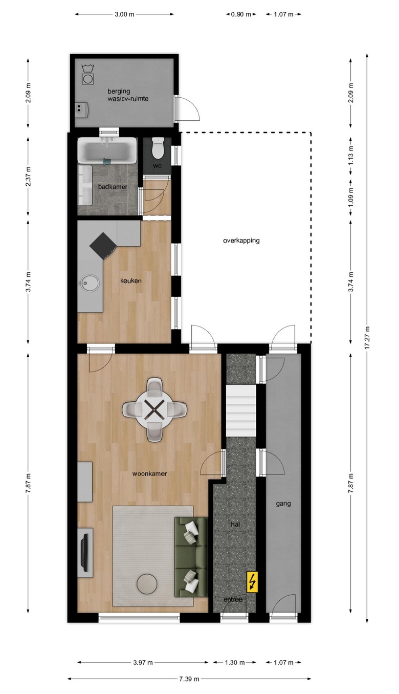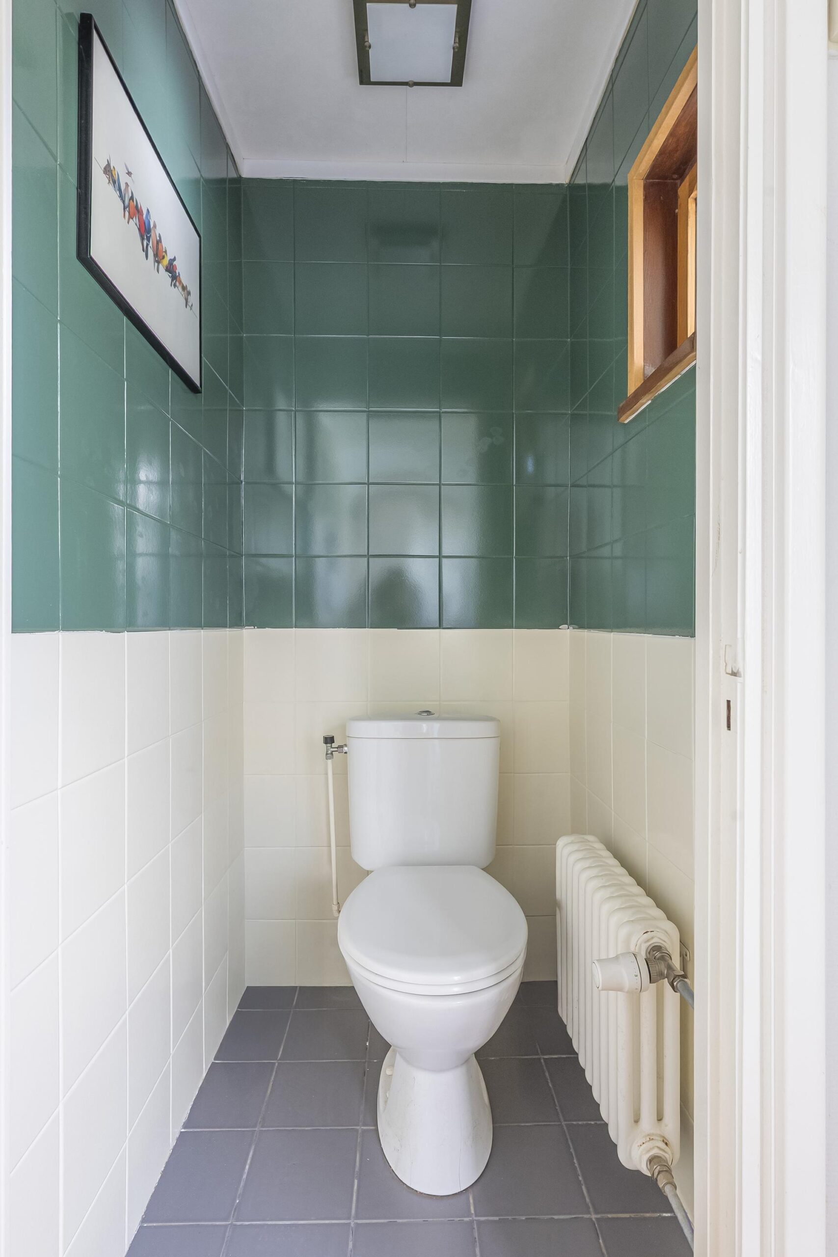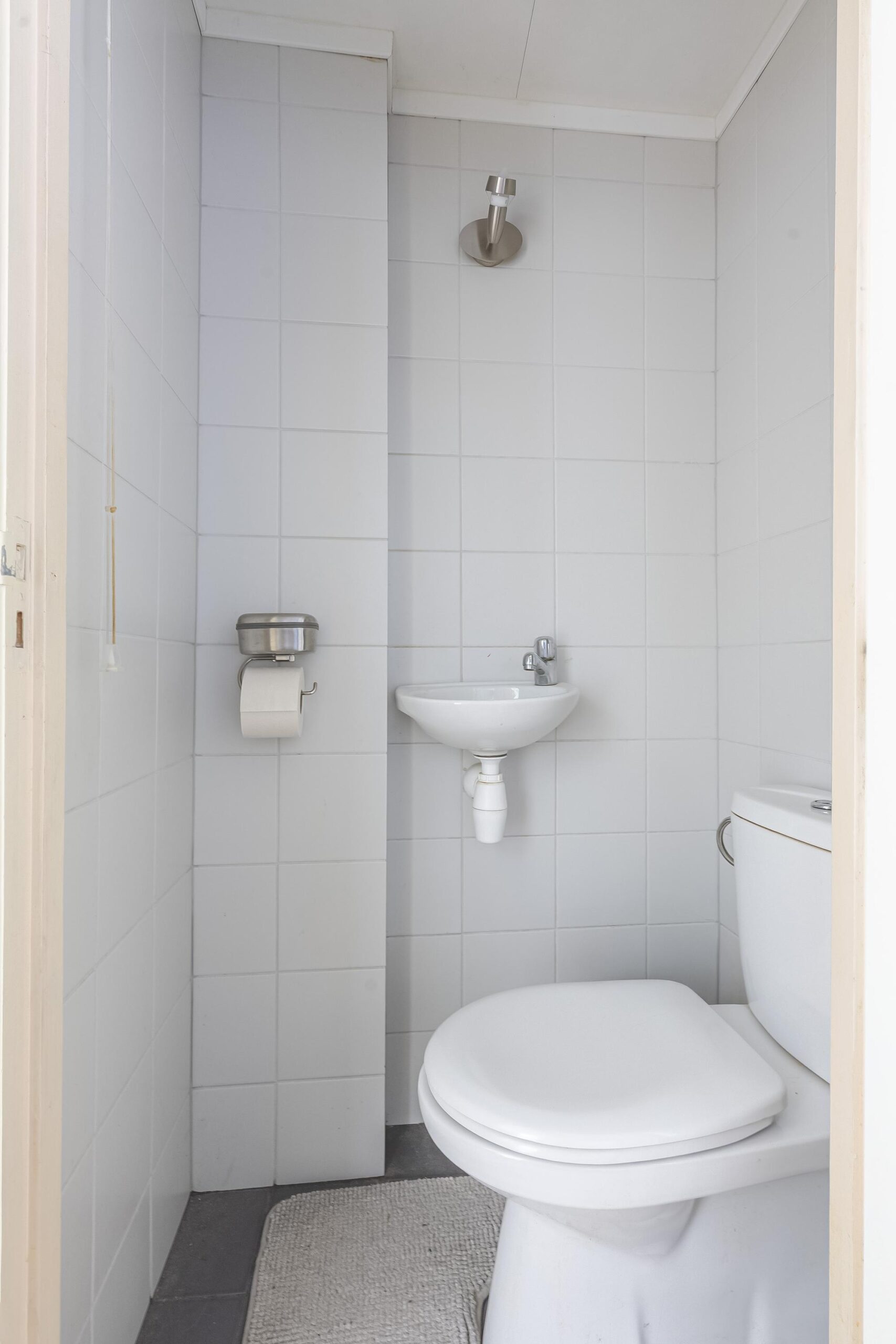 Achter de keuken is een tussenhal alwaar de geheel betegelde toiletruimte met staand toilet gesitueerd is.