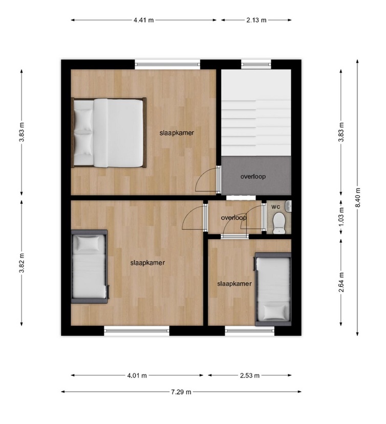 De 3 slaapkamers zijn respectievelijk groot. 17 m², 15 m² en 7 m² en voorzien van een mooie houtenplanken vloer.