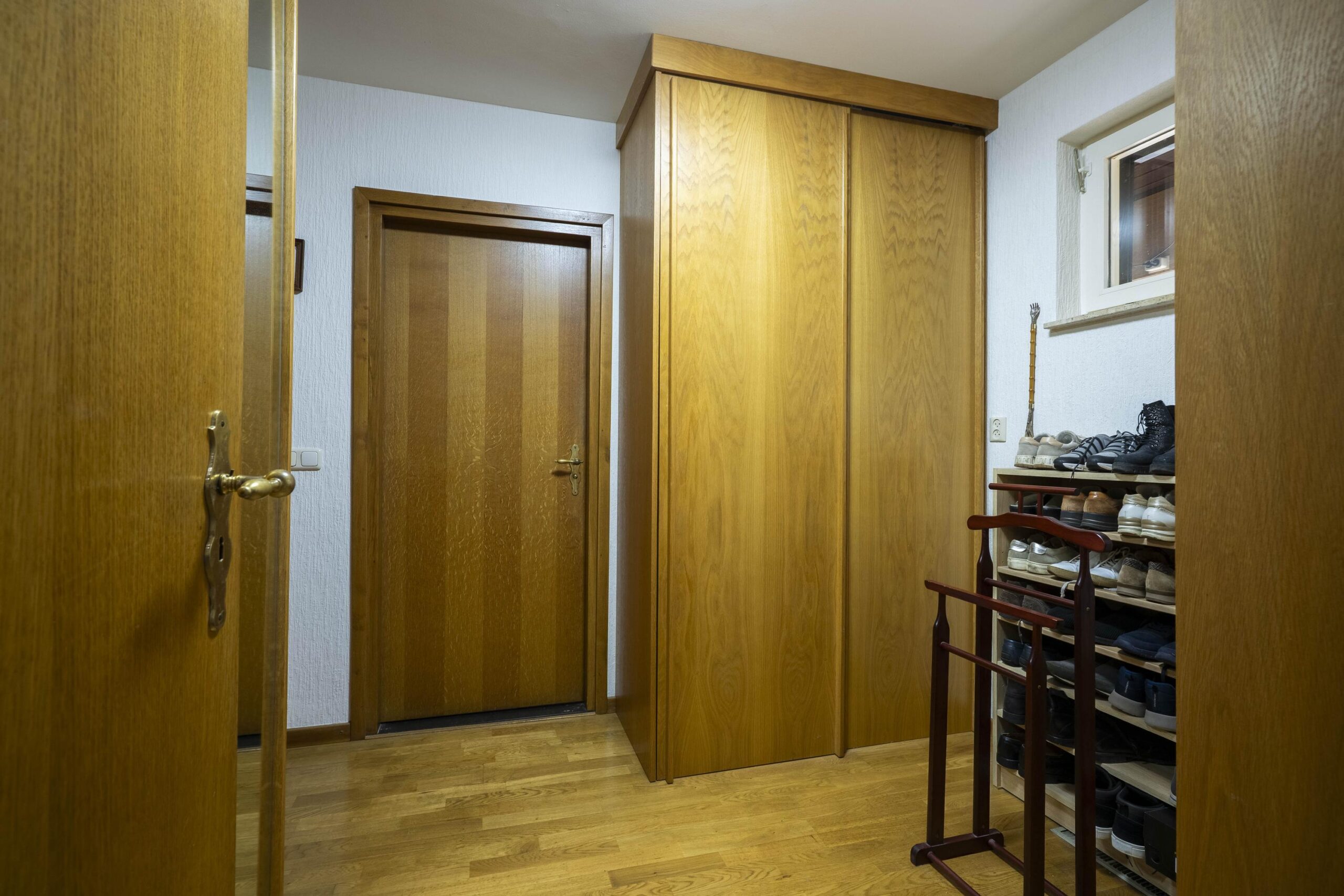 De kleedkamer met vaste kastenwanden is groot ca. 8 m² en biedt toegang tot de badkamer en de eerste slaapkamer.