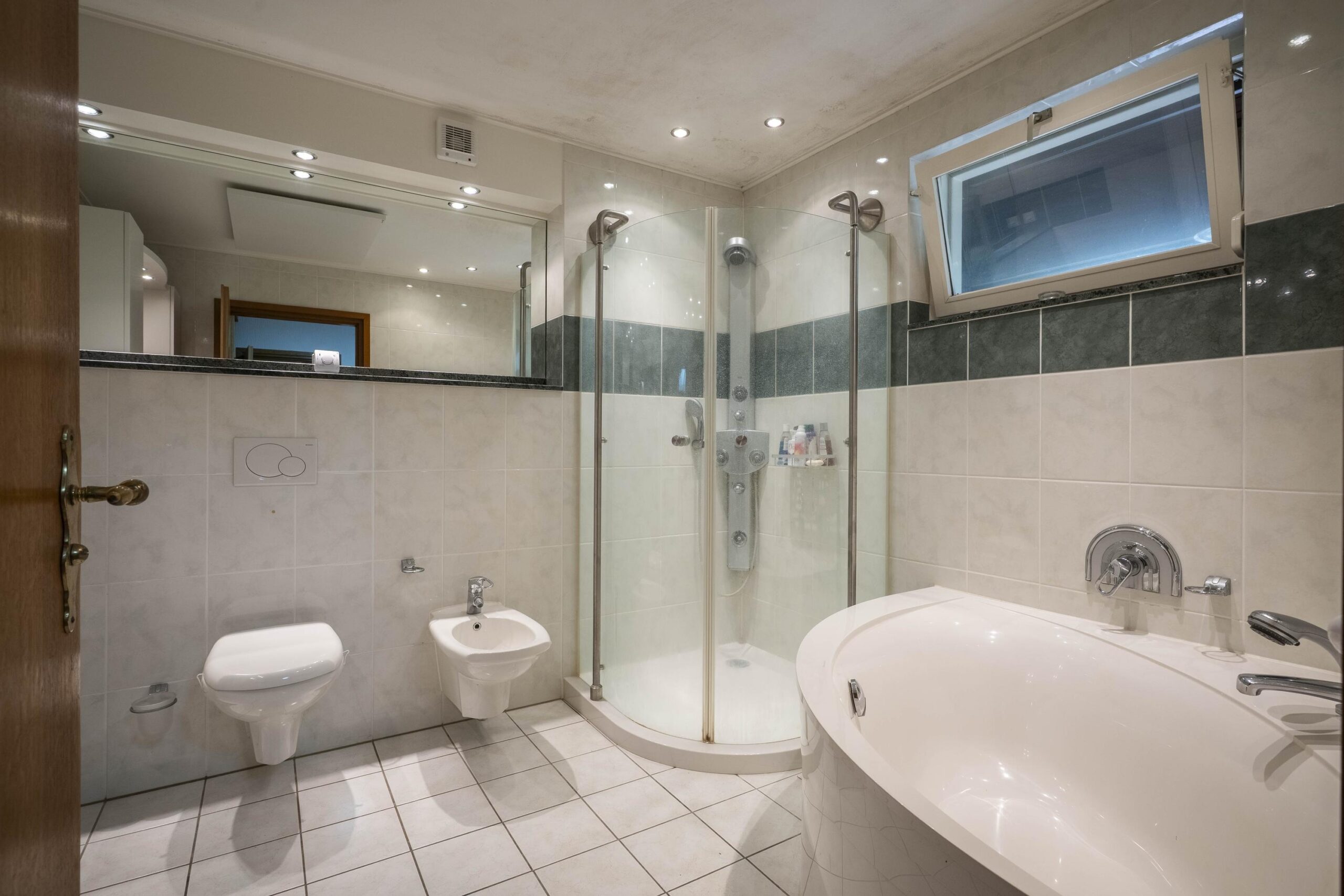 De badkamer is groot ca. 8 m² en is voorzien van een hoekbad, douche, wastafelmeubel, zwevend toilet en bidet.