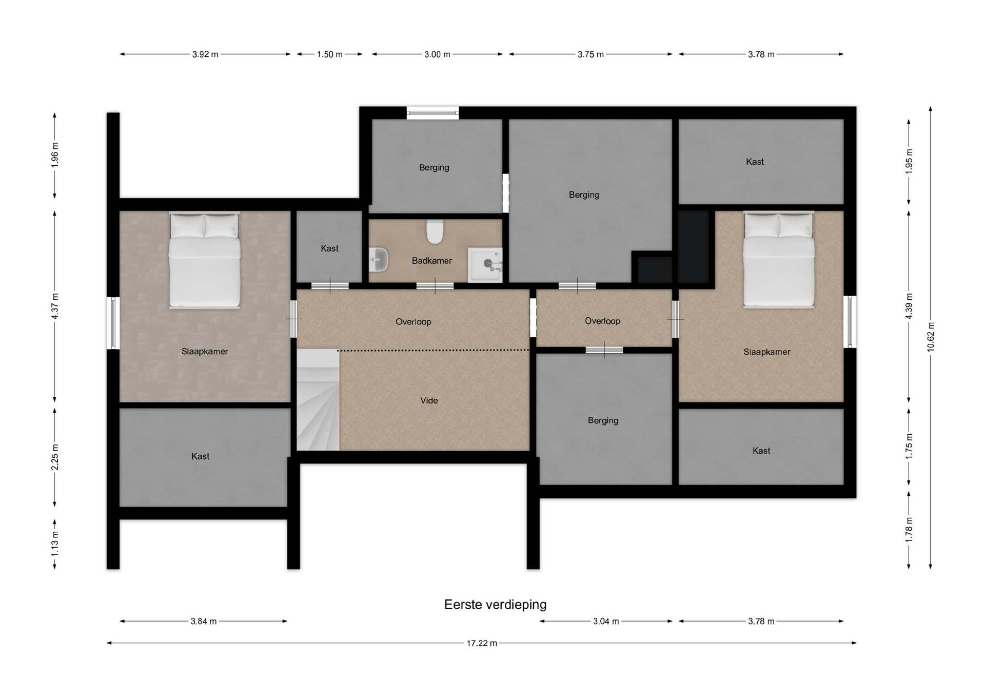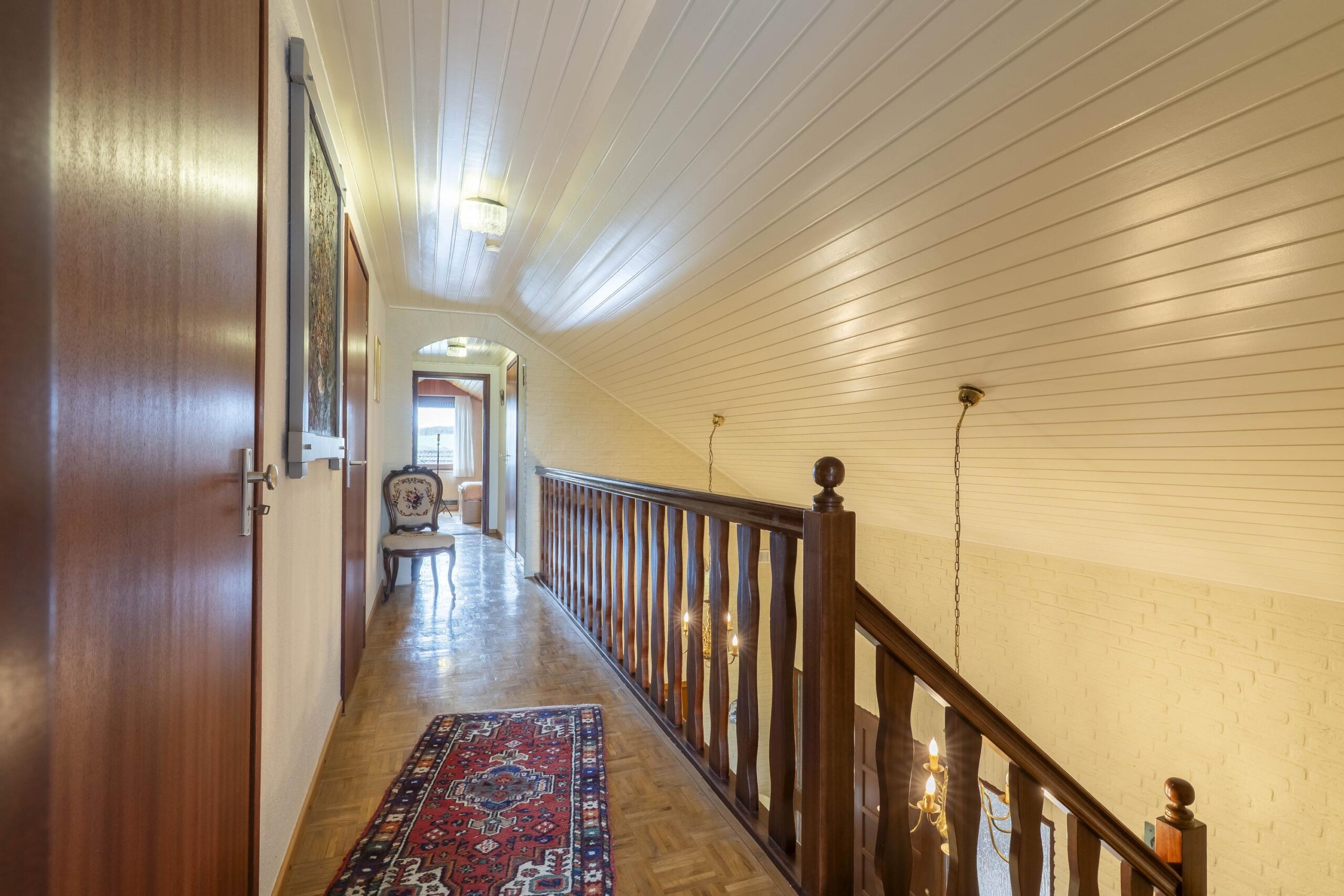 De overloop met vide biedt toegang tot 2 slaapkamers, de badkamer, 3 bergingen en een kastruimte.
