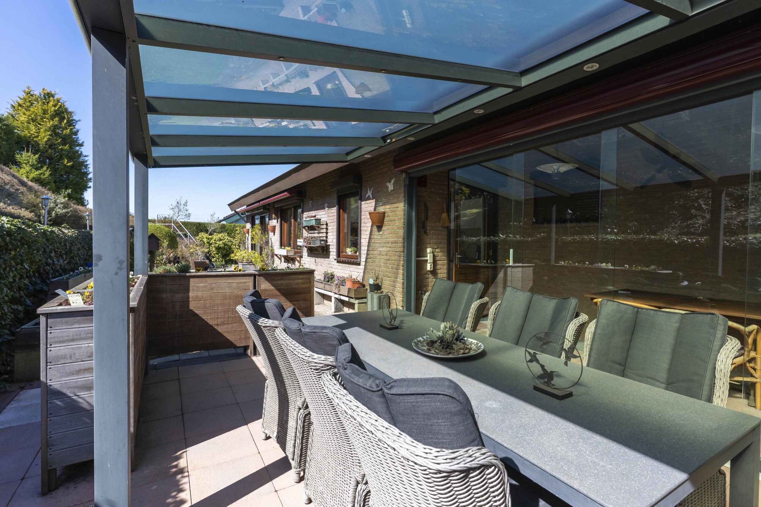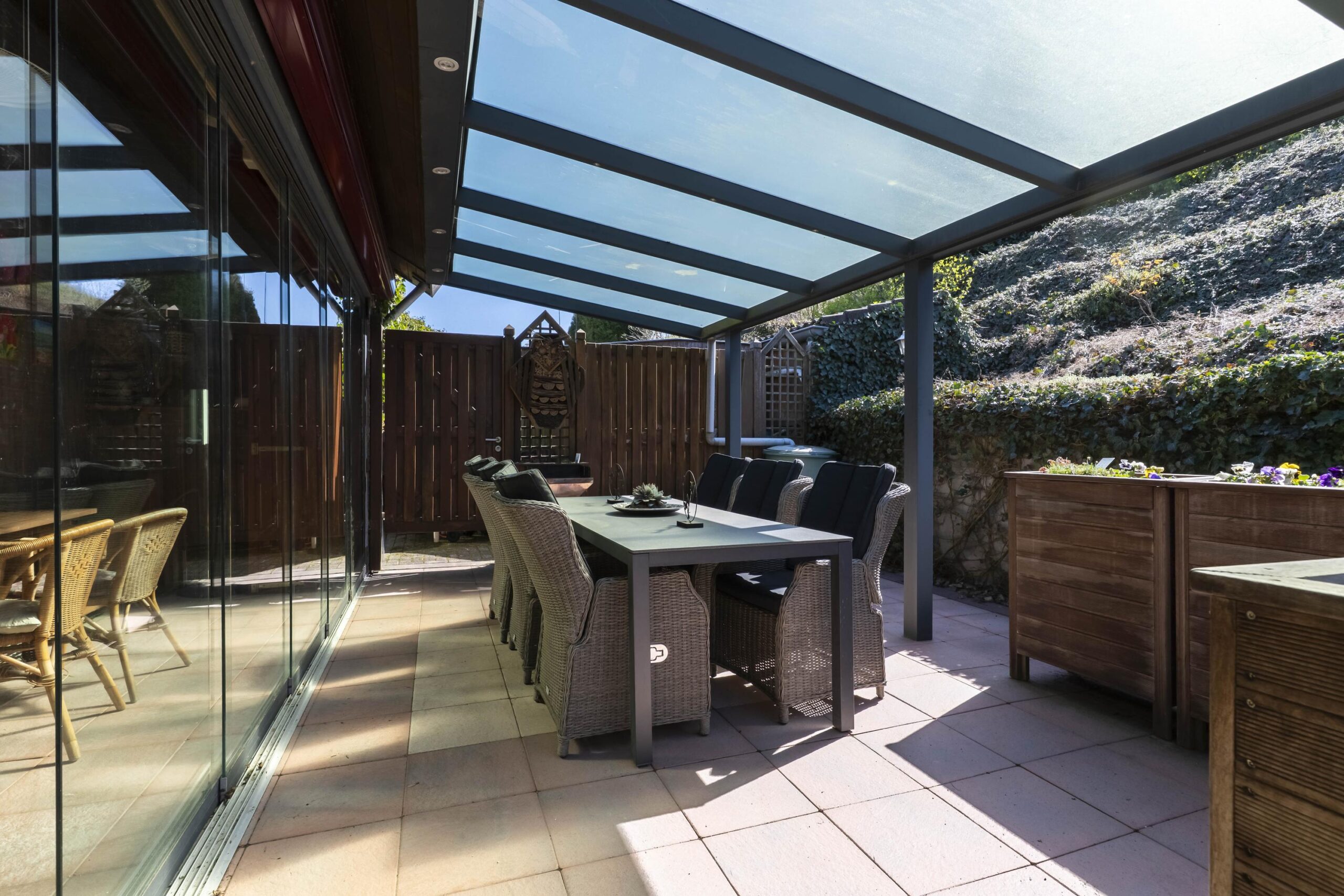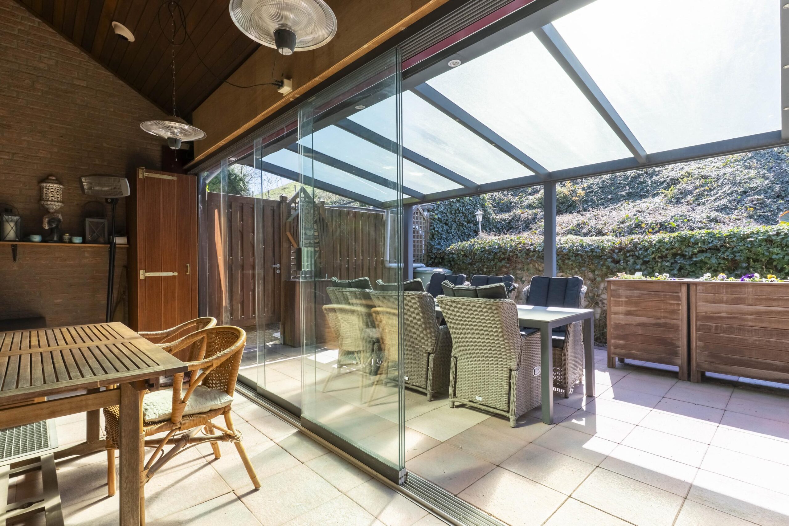 De wintertuin biedt toegang tot de achtertuin welke is voorzien van een ruim overdekt terras (18 m²) en is gelegen op het zuidwesten.