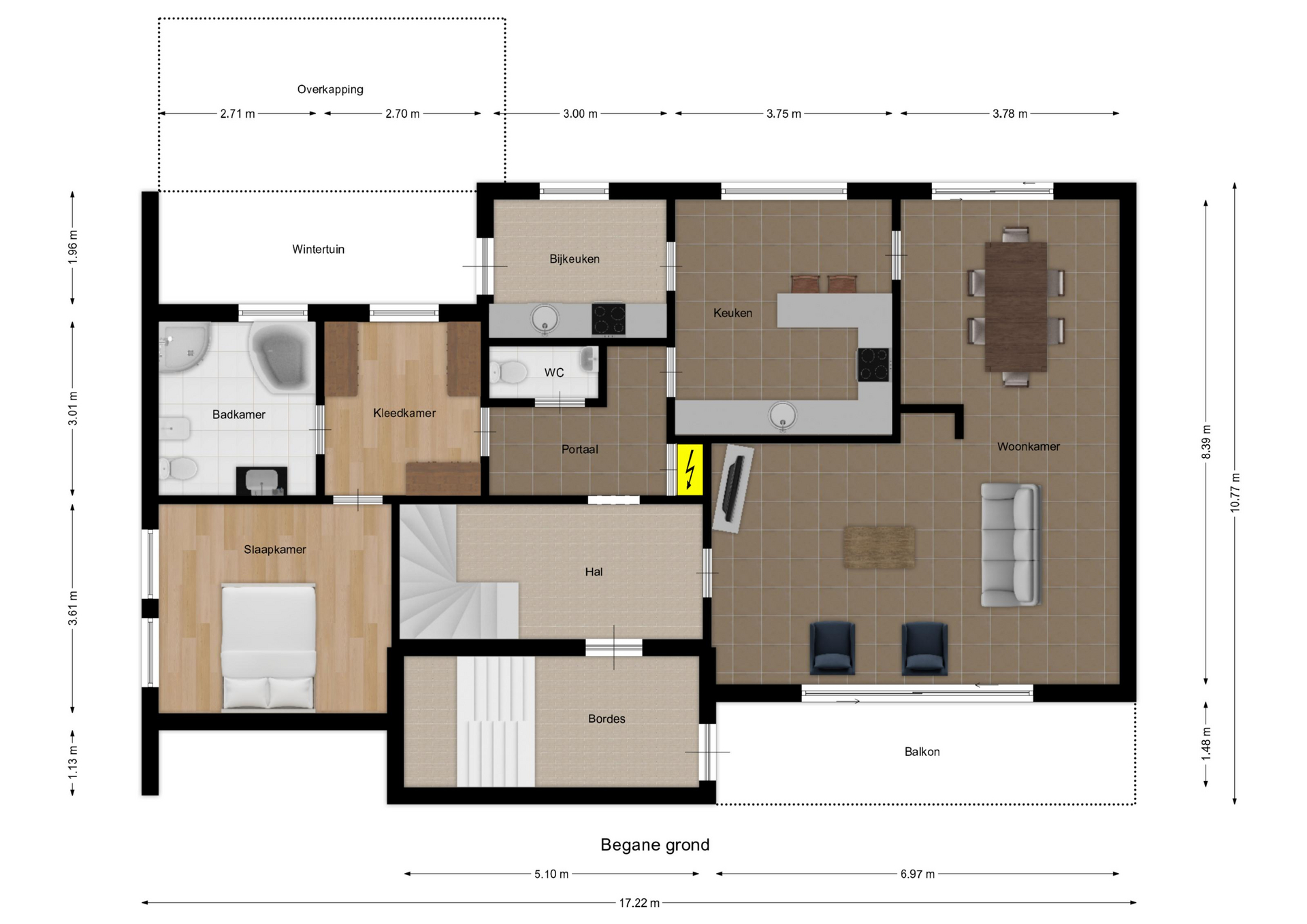 Het portaal met meterkast, gastentoilet en garderobe-nis biedt toegang tot de keuken en de kleedkamer.