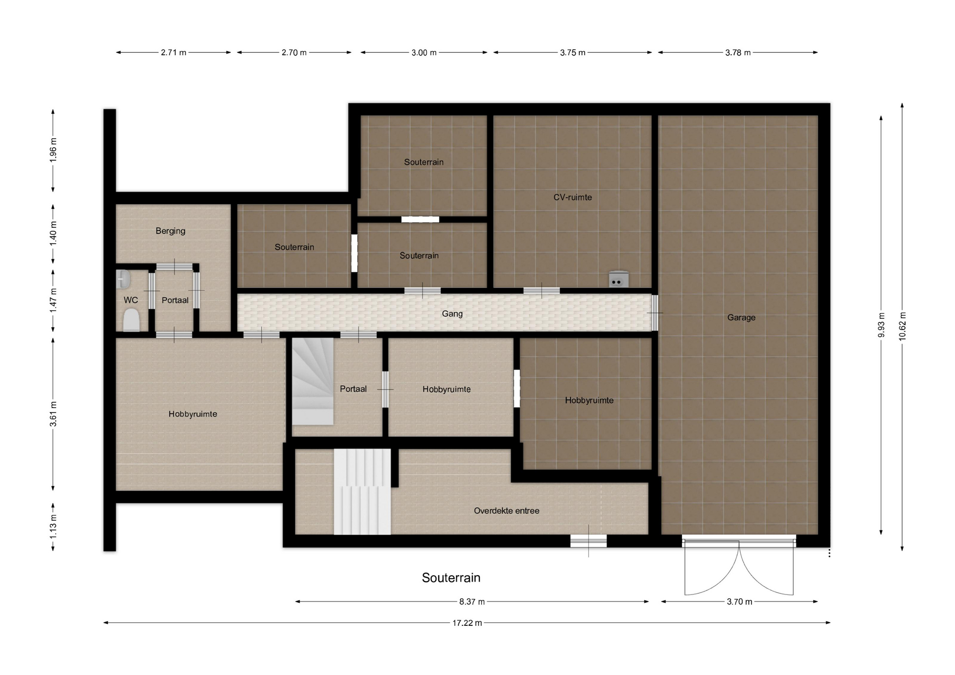Het portaal van het souterrain biedt toegang tot de eerste 2 hobbyruimtes welke ca. 10 m² en 7 m² groot zijn.