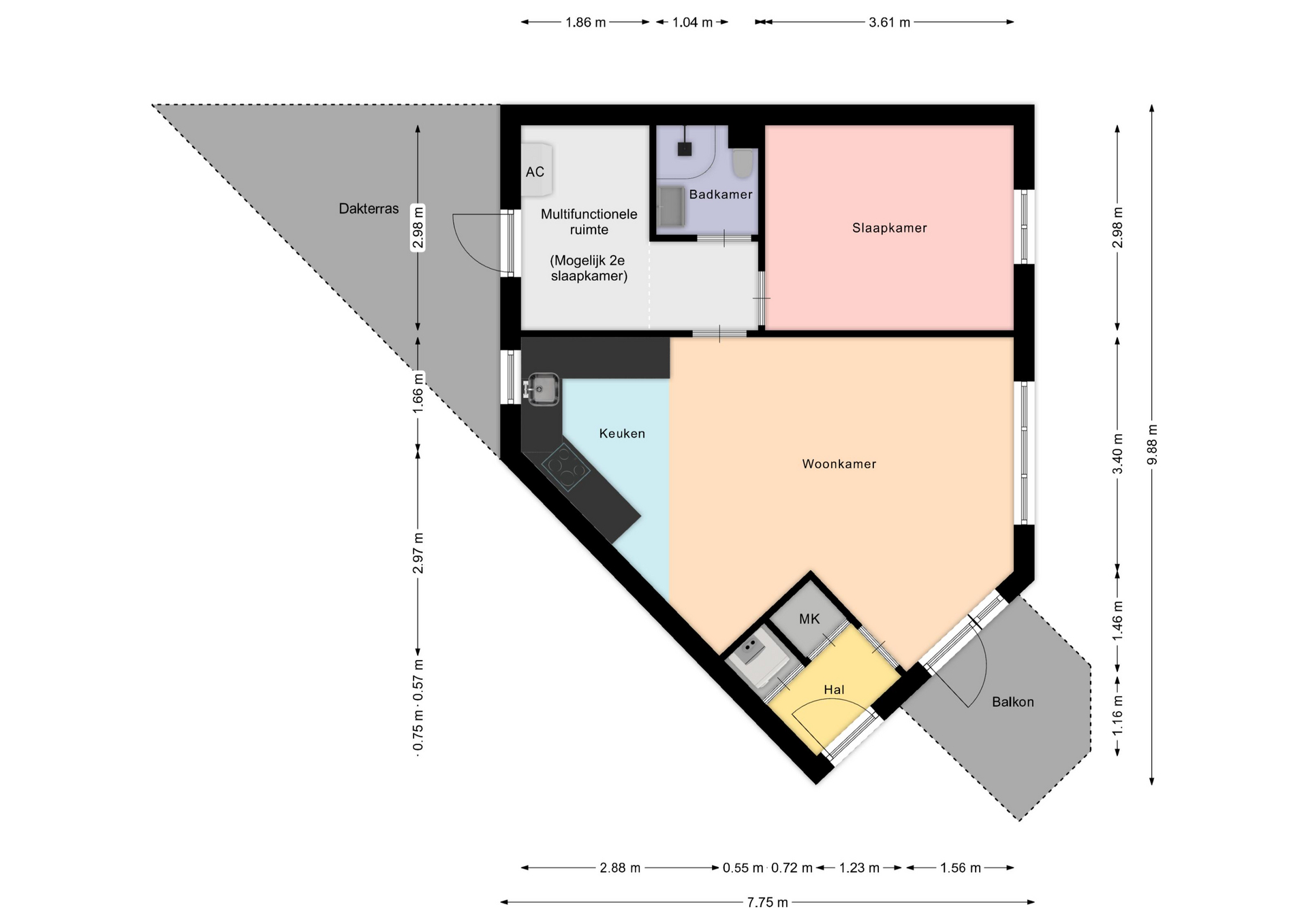 – Balkon aan voorzijde en dakterras aan achterzijde;