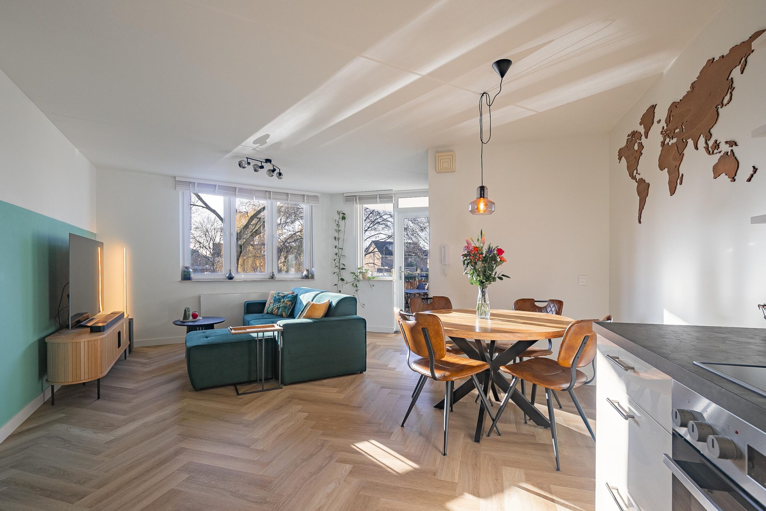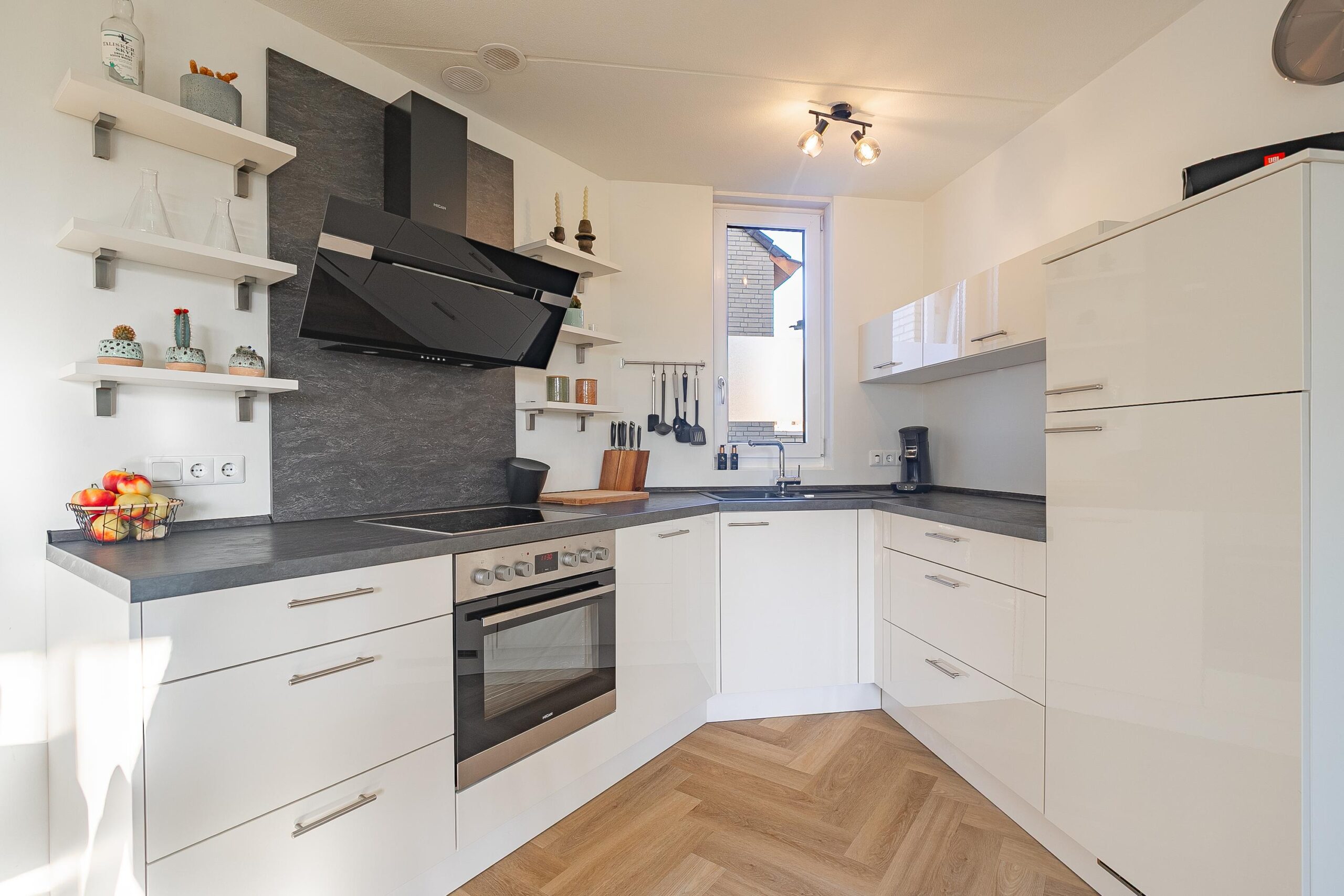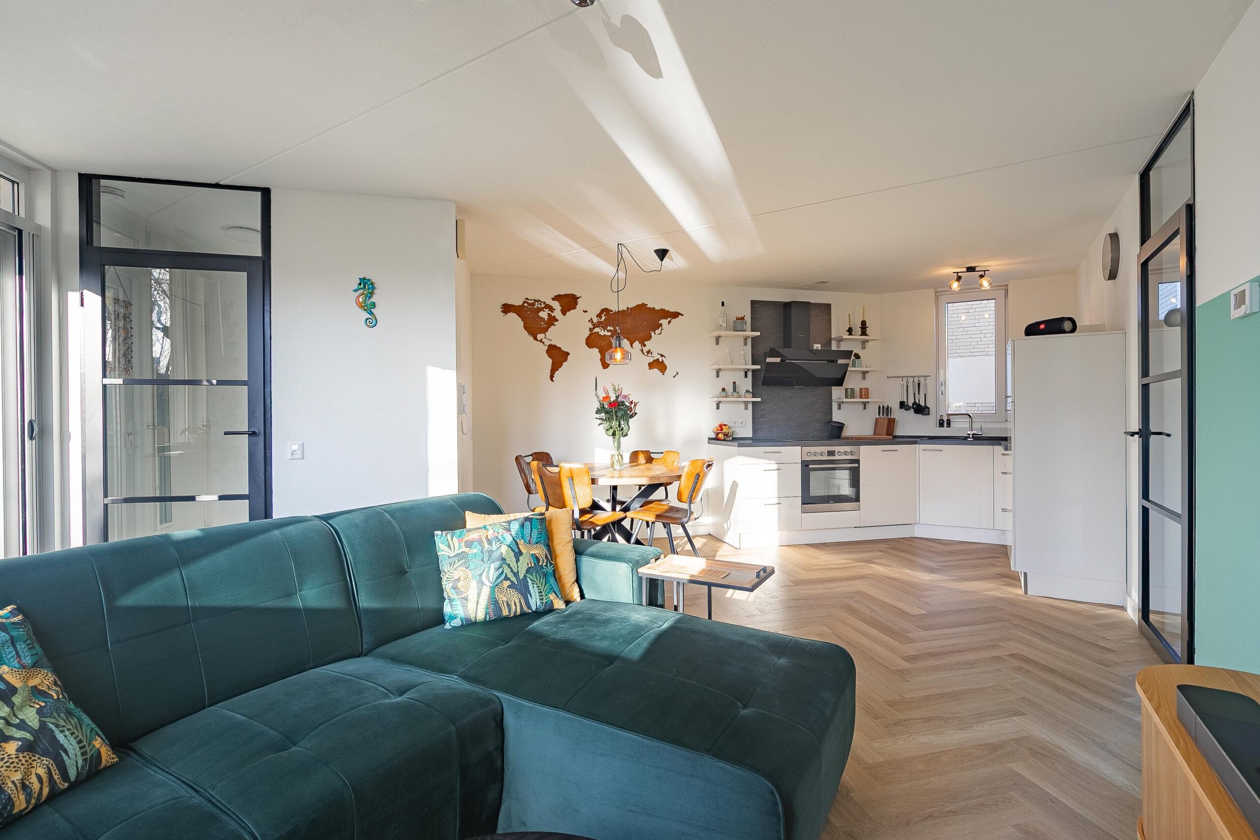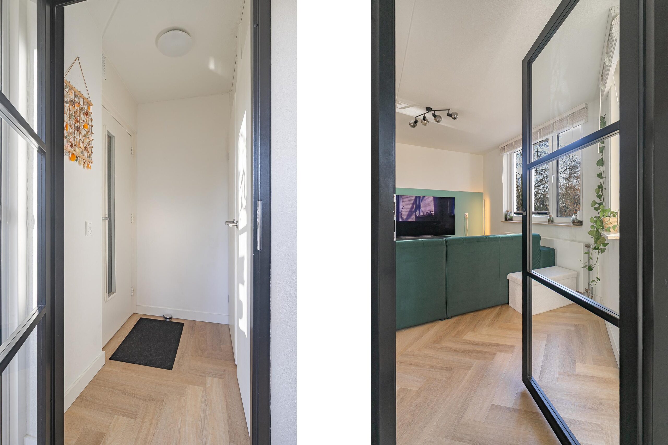 De entree biedt toegang tot de garderobe met meterkast, de woonkamer en de cv-/wasruimte met witgoedaansluitingen en de cv-opstelling (Remeha Avanta, eigendom, 2020). Via een moderne staallookdeur betreedt u de woonkamer met open keuken (totaal ca. 27 m²). Vanuit deze ruimte is er toegang tot het balkon aan de voorzijde (ca. 5 m²), waar u geniet van een vrij uitzicht over de groene omgeving.