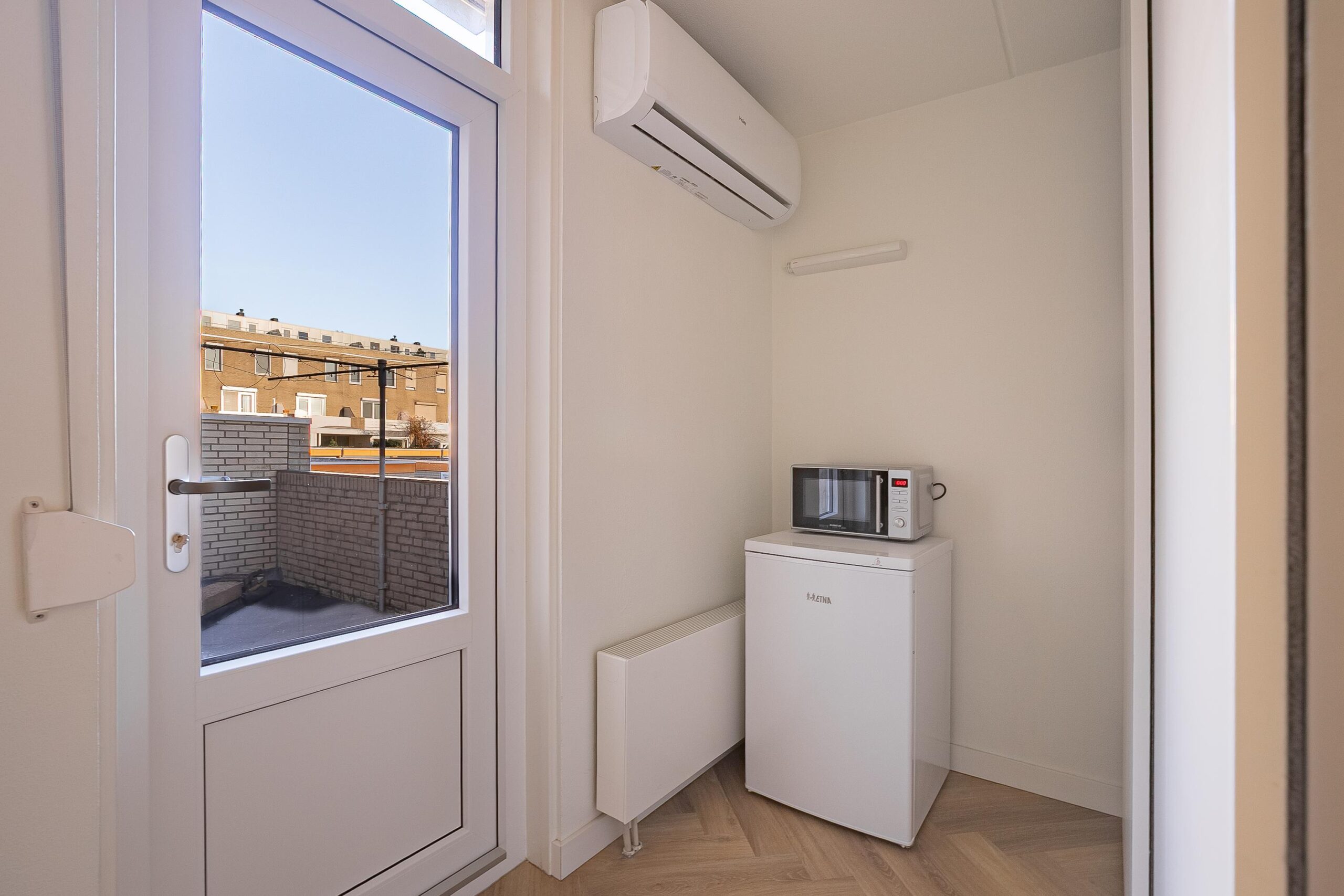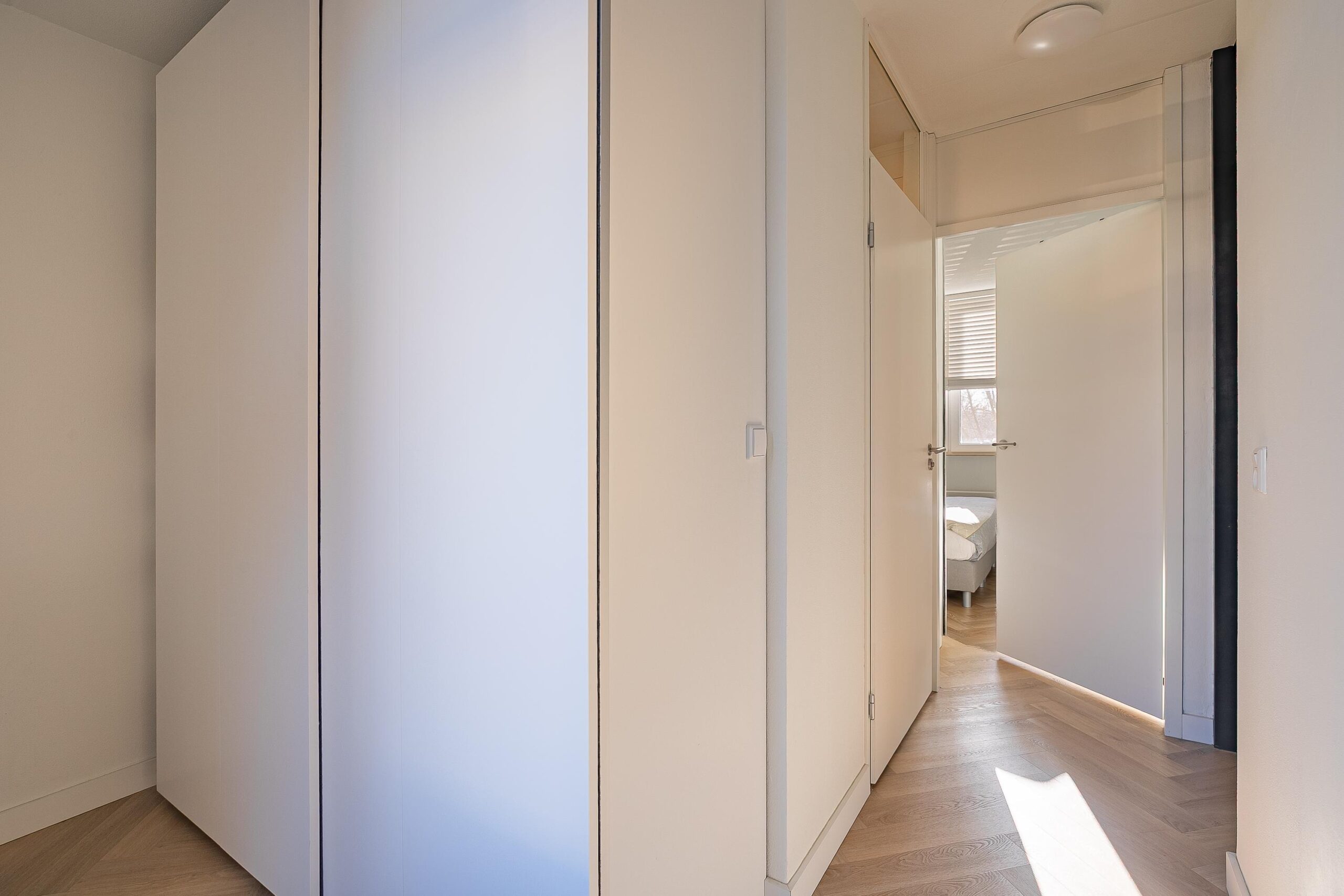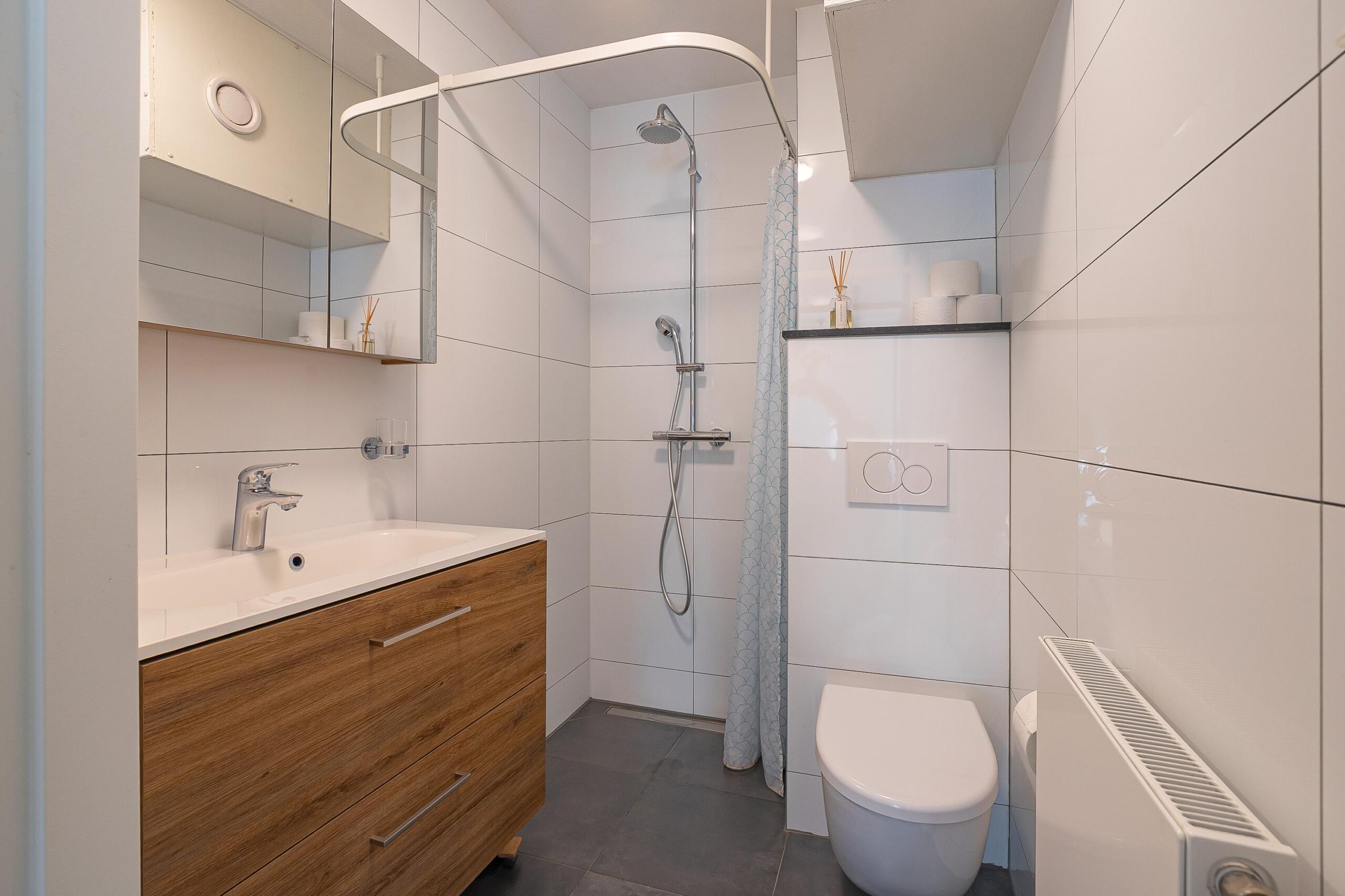 Via de tussenhal, voorzien van airconditioning, zijn de slaapkamer (ca. 11 m²), de badkamer en het dakterras bereikbaar. De moderne badkamer (ca. 2,5 m²) is uitgevoerd met een nette tegelvloer, een wandcloset, een wastafelmeubel en een inloopdouche. Het dakterras (ca. 13 m²) ligt aan de achterzijde van het appartement en biedt een fijne, beschutte buitenruimte.