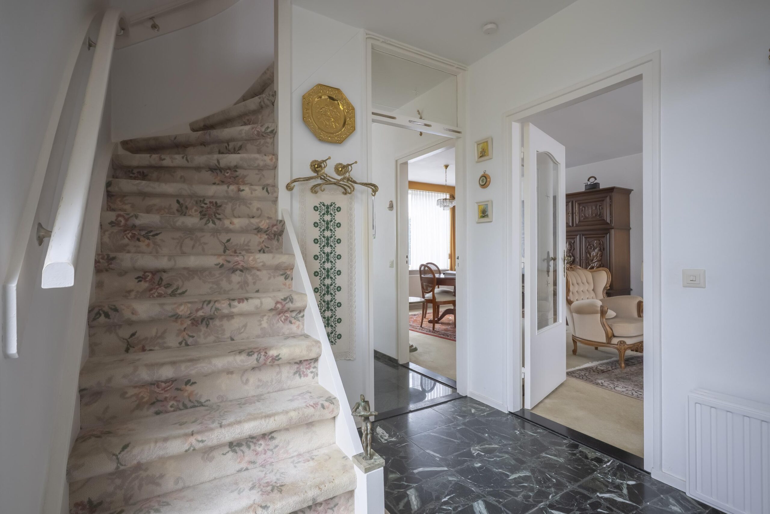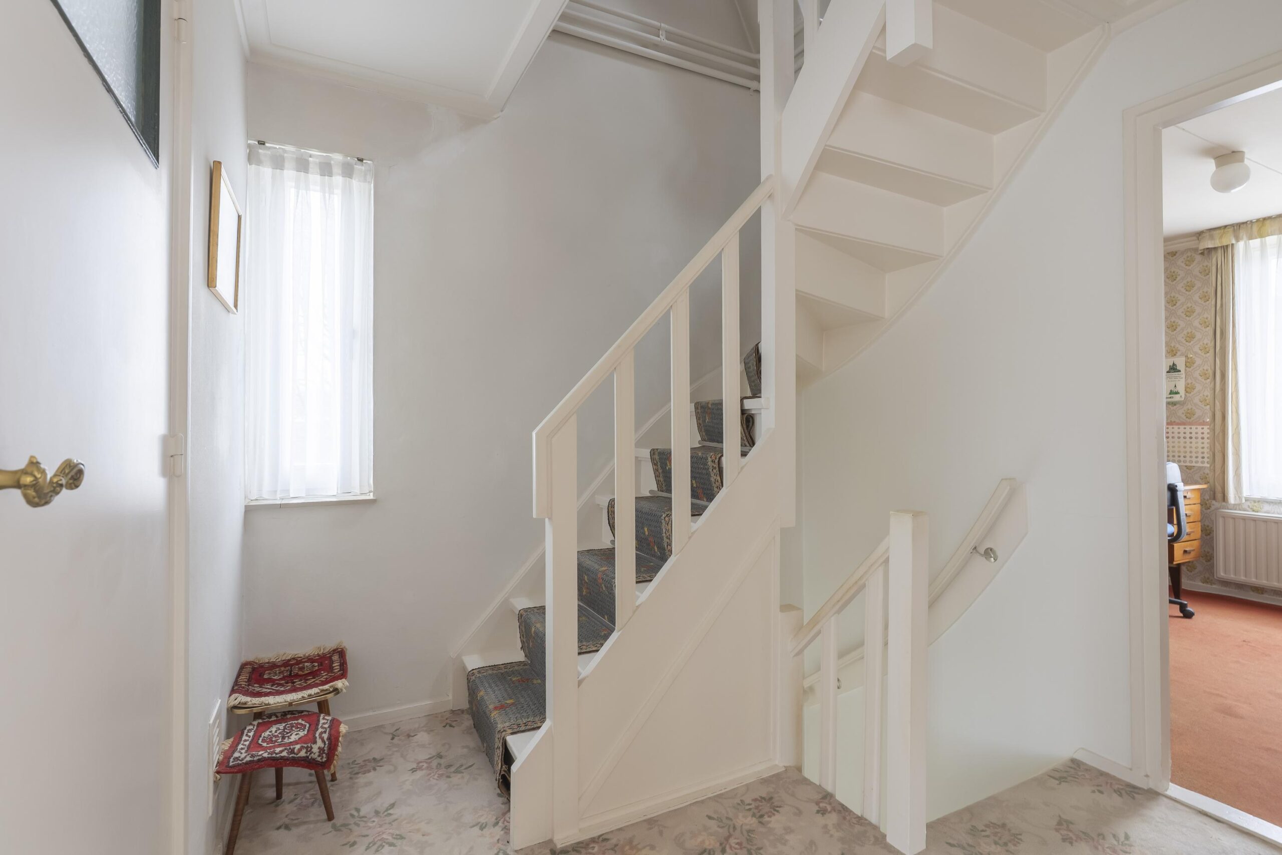 Middels de hal/entree met meterkast, trapopgang en deels betegelde toiletruimte met staand toilet en fonteintje kunt u de woonkamer en de gesloten keuken bereiken.