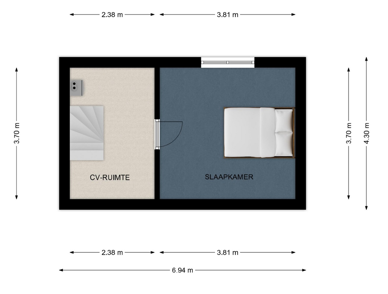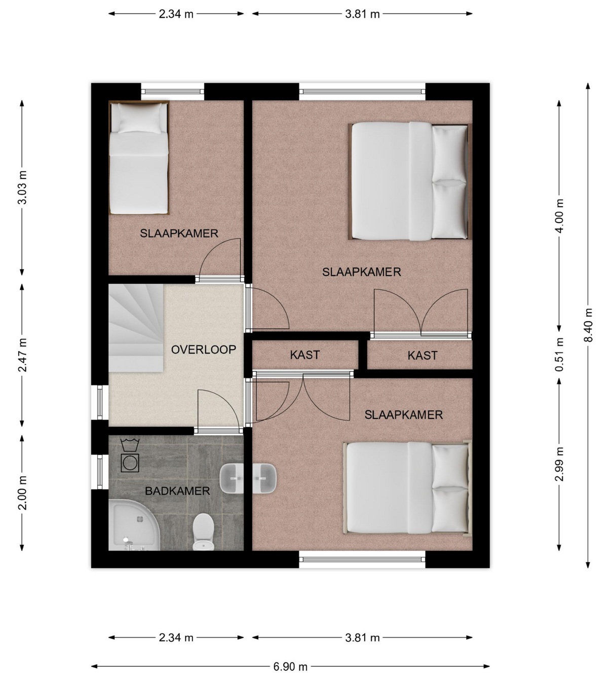 De slaapkamers zijn voorzien van vloerbedekking en zijn respectievelijk groot ca. 15 m², 11 m² en 7 m².