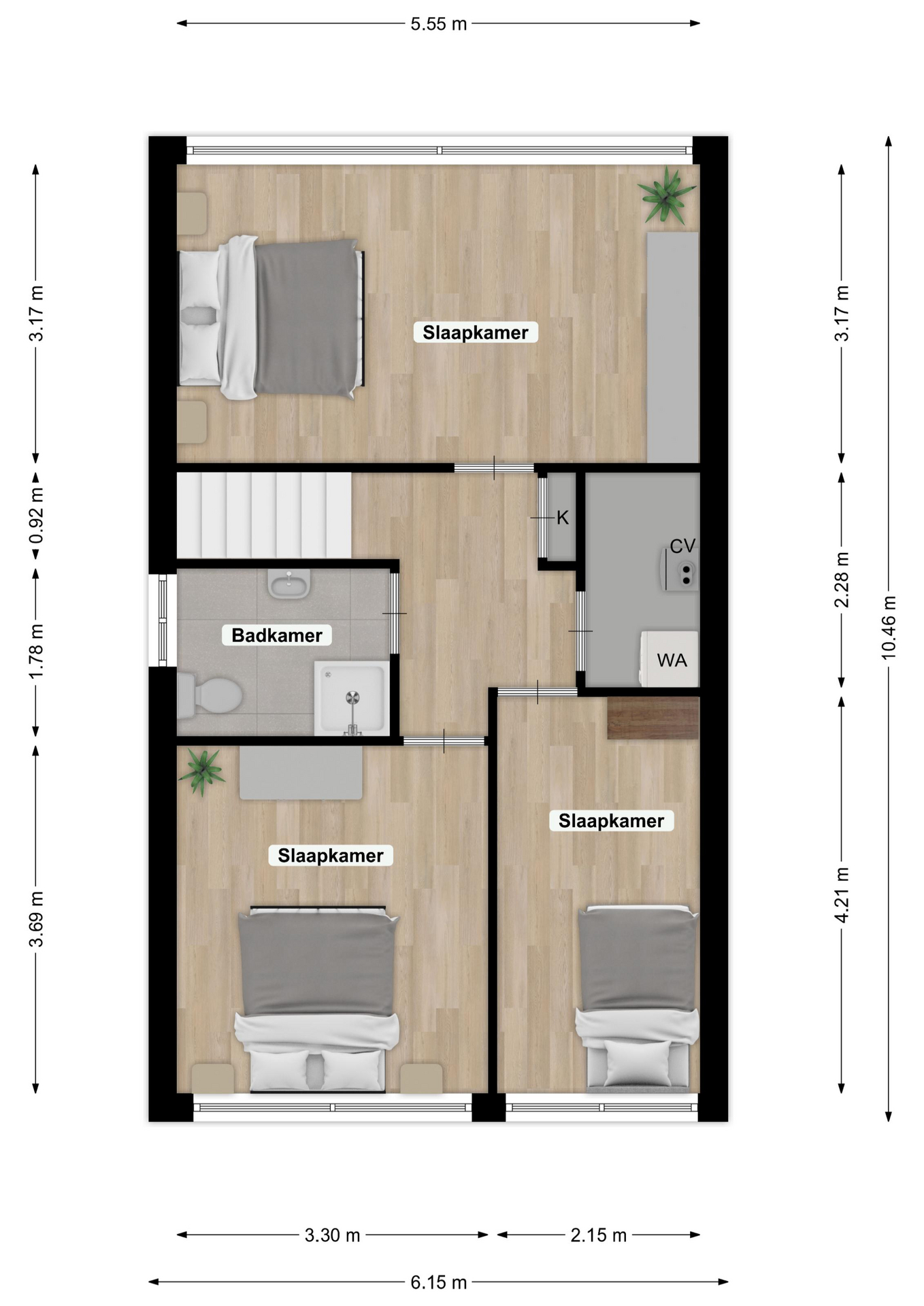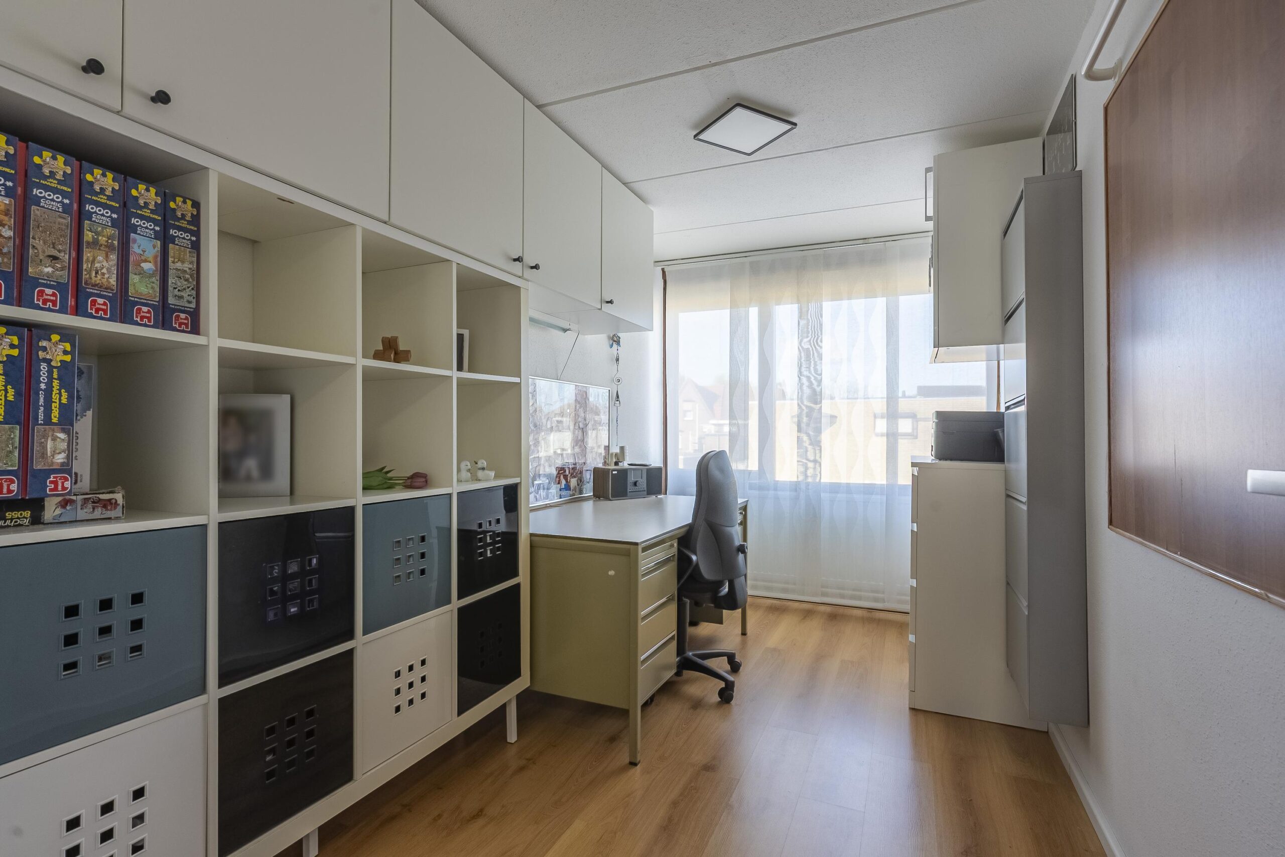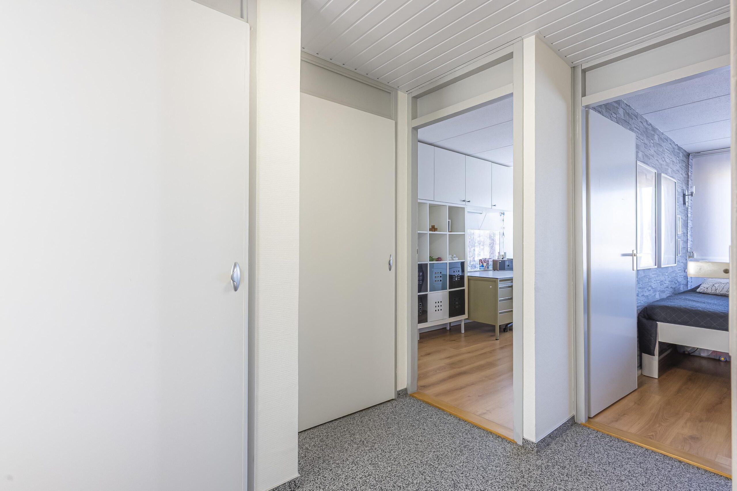 De overloop biedt toegang tot drie ruime slaapkamers, elk voorzien van moderne laminaatvloeren en rolluiken.
