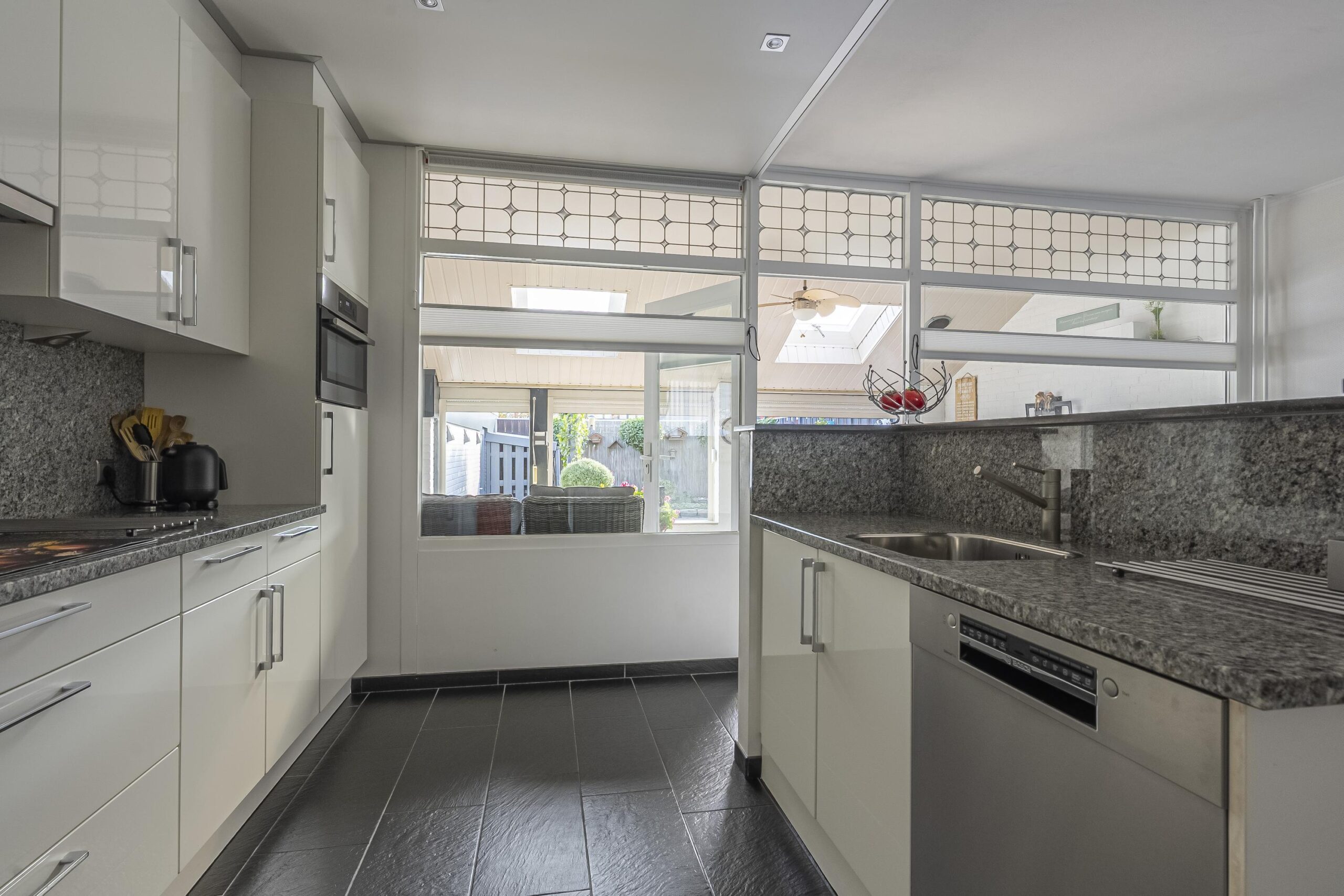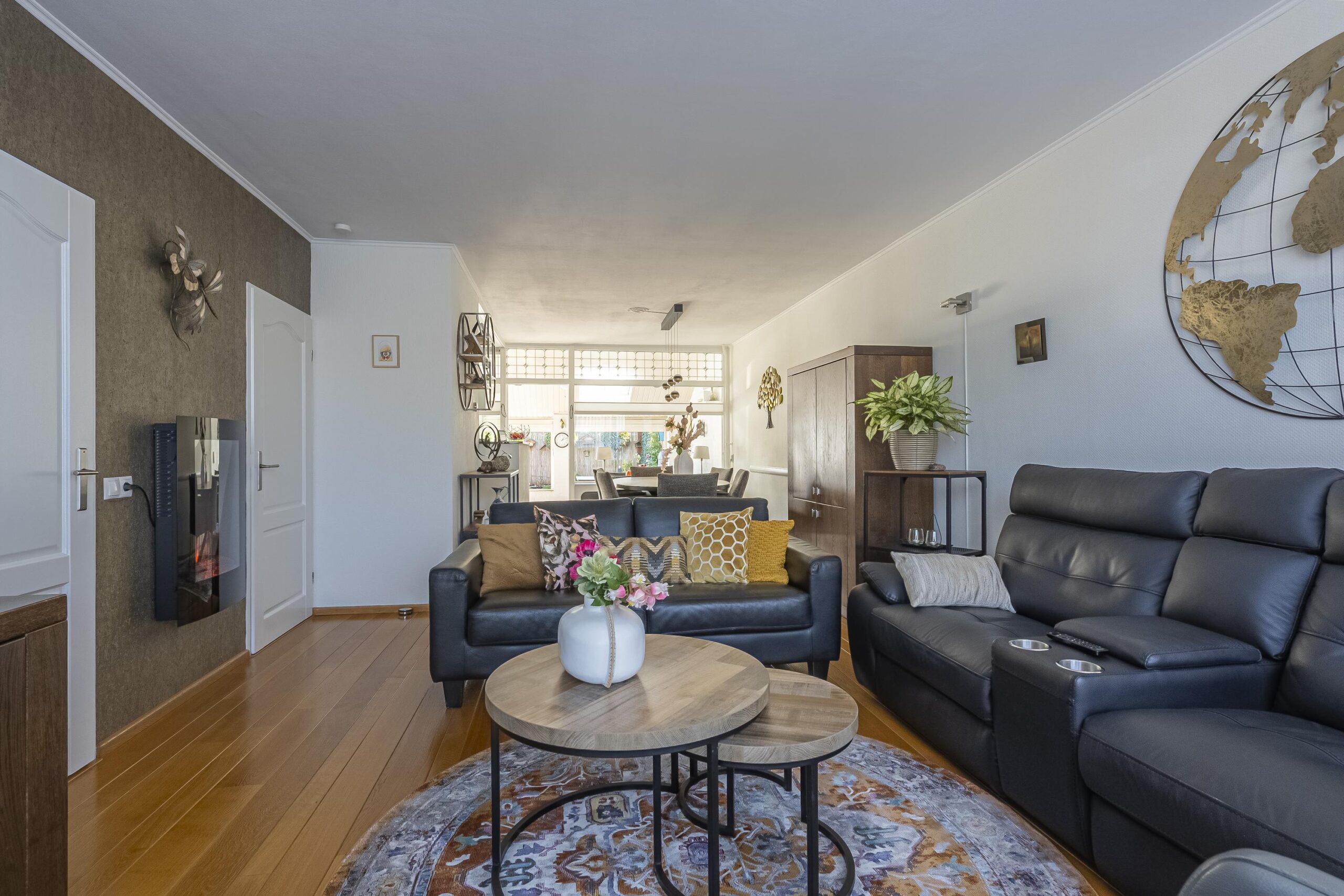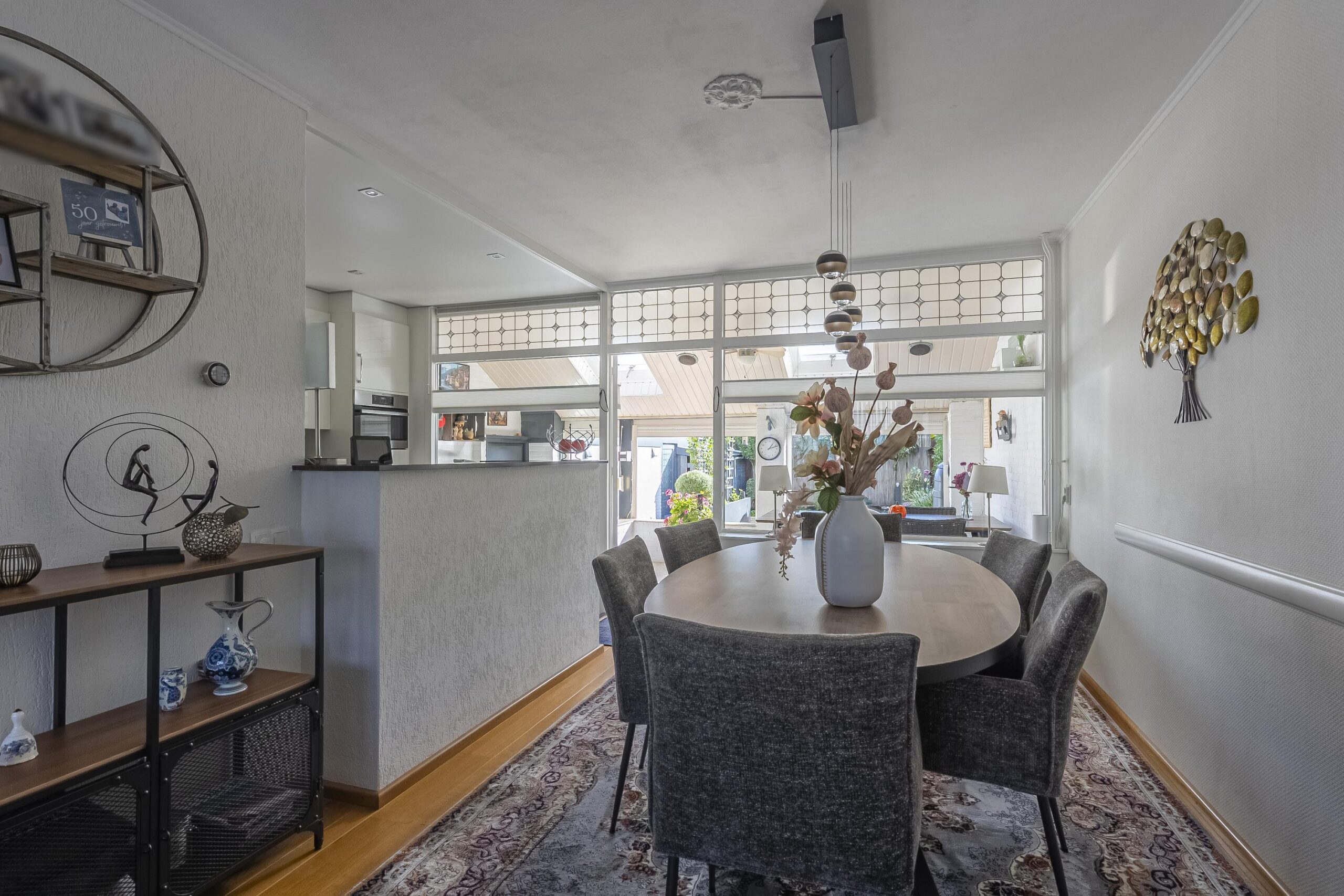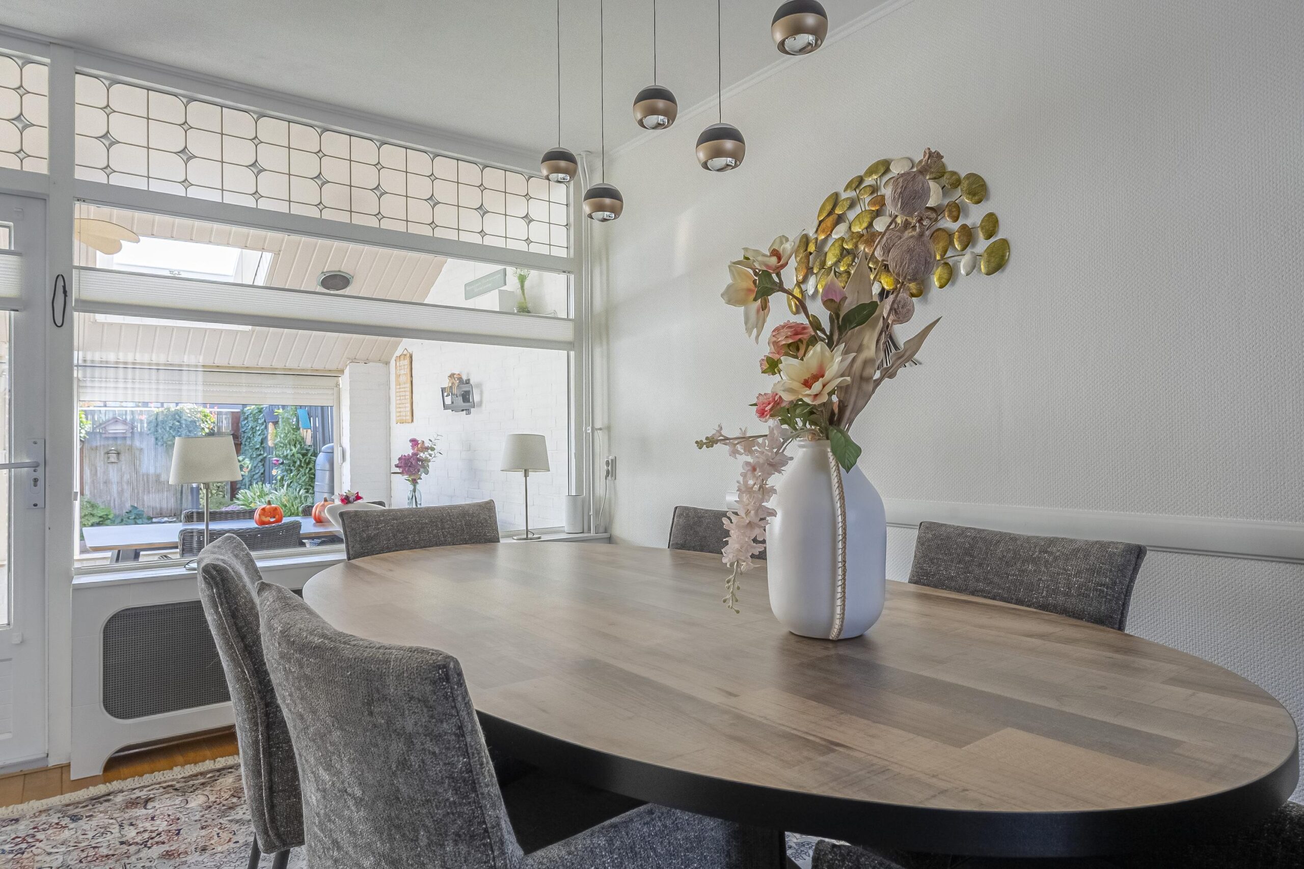 De sfeervolle doorzonwoonkamer is uitstekend onderhouden en voorzien van een fraaie parketvloer. Dankzij de grote raampartijen geniet u hier van een prettige lichtinval aan voor en achterzijde. De eetkamer en open keuken staan in directe verbinding met elkaar, wat zorgt voor een ruimtelijk en gezellig geheel.