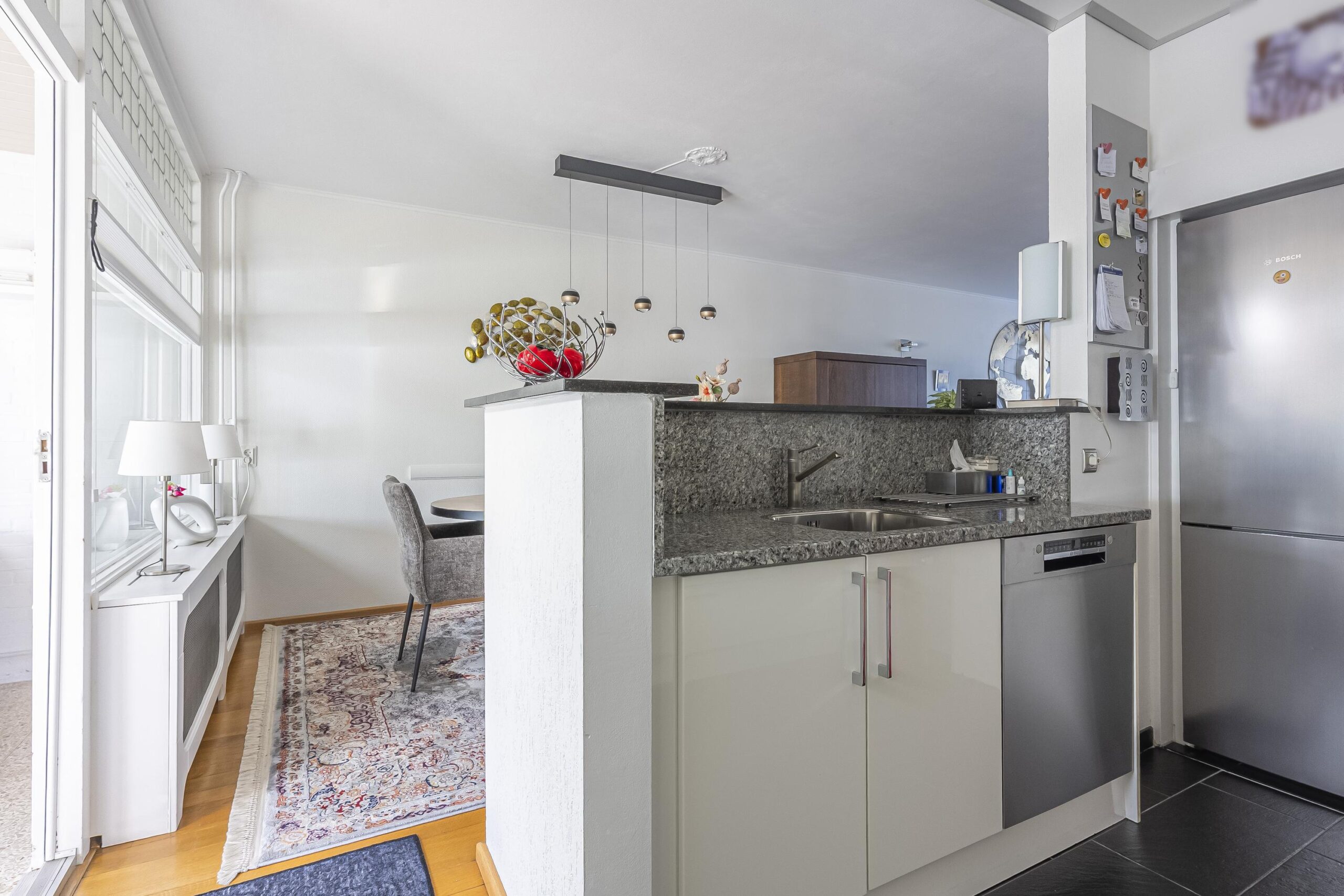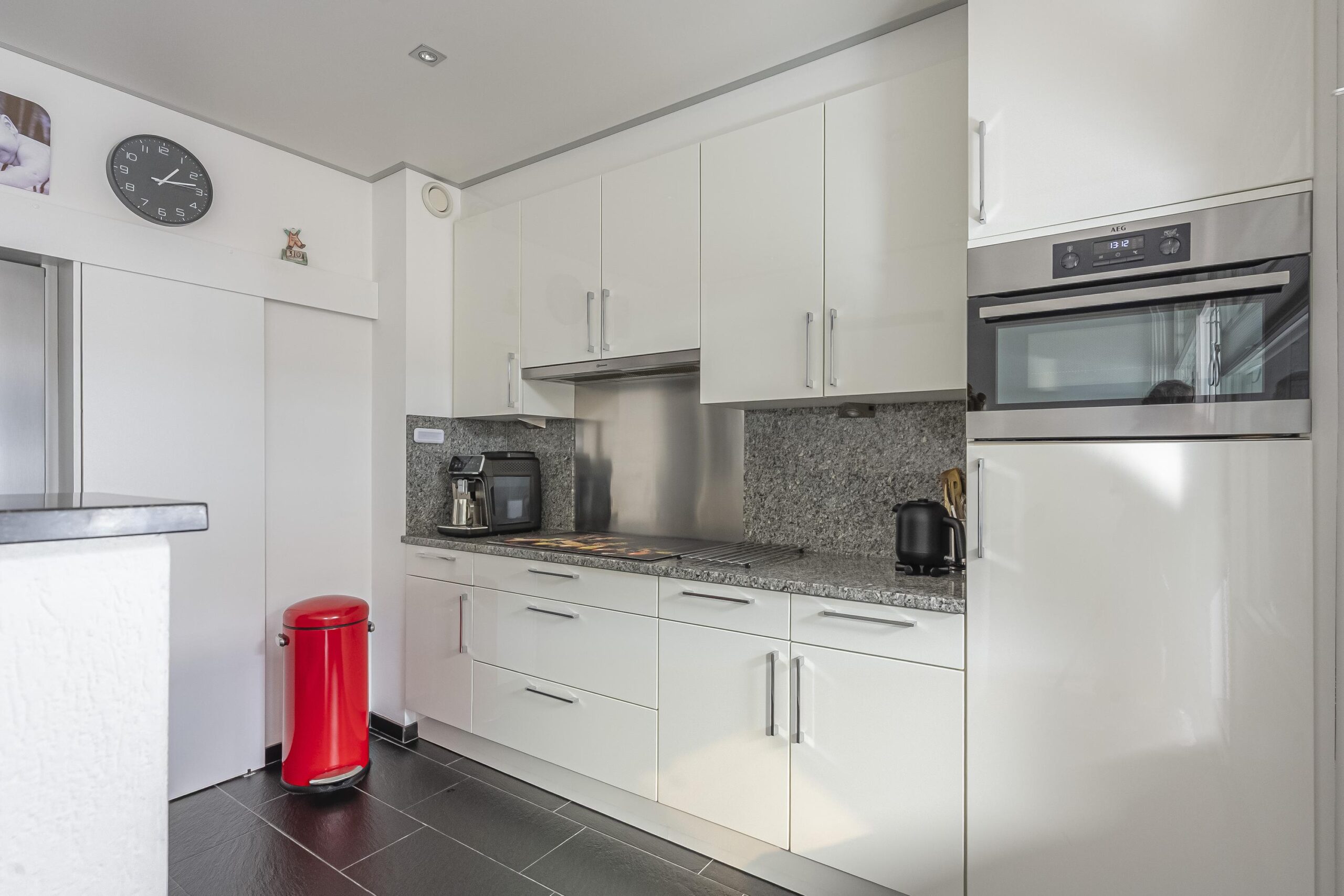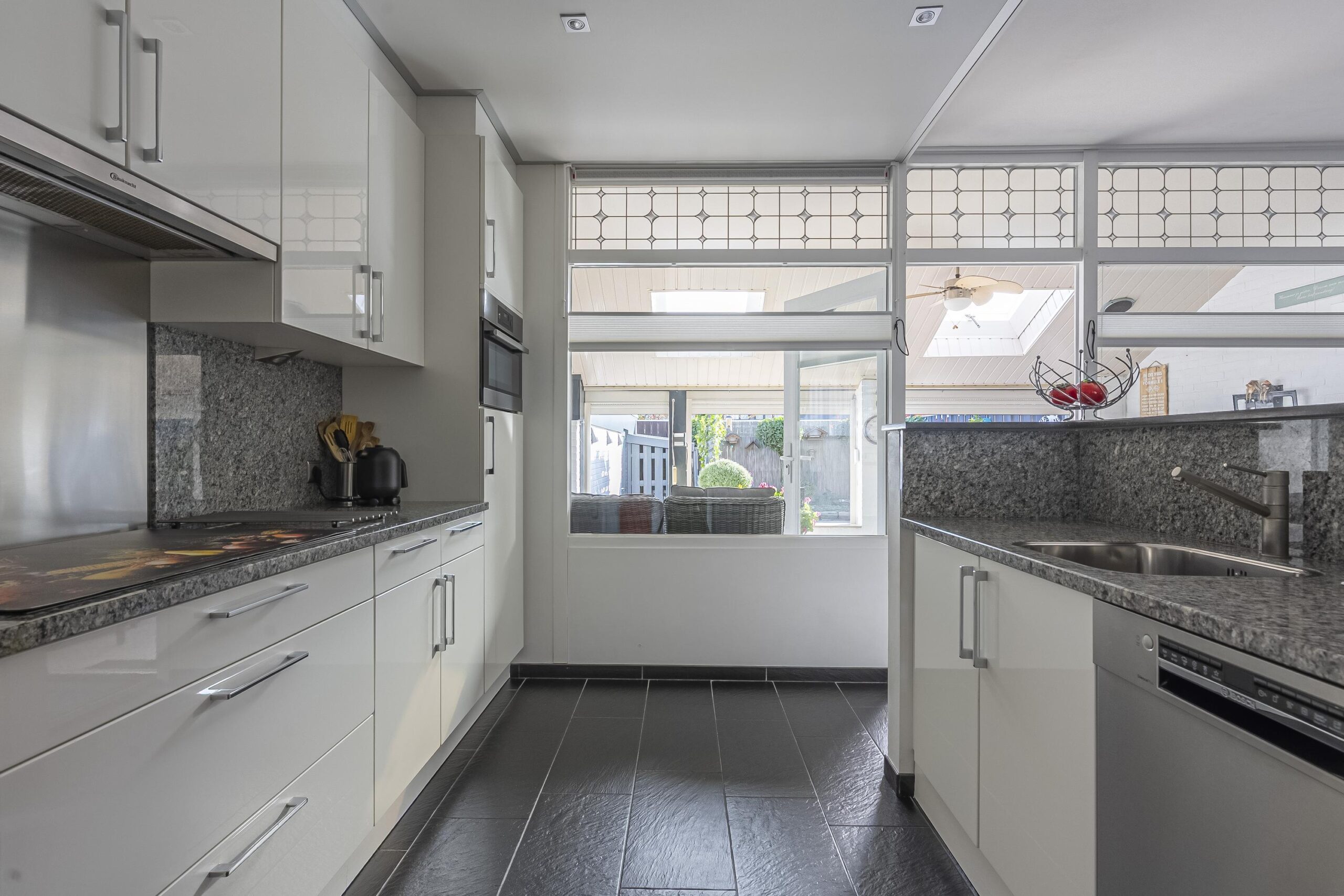 De moderne, hoogglans witte keuken is uitgerust met diverse inbouwapparatuur, waaronder een combimagnetron, 5-pits inductiekookplaat, afzuigkap, vaatwasser en koel-vriescombinatie. Achter een schuifwand bevindt zich een handige provisieruimte.