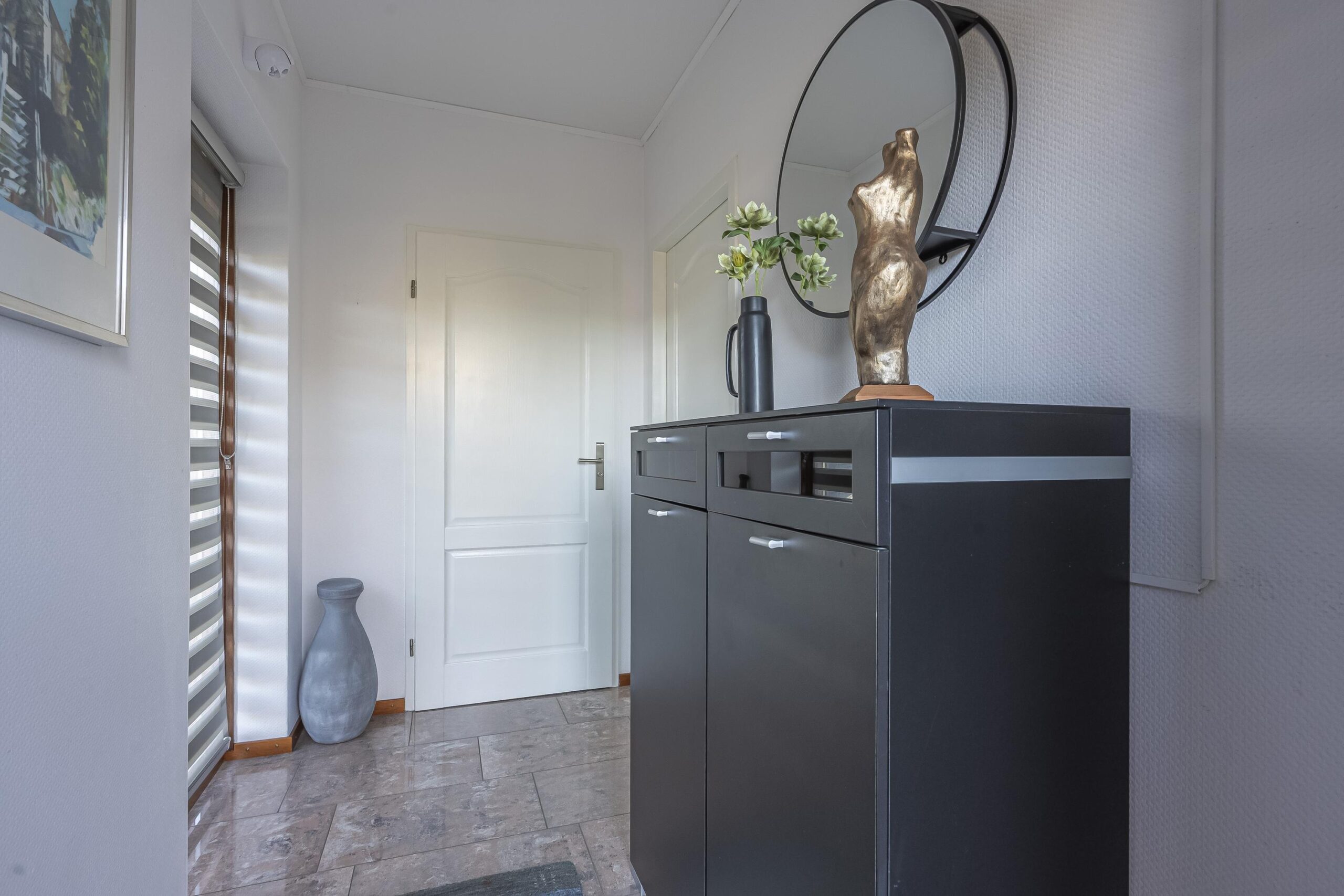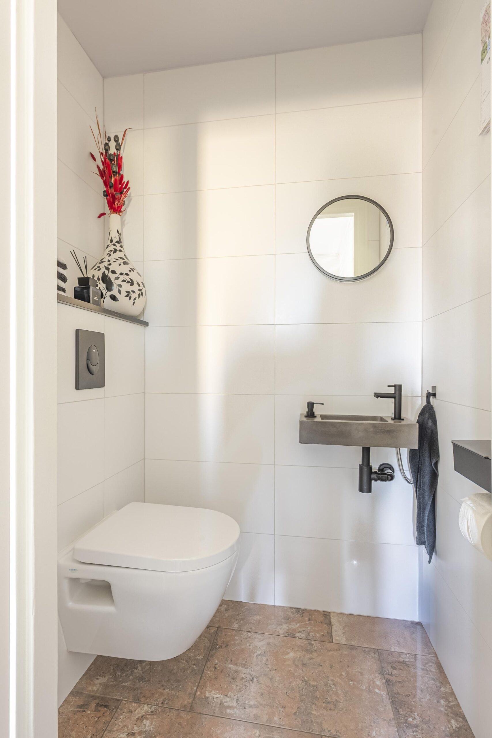 Via de moderne, onderhoudsvriendelijke voortuin en trappartij bereikt u de entree van de woning. In de ontvangsthal bevinden zich de vernieuwde meterkast, een designradiator en het geheel betegelde, modern vrijhangend toilet, fonteintje en mechanische afzuiging.