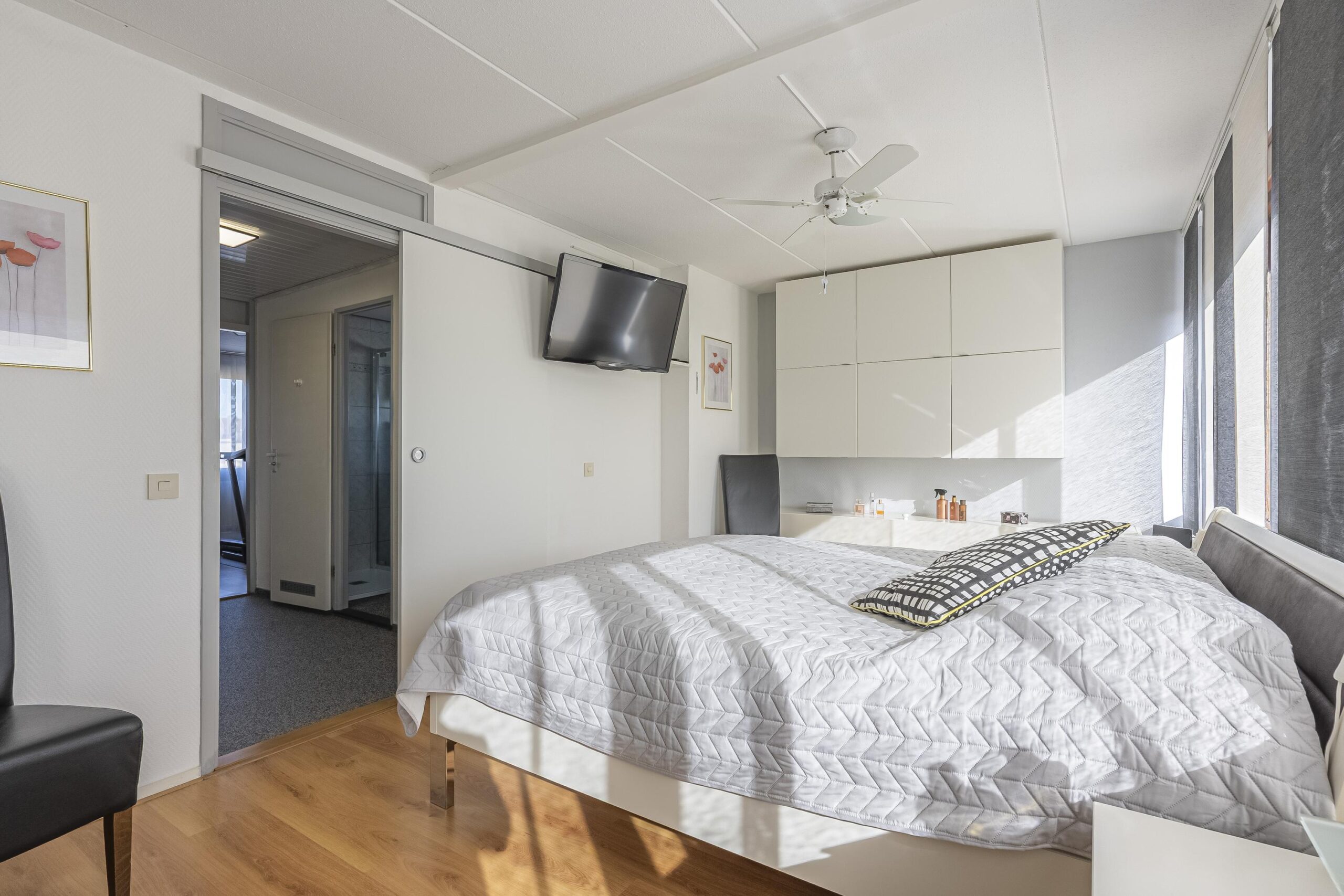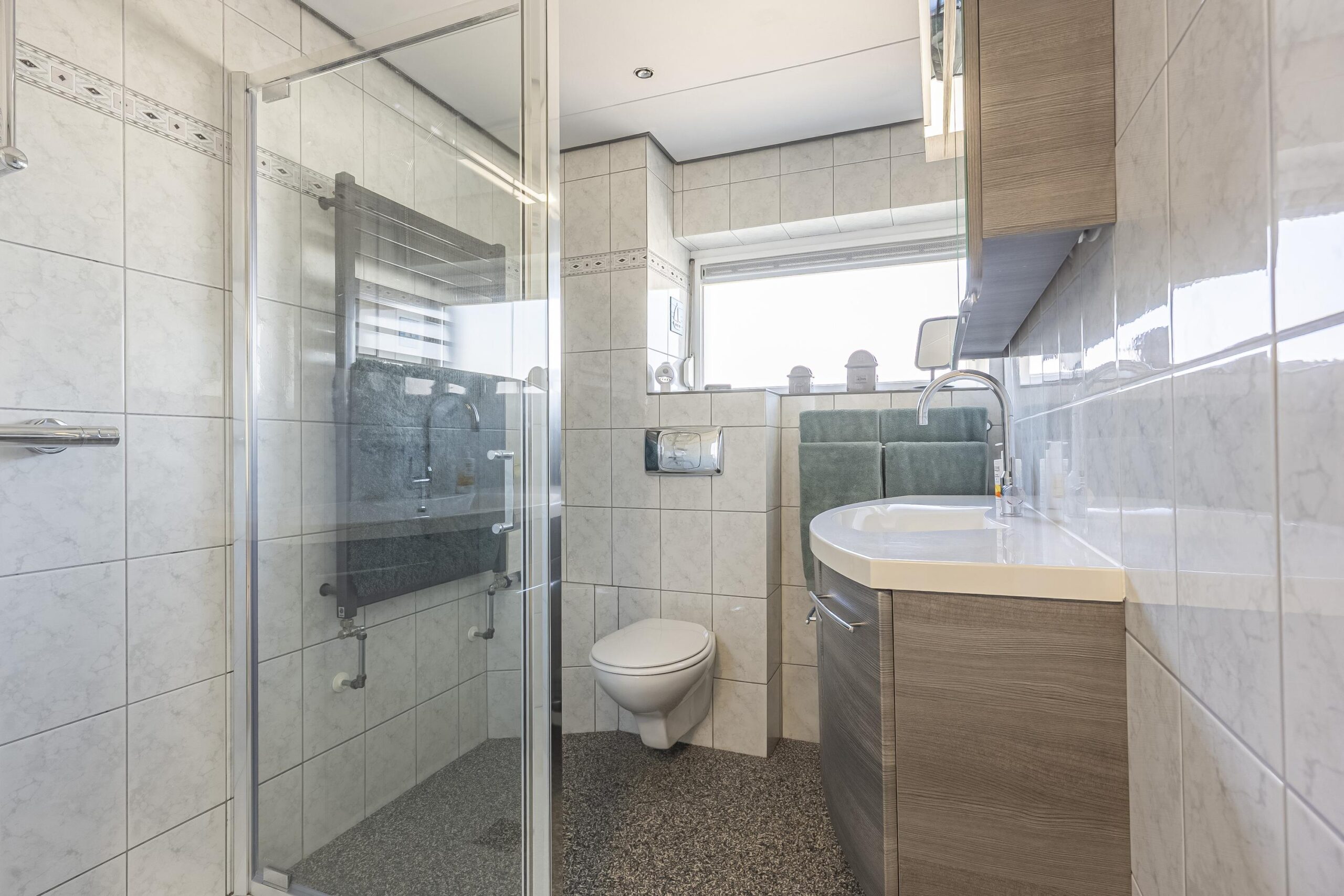 De geheel betegelde badkamer is modern ingericht en beschikt over een tweede vrijhangend toilet, een inloopdouche met hardglazen douchewand, een brede wastafel met spiegelkast, een handdoekradiator, raam met dauerlufting en mechanische afzuiging.