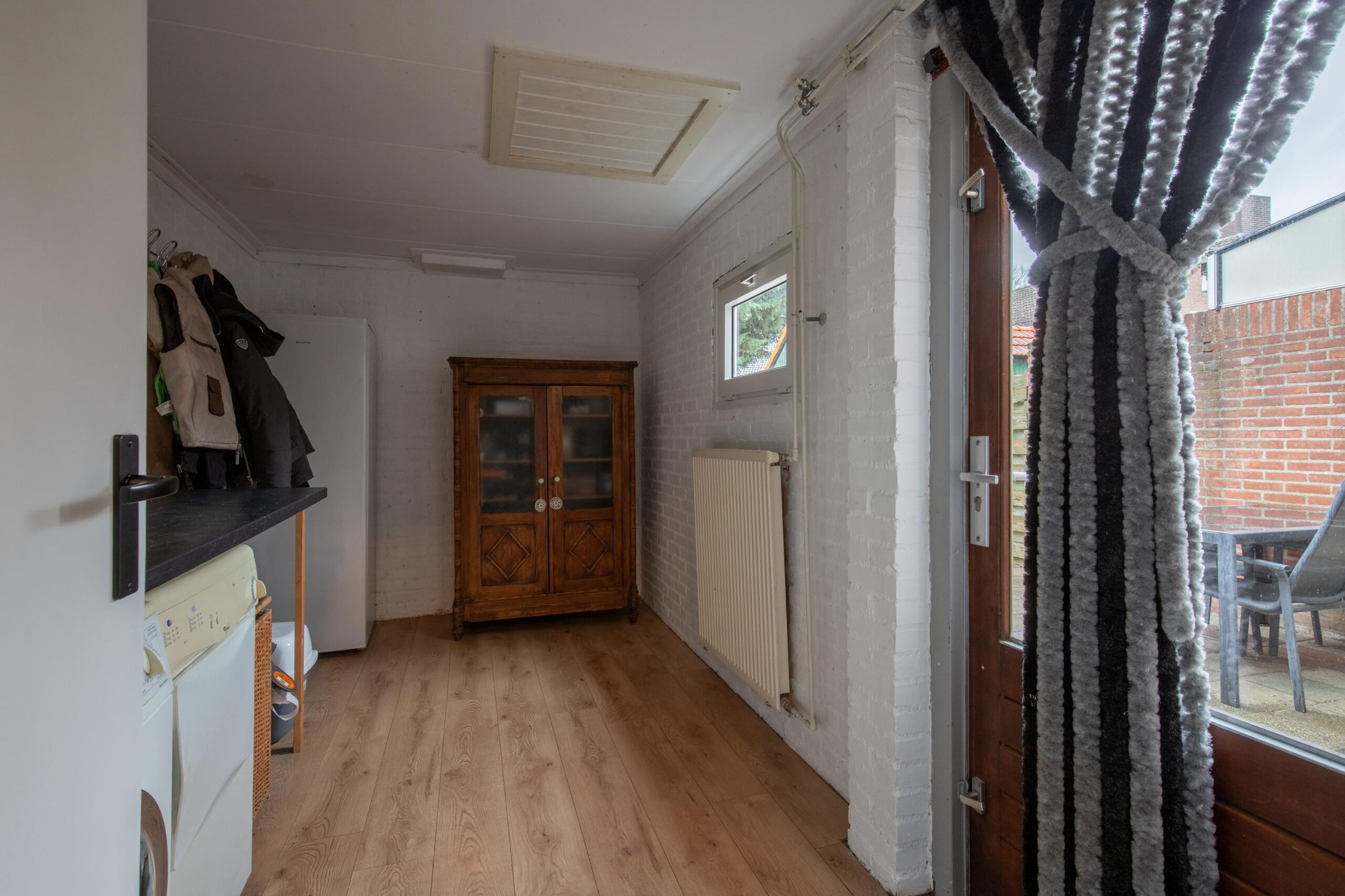 De voortuin is onderhoudsvriendelijk aangelegd en er is een lange oprit waar makkelijk twee auto’s geparkeerd kunnen worden. Hal/entree voorzien van een laminaatvloer met vernieuwde meterkast, toiletruimte, meterkast en beklede trapopgang naar eerste verdieping. De lichte woonkamer is 6.87 x 3.74 en is voorzien van een eigentijdse laminaatvloer. De halfopen keuken heeft een groot raam, waardoor het hier ook fijn licht is. Er is een neutrale, witten keukeninstallatie voorzien van de volgende inbouwapparatuur: gaskookplaat, afzuigkap, koelkast, combi-oven en vaatwasser. De totale oppervlakte van woonkamer en keuken is circa 31 m². Vanuit de keuken is er toegang tot een handige bijkeuken 4.00 x 2.23, hier zijn o.a. de aansluitpunten voor de wasapparatuur.