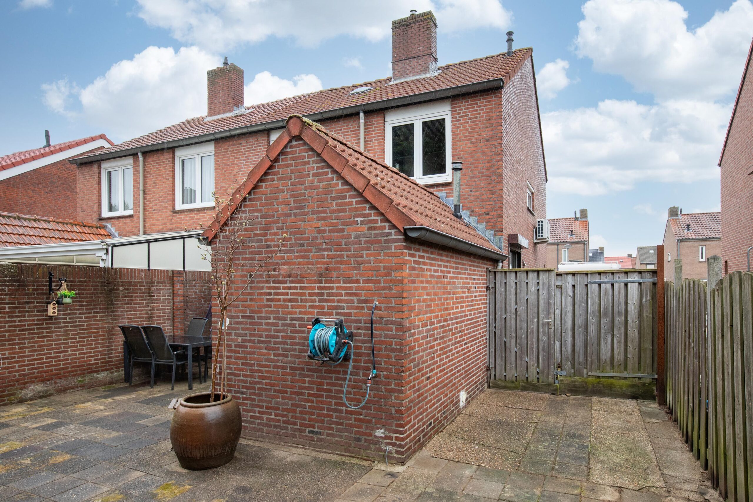 Deze woning beschikt over een ruime achtertuin, deze is vanaf de achtergevel gemeten ongeveer 15 meter diep. De tuin is geheel omsloten en door de coniferen van de achterburen is er veel privacy in deze tuin. De tuin is gelegen op het noordwesten en hier is de hele dag een plekje in de zon en in de schaduw te vinden.