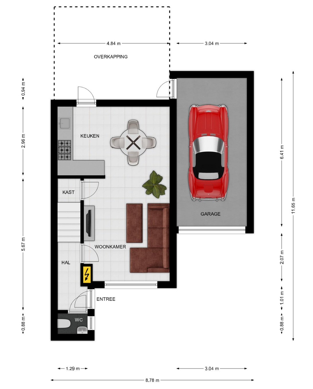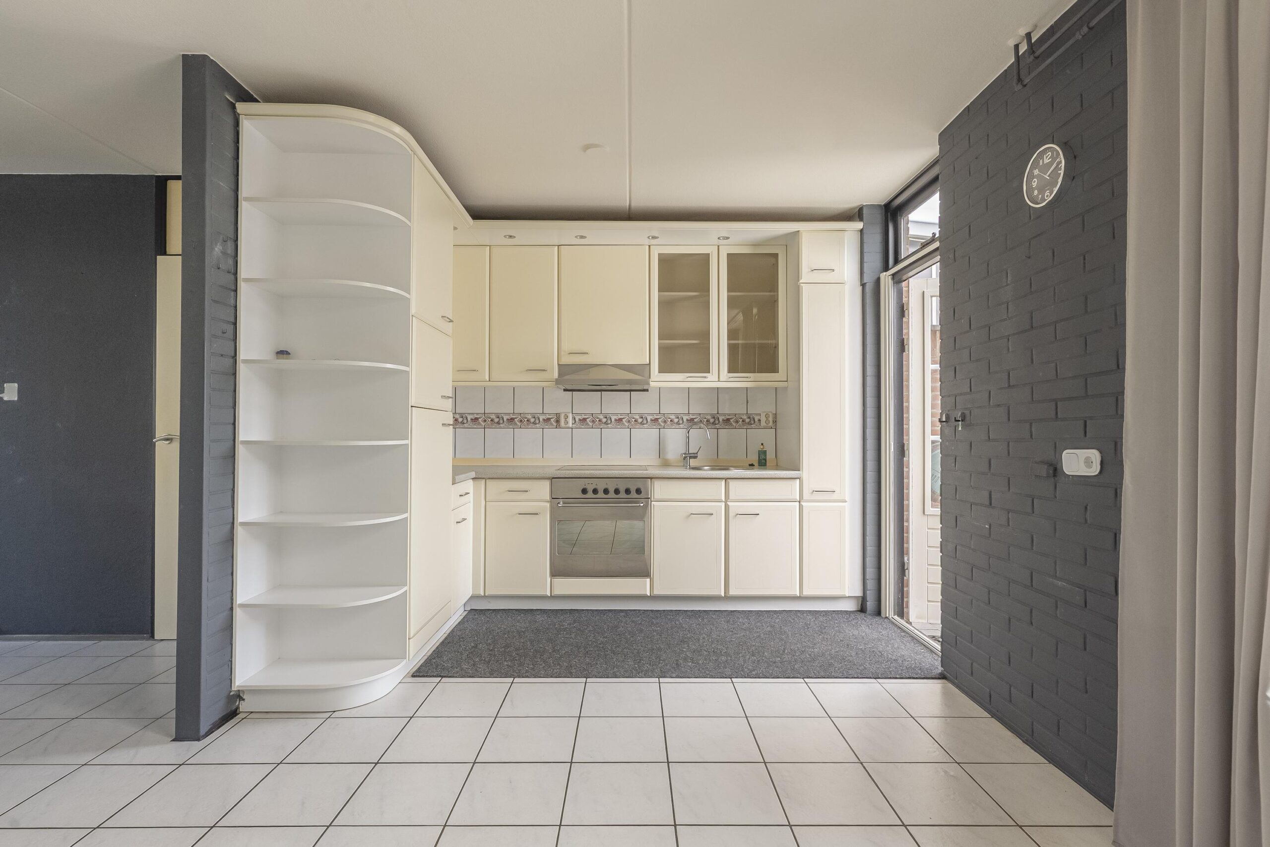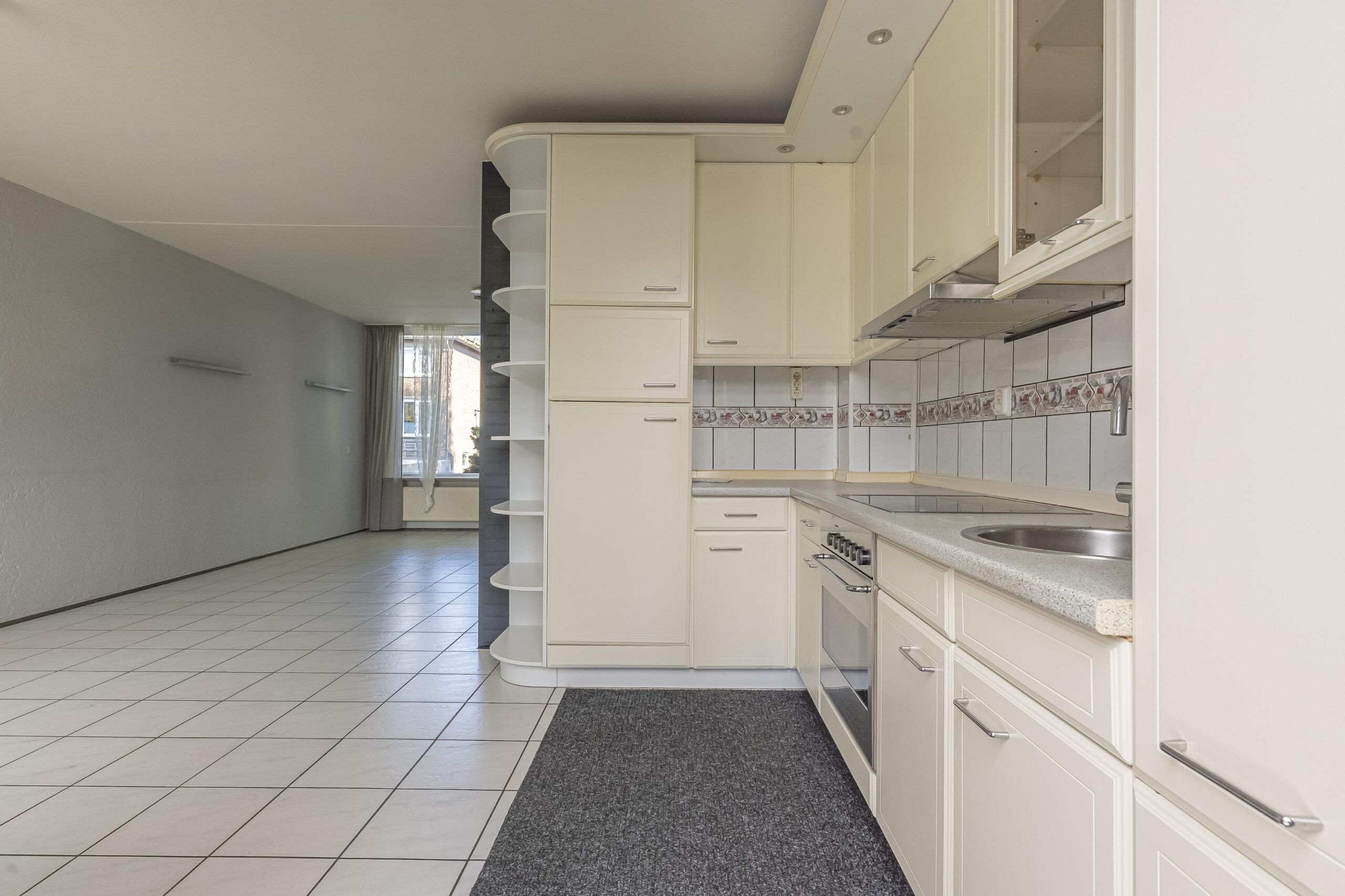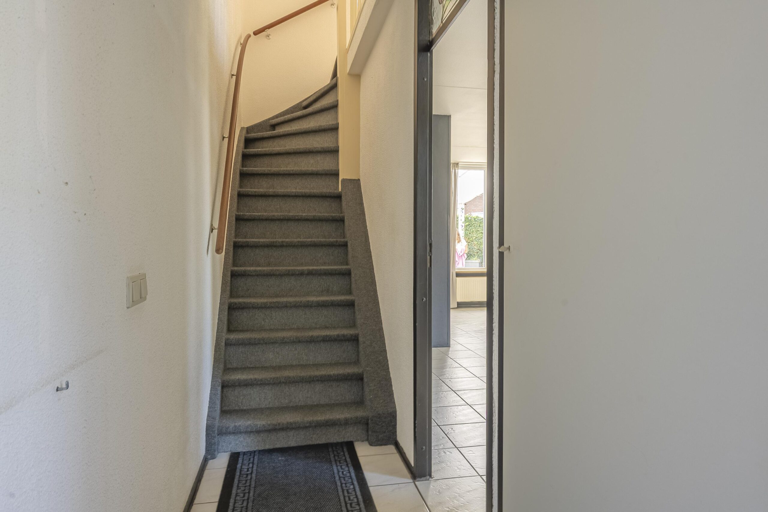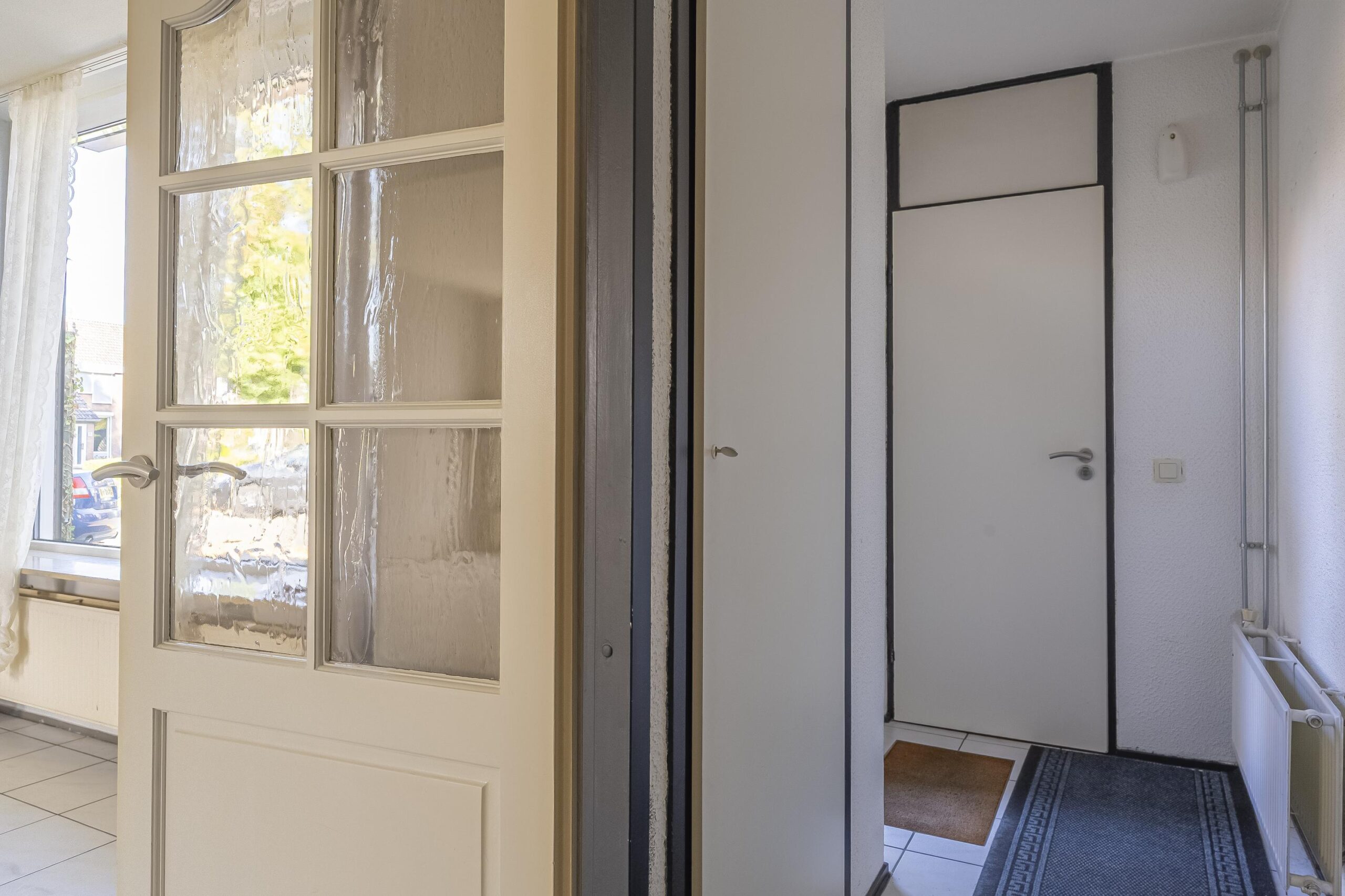 Begane grond: voortuin, entree, hal met tegelvloer, meterkast en het betegelde toilet met fonteintje. De woonkamer heeft ook een tegelvloer, een bergkast onder de trap en een open keuken met een installatie in hoekopstelling voorzien van een keramische kookplaat, oven, afzuigkap en koelkast.