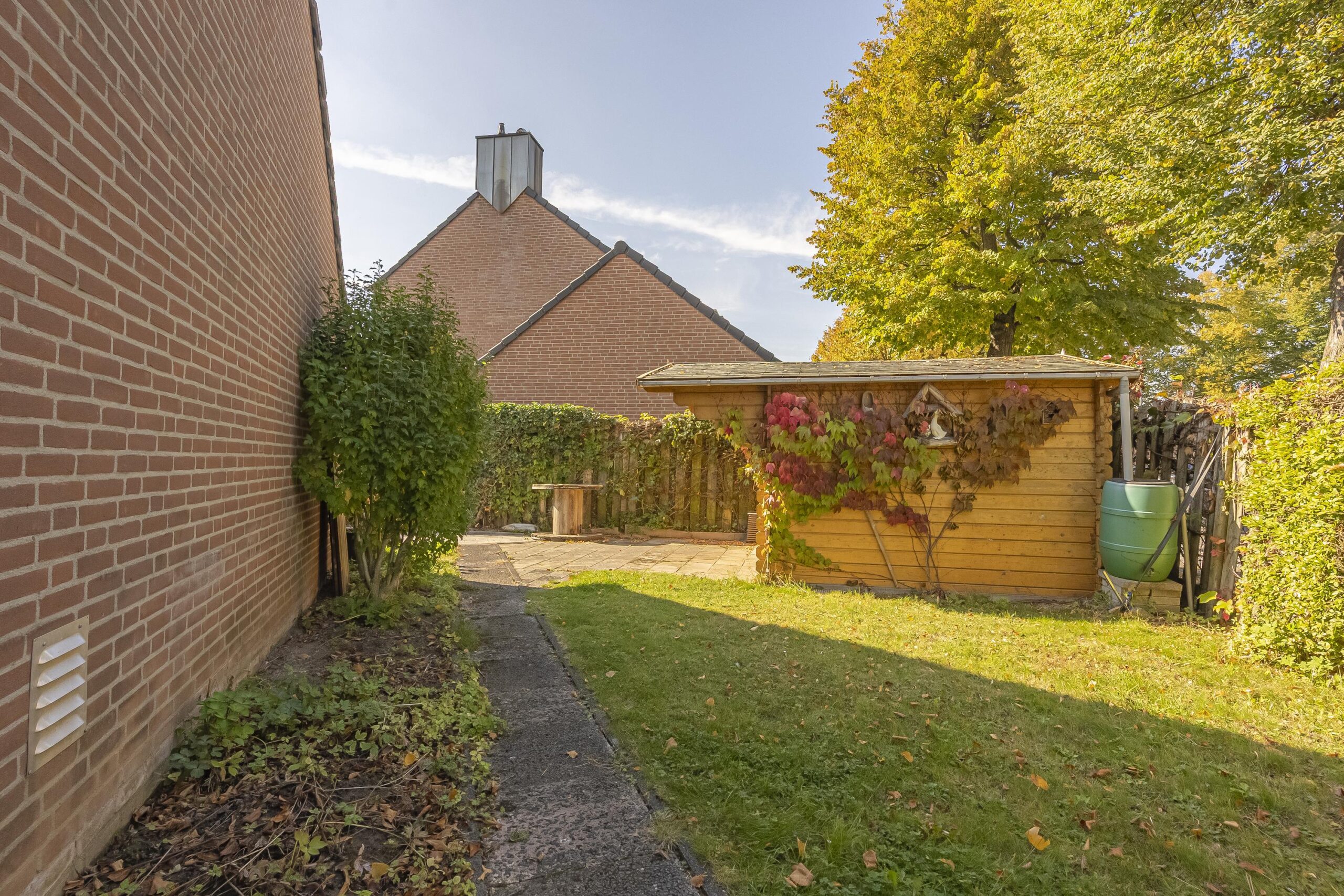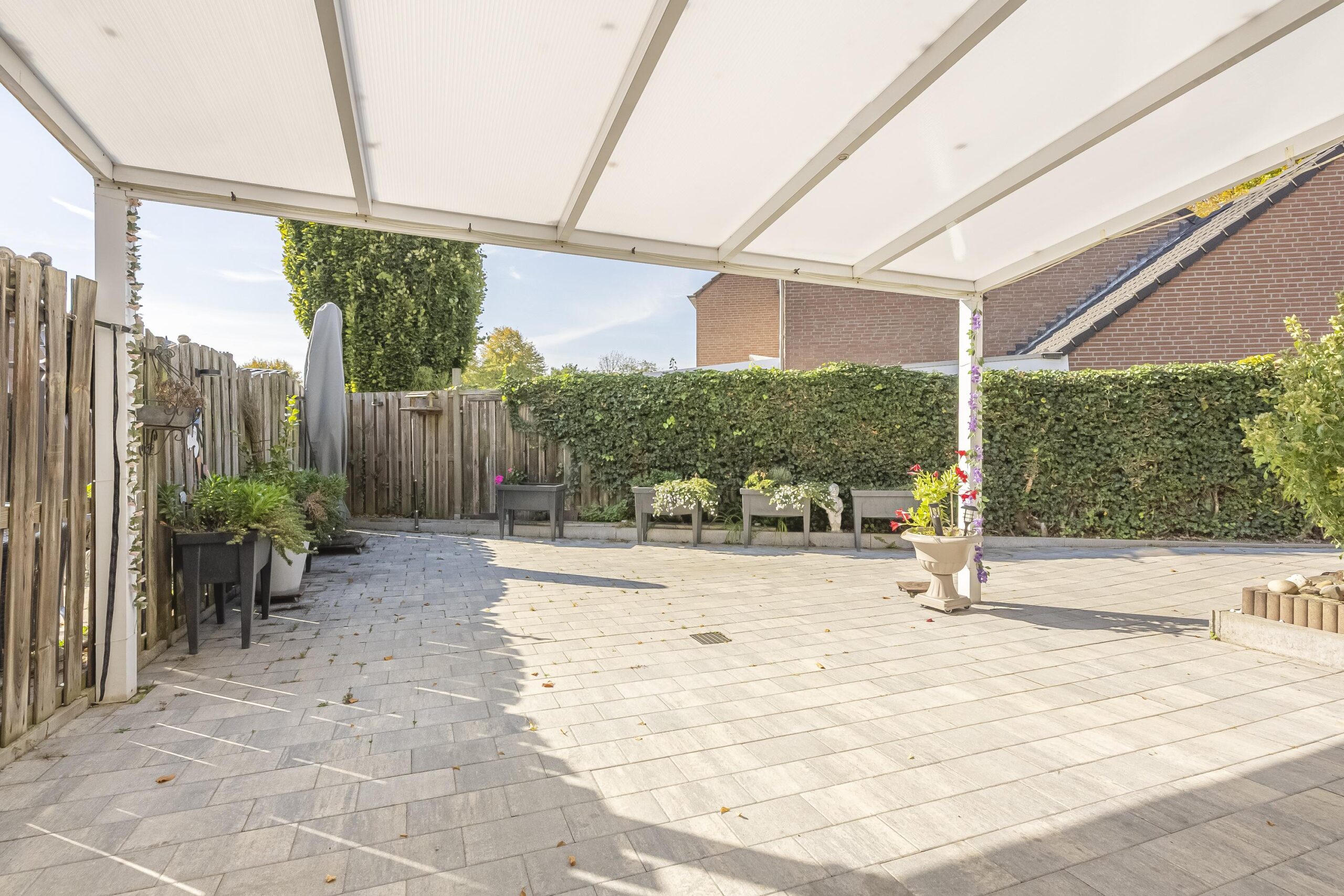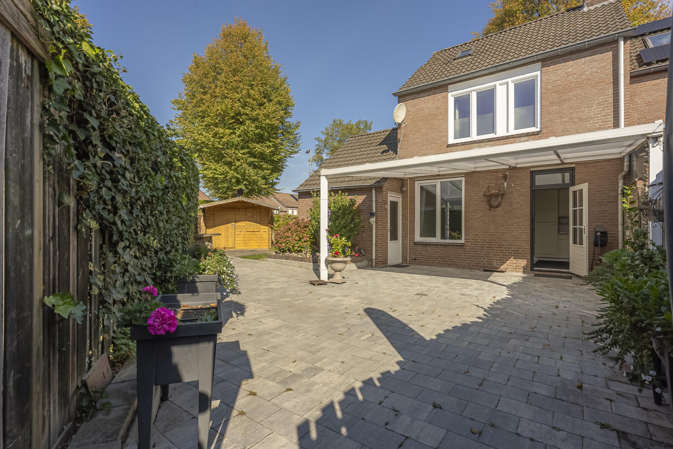 Vanuit hier is de tuin bereikbaar, die achter en naast de woning ligt, voorzien is van een terrasoverkapping en ingericht is met bestrating, gazon en een houten tuinhuis. De aangebouwde garage is droog onder de overkapping te bereiken , beschikt over een kantelpoort een een vliering voor extra opbergmogelijkheden.