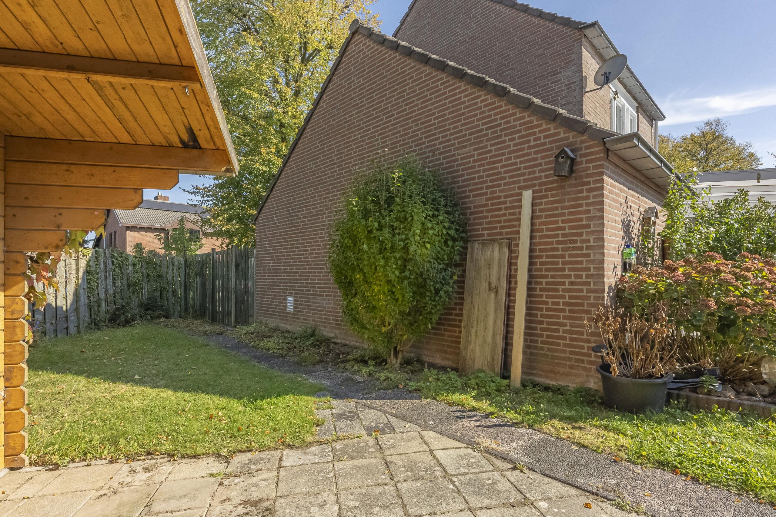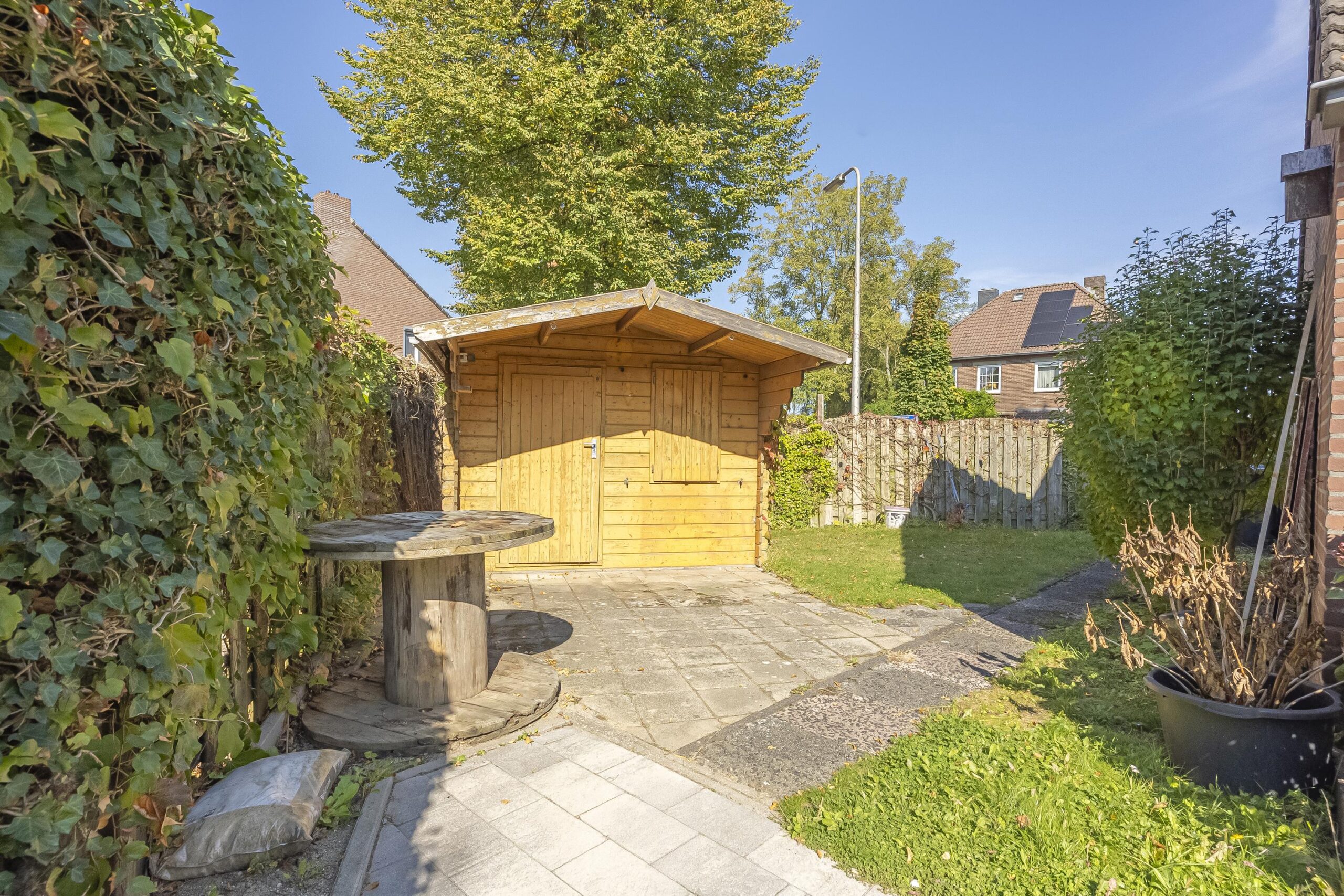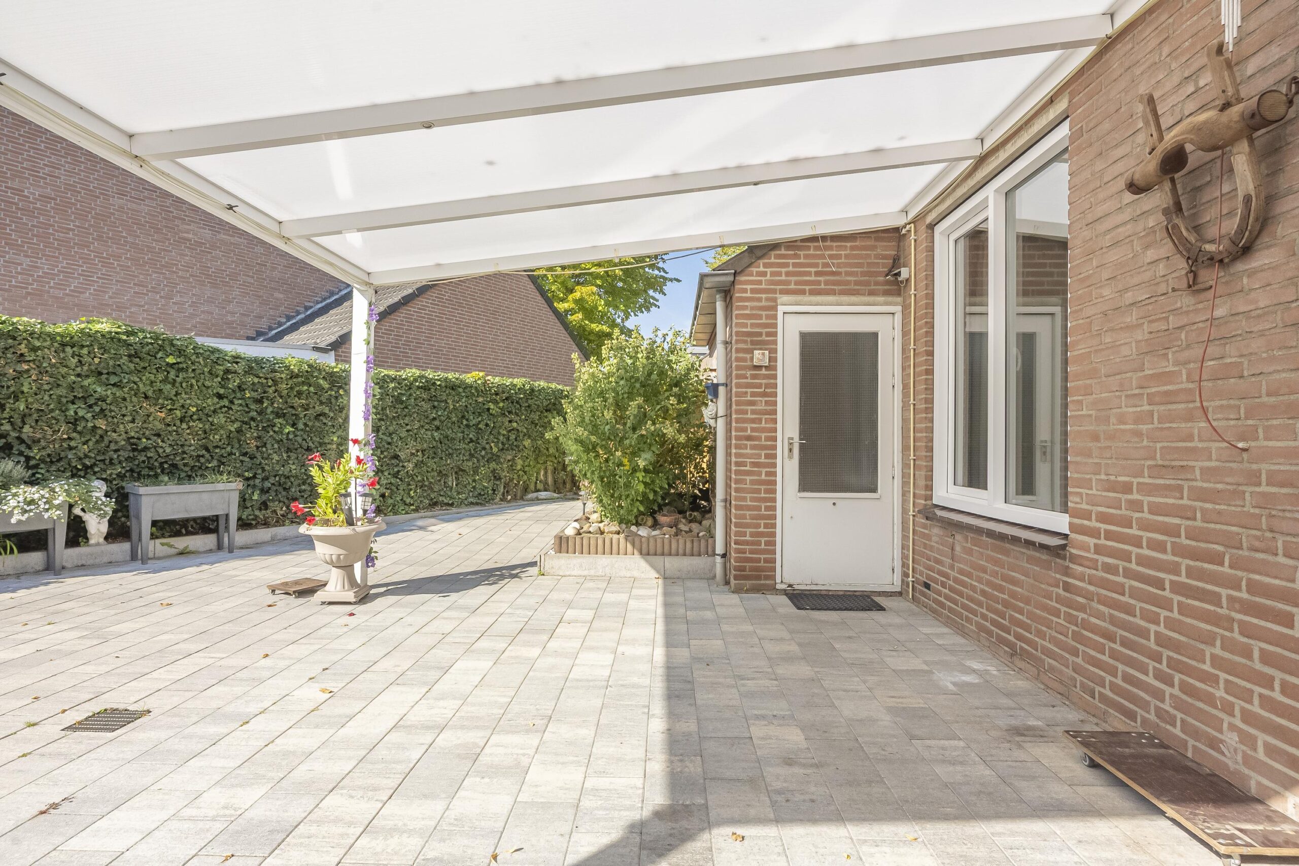 Vanuit hier is de tuin bereikbaar, die achter en naast de woning ligt, voorzien is van een terrasoverkapping en ingericht is met bestrating, gazon en een houten tuinhuis. De aangebouwde garage is droog onder de overkapping te bereiken , beschikt over een kantelpoort een een vliering voor extra opbergmogelijkheden.