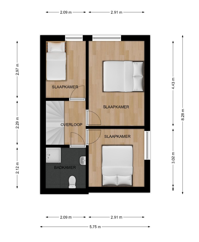 Eerste verdieping: overloop, drie slaapkamers, allen voorzien van een laminaatvloer, en de geheel betegelde badkamer met douche, badmeubel en 2e toilet.