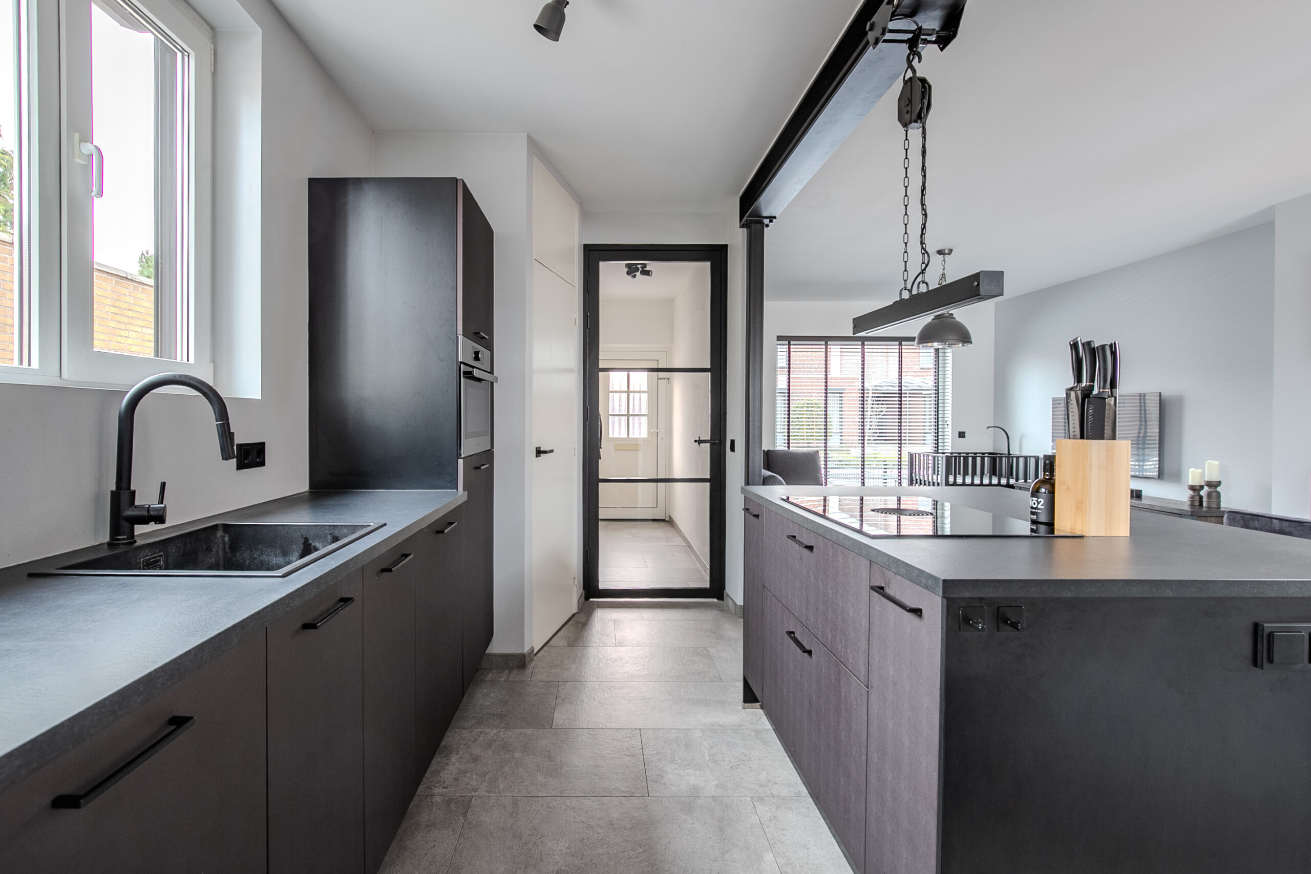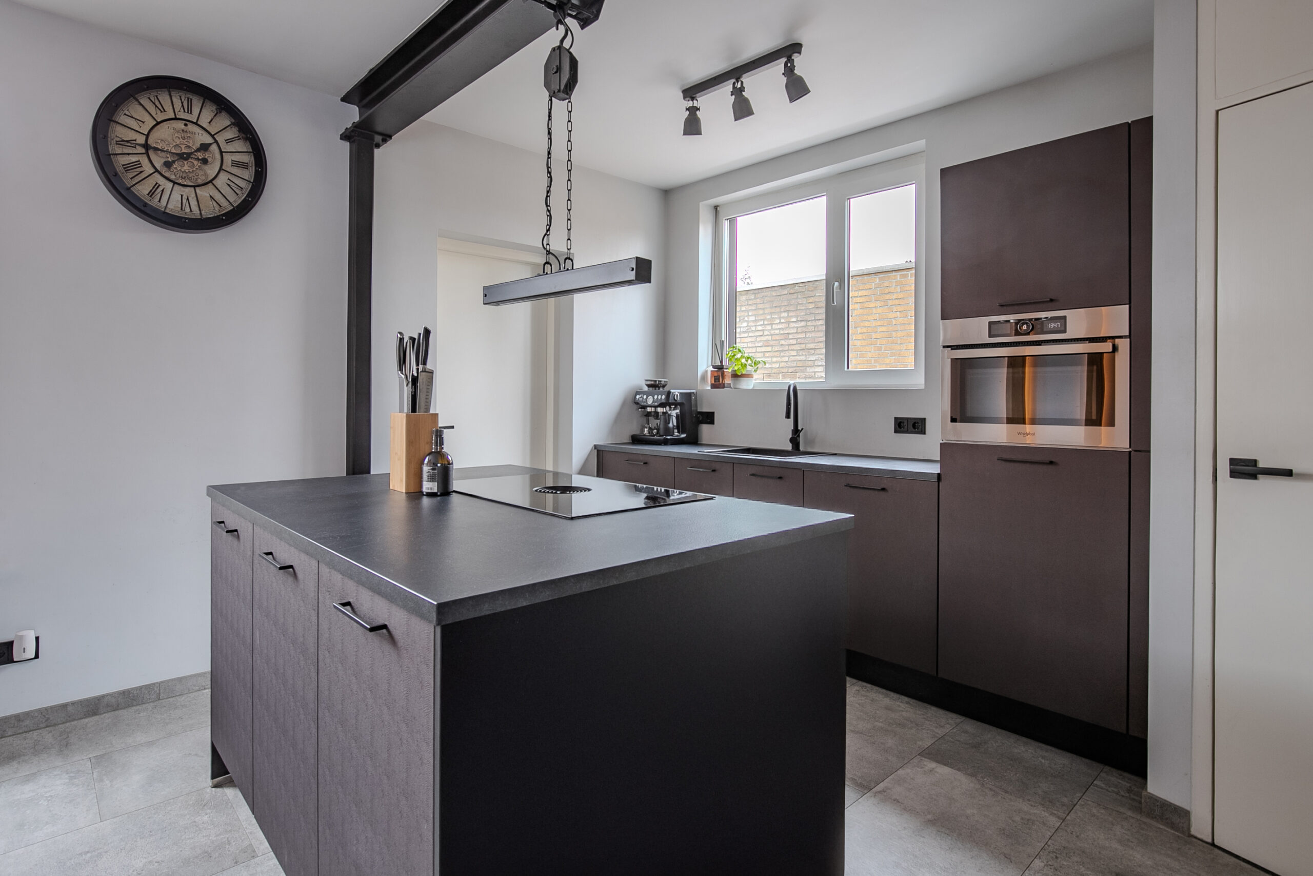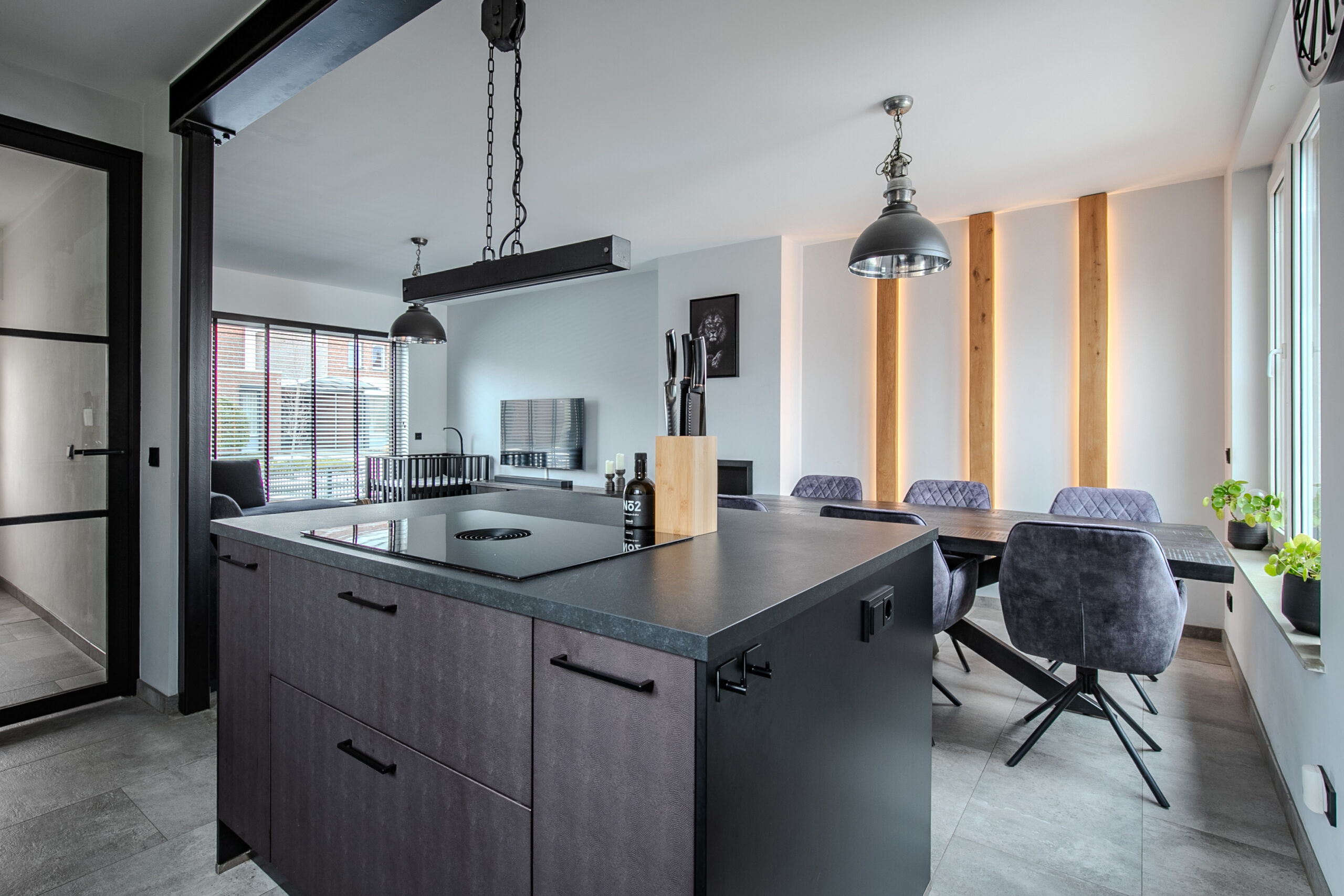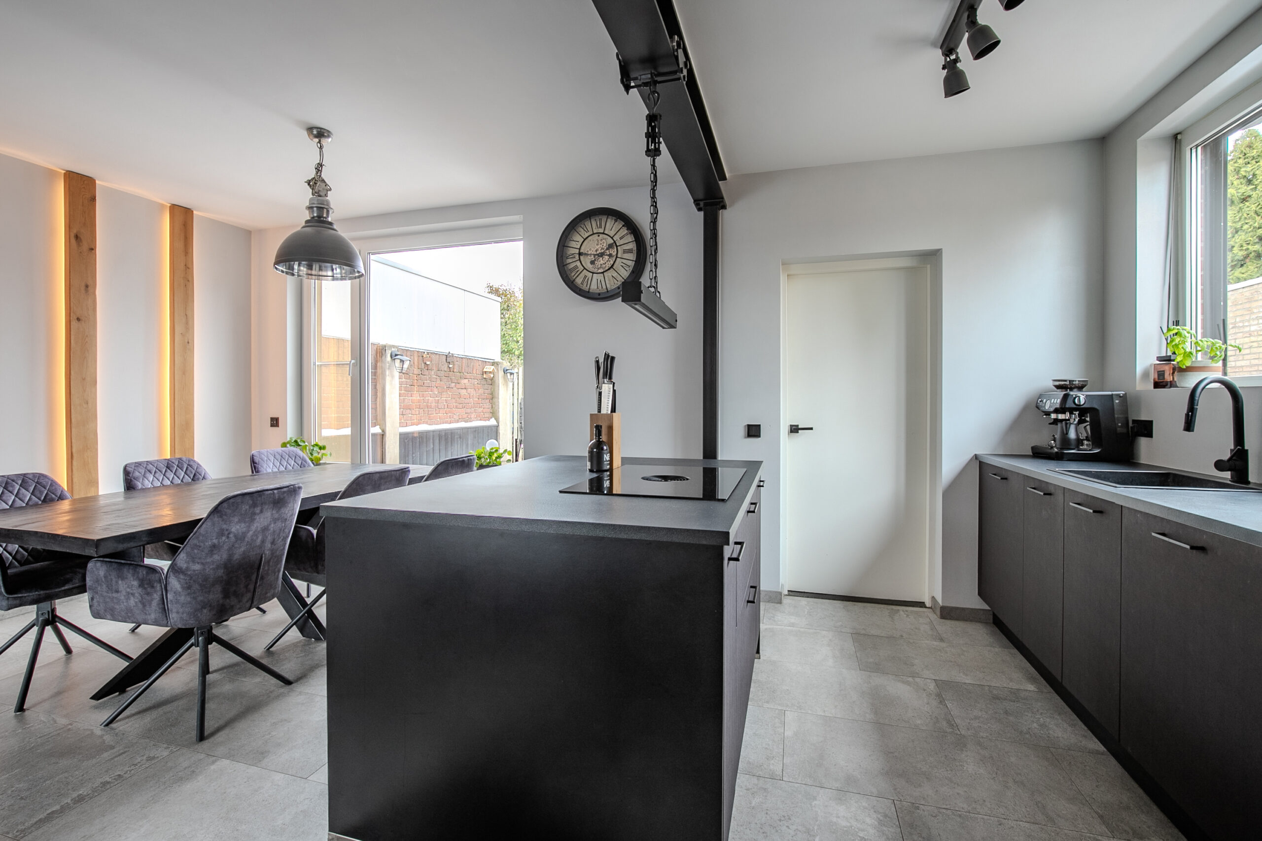 Vanuit de hal bereikt u via een glazen deur de open keuken. De moderne keuken heeft als eyecatcher een kookeiland met inductiekookplaat en geïntegreerde afzuiging. Verder is de keuken uitgerust met een combi-oven, koelkast, vaatwasser en spoelbak. De keuken staat in open verbinding met de eet- en woonkamer.