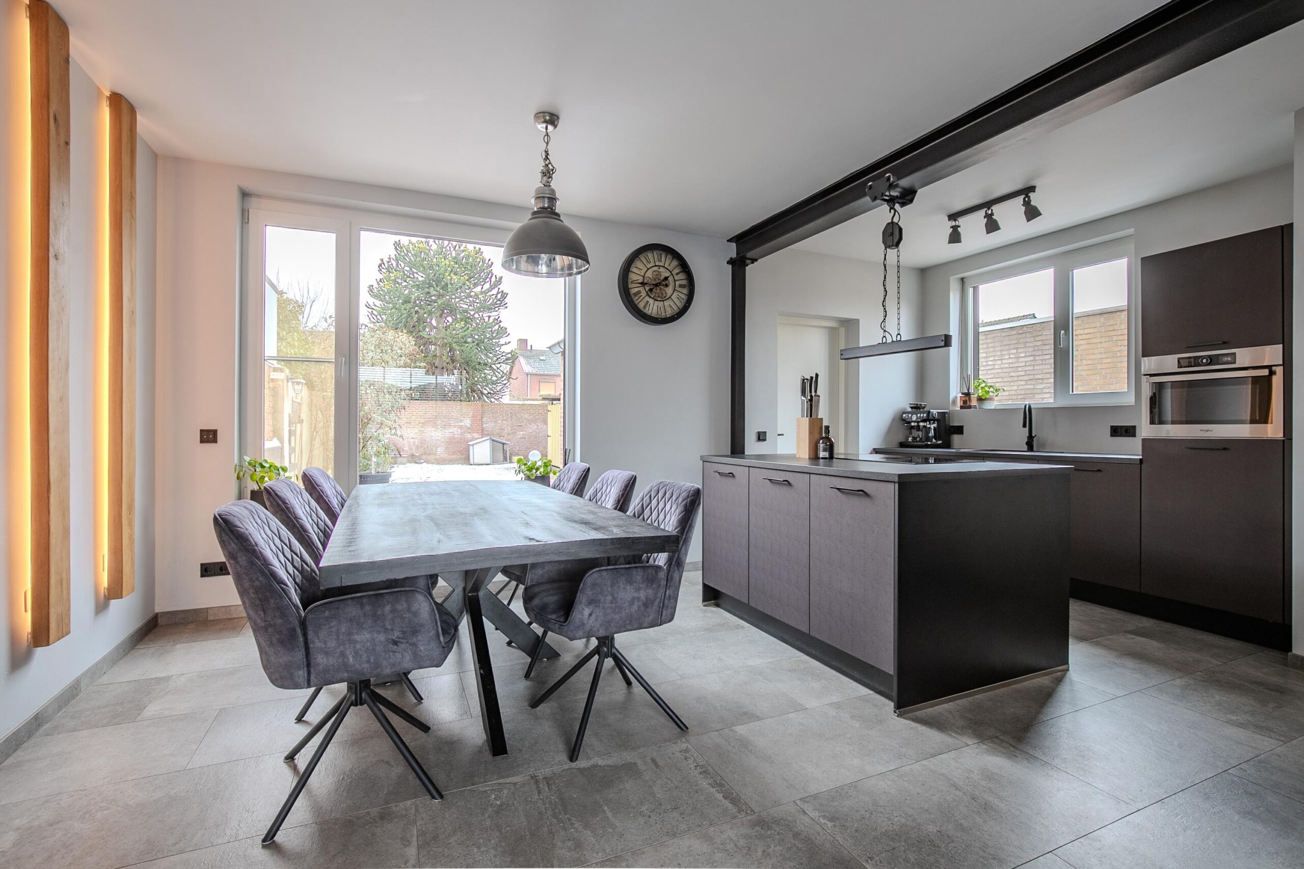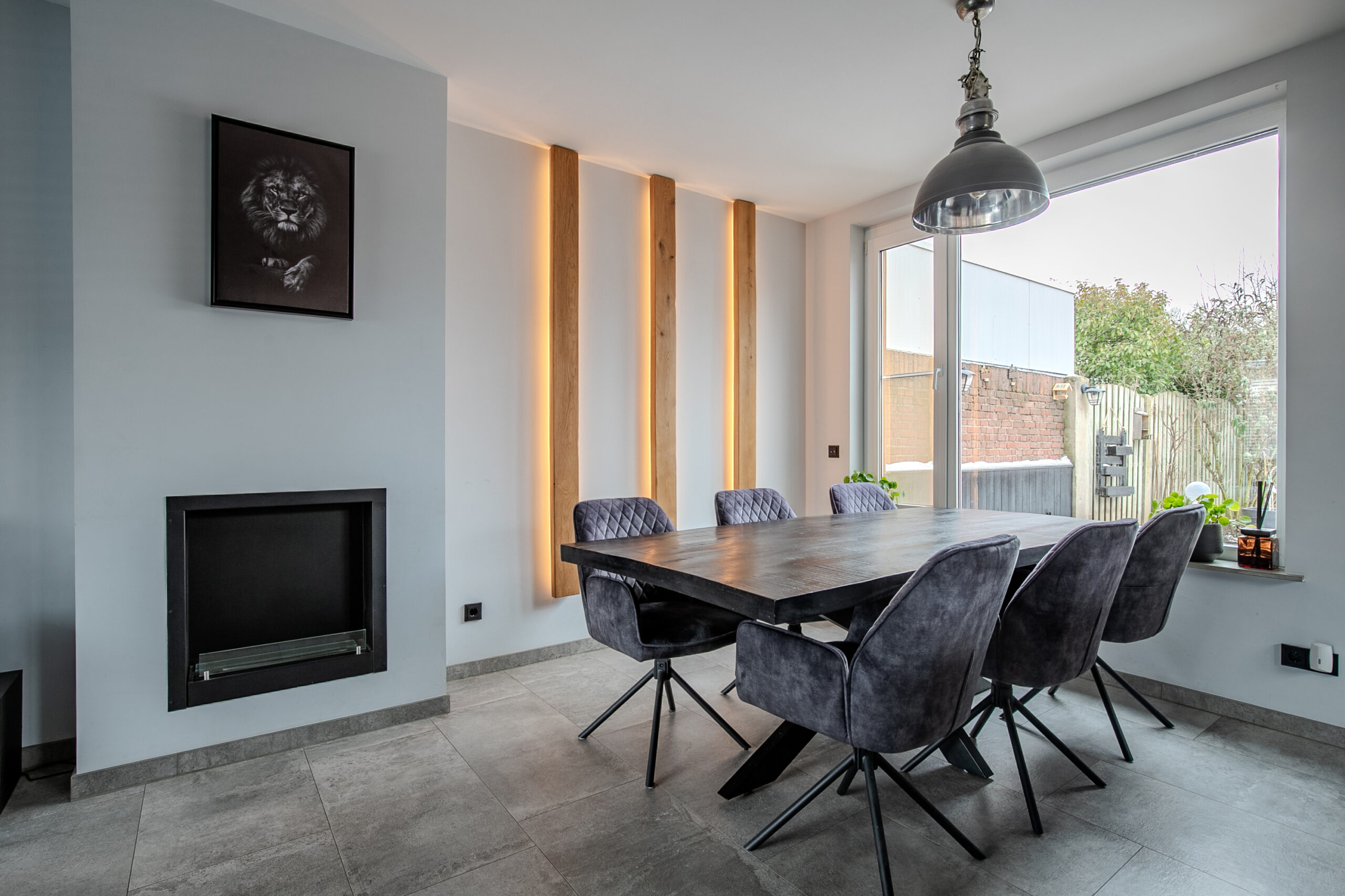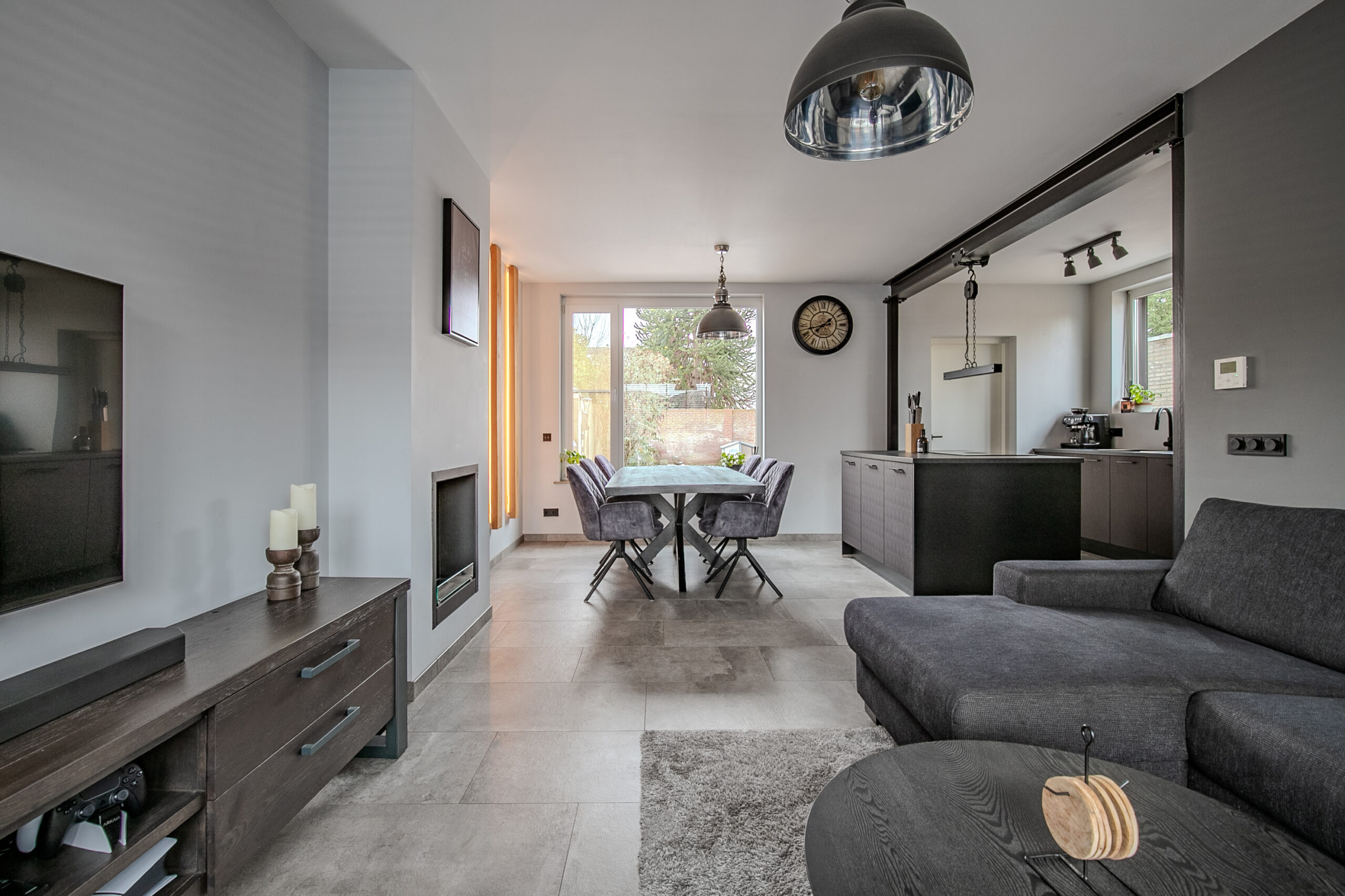 De eet- en woonkamer is licht en ruim dankzij grote raampartijen aan zowel de voor- als achterzijde. De haard vormt een sfeervol middelpunt en draagt bij aan het comfortabele en moderne karakter van de woning.