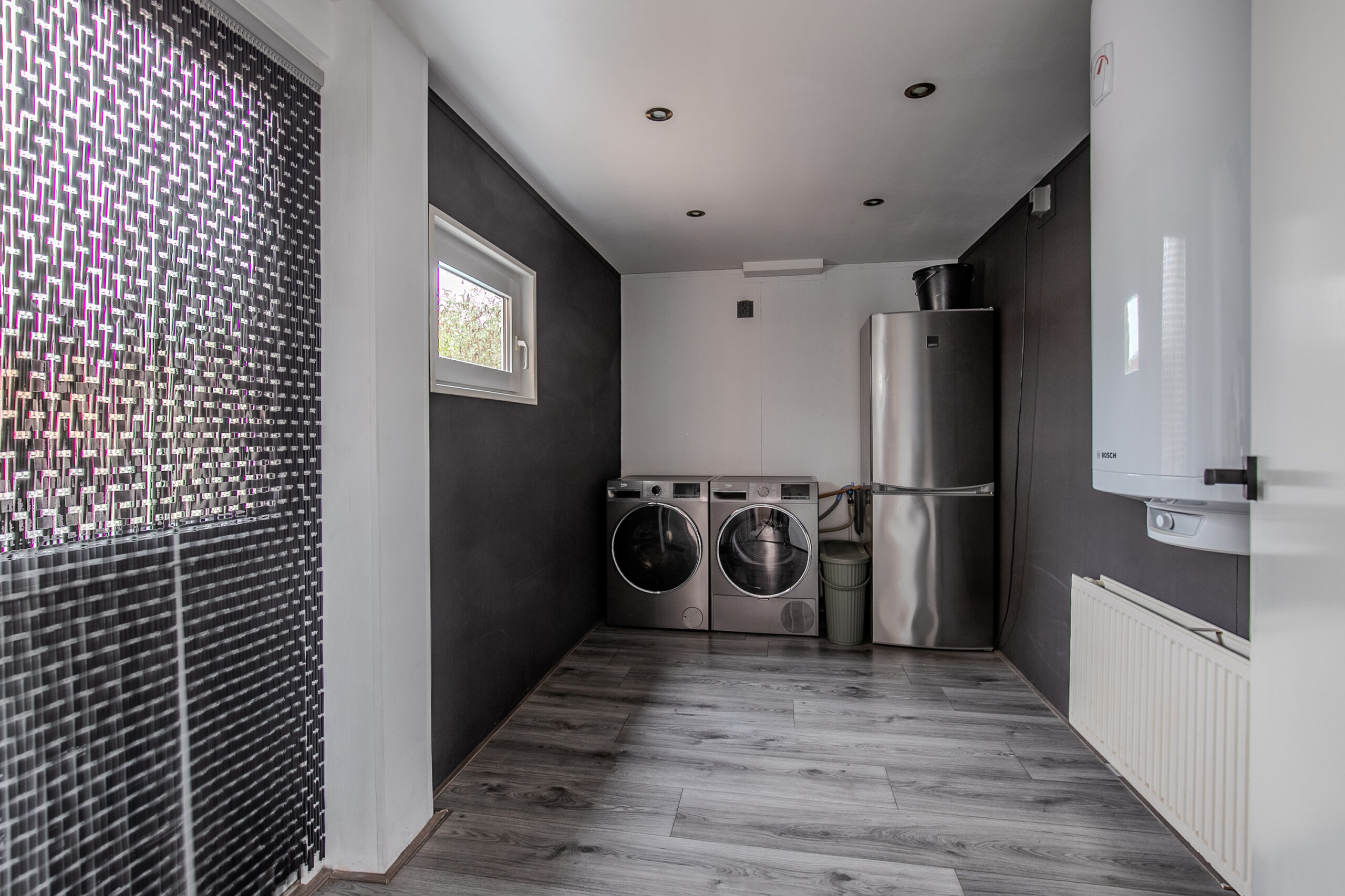Achter de keuken bevindt zich de praktische bijkeuken met witgoedaansluitingen, elektrische boiler, cv-installatie en veel bergruimte. Vanuit hier is er toegang tot de tuin. Naast de keuken ligt de trap naar de provisiekelder.