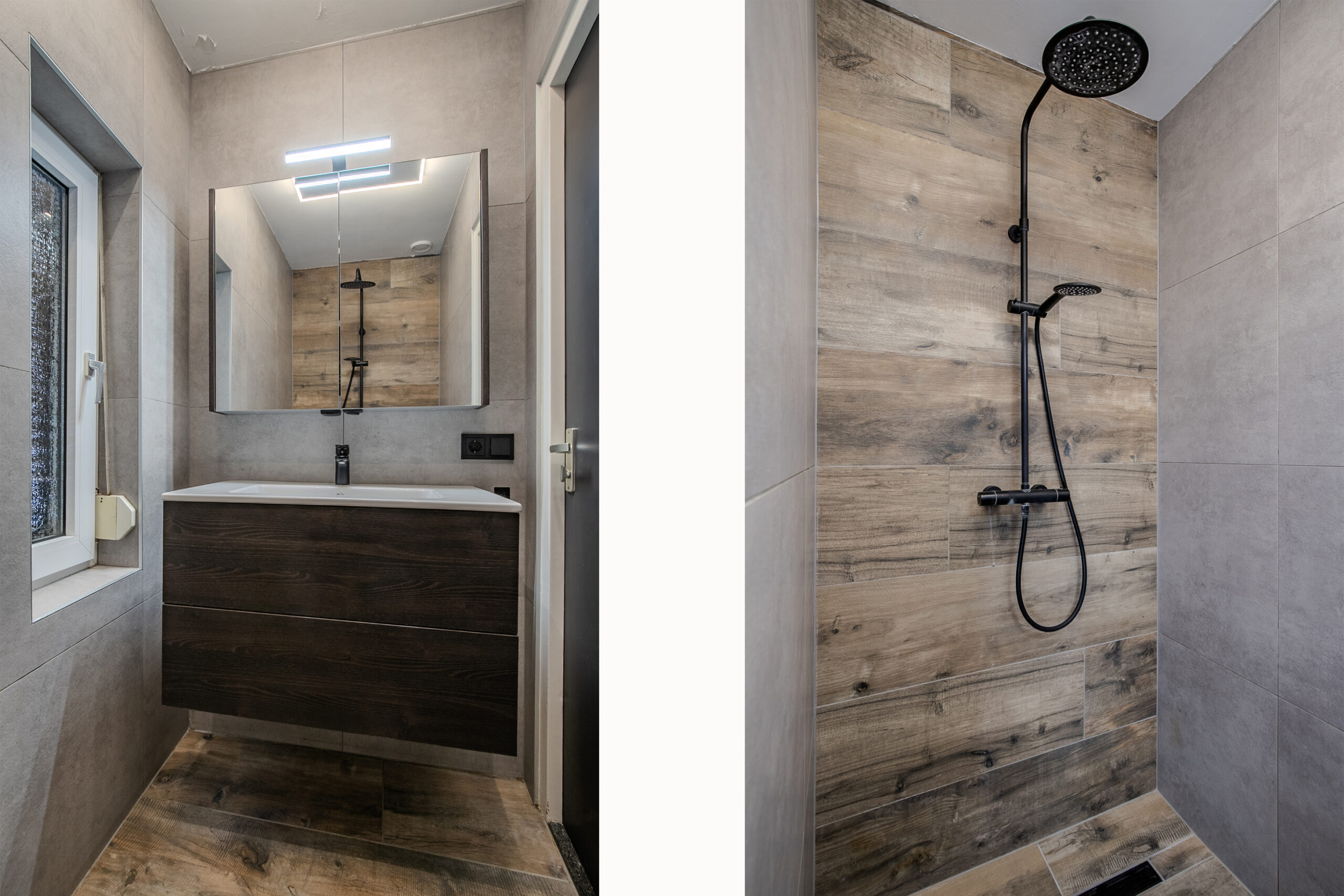 De badkamer is compact maar functioneel en voorzien van een inloopdouche en wastafel. Het toilet is separaat. Via een vlizotrap is de bergzolder bereikbaar.